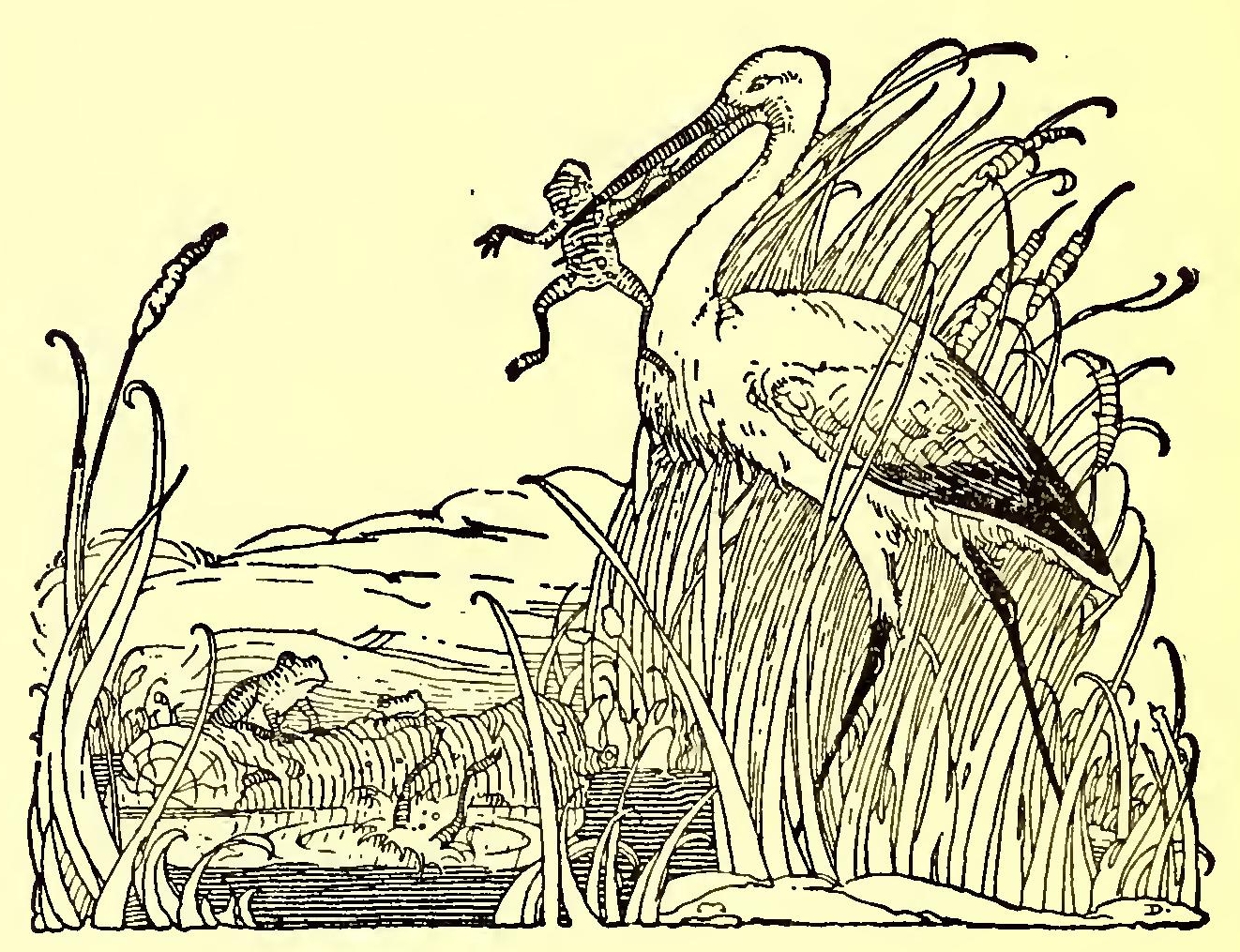 At this Jove was angry, and sent them a king of another sort. He sent them King Stork, and King Stork caught the Frogs, one by one, and ate them, till there was not one left.