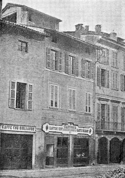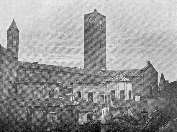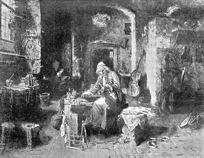 [Our illustration of Stradivari's atelier is from a painting by Rinaldi, the sketch for which was made on the premises. The church of St. Domenico, Cremona, was demolished some twenty years since and our illustration is from a photo taken just before the event. The Chapel of the Rosary, being the place where Antonio Stradivari was interred, is the one below and to the right of the tower and lighter in colour than the others.]
