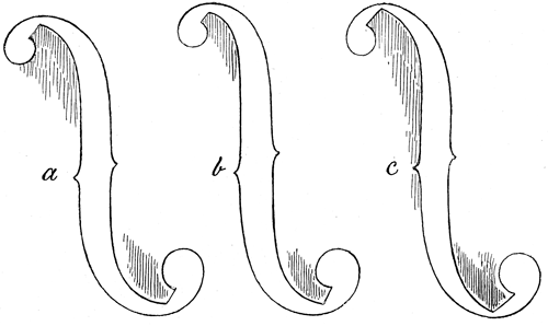 These worthies were forgetful of the fact that the different varieties of flat and high model, channelling[17] deep or none at all, long waists and short waists, sound holes long, short, near or wide apart, had been well, if not exhaustively treated by the artists of the Brescian school. To assume that those refined artificers, the Amati family and their disciples, were not conversant with everything for or against the use of a flat model would be crediting them with but little mental capacity, particularly in respect of their perceptive faculties. Both Stradivari and his teacher must have been well acquainted with the different high and low modelling of Gasparo da Salo, as well as that of his pupil Maggini, and others. He must have been aware that his own most generally used model of medium elevation, with slight exceptions both ways, was anticipated by each in turn. This, by the bye, disposes of any theory that Stradivari's distinctive quality of tone resulted, as is often stated, from his adopting a different elevation to what had been in use before. It may be fairly argued that if it had been true, as some writers have stated, that the flatter the model the better and stronger is the tone, then Stradivari would have been less gifted with sound judgment than he has been hitherto credited with; some of his early modellings, 1680-90, being as flat, if not more so, than any known during his whole career. For his selection of the particular degree of rise the reasons—for there were several—are not difficult to assign:—firstly, it was in consonance with his effort at achieving the most harmonious result—artistically in his designs; the less determined rise in the arching being more agreeable with the disposition of line in the pattern that he had been settling down to—posterity has emphatically endorsed his views in this respect; secondly, having noticed that a more shallow curve in the arching was quite favourable for the exhibition of gracefulness, while it was accompanied by more strength and permanency, with less liability during time and usage to develop a stony or bumpy appearance. But while thus looking acutely forward to future eventualities in one direction, Stradivari was no less careful[18] to avoid reducing his model too much. Knowing the soundpost would be certainly shifted occasionally, he saw in the very flat model a source of danger lurking in the difficulty of seeing and getting at the post, even with the usual appliances at the command of the professional repairer or regulator, while the sound holes would be much more liable to damage than when the sufficiently raised arching permits a fair use of the "post setter." He was also careful, while keeping the depth and width of the channelling within reasonable bounds, not to let the arching spring or commence too near the border, as the screw cramps of the repairer, especially the large sized ones used in olden times would, unless most skilfully and cautiously applied, soon register the progress of the repairer on the varnish to the destruction of the beauty of appearance as a whole. These, then, appear to be the cogent reasons for the adoption of the medium rise in the modelling by Stradivari.