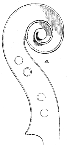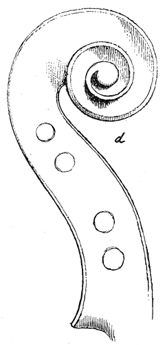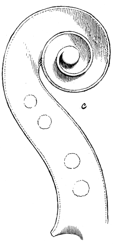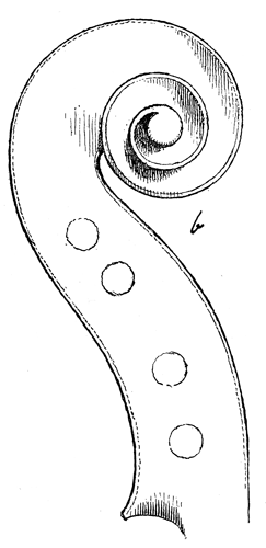 Of the parts the young assistant of Nicolas Amati was allowed to put his individuality to, conspicuously stands the scroll. The one typical of Nicolas's later days, although free and elegant, yet had a somewhat heavier touch about it, possibly the master was gradually losing his muscular power, more necessary to exert in this matter of detail than any other. Stradivari began his own type by bringing the first turn from the axis or "eye" a little higher up than that of his master; the axis itself is a trifle larger and flatter, the edges of the turns are squared off with a machine-like exactness that does not interfere with the ease and flow of line. The peg box is strong and ample, after a few years it became massive, more so occasionally than is to be met with at any other time, the grooves down the back are not so deep, the termination or shell likewise and a little wider.