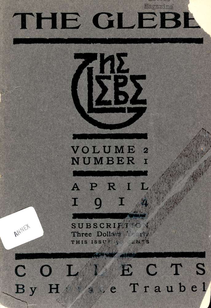 The only editorial policy of THE GLEBE is that embodied in its declaration of absolute freedom of expression, which makes for a range broad enough to include every temperament from the most radical to the most conservative, the only requisite being that the work should have unmistakable merit. Each issue will be devoted exclusively to one individual thereby giving him an opportunity to present his work in sufficient bulk to make it possible for the reader to obtain a much more comprehensive grasp of his personality than is afforded him in the restricted spaces allotted by the other magazines. Published monthly, THE GLEBE will issue twelve books per year, chosen on their merits alone, since the subscription list does away with the need of catering to the popular demand that confronts every publisher. Thus, THE GLEBE can promise the best work of American and foreign authors, known and unknown.