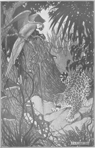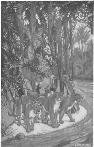 And so it was. Soon the she-panther came down roaring through the bushes to rescue her husband. She looked across to the island where the man was lying wounded; and then at her mate, who lay there panting at her feet; and then down into the water, which was black with rays.