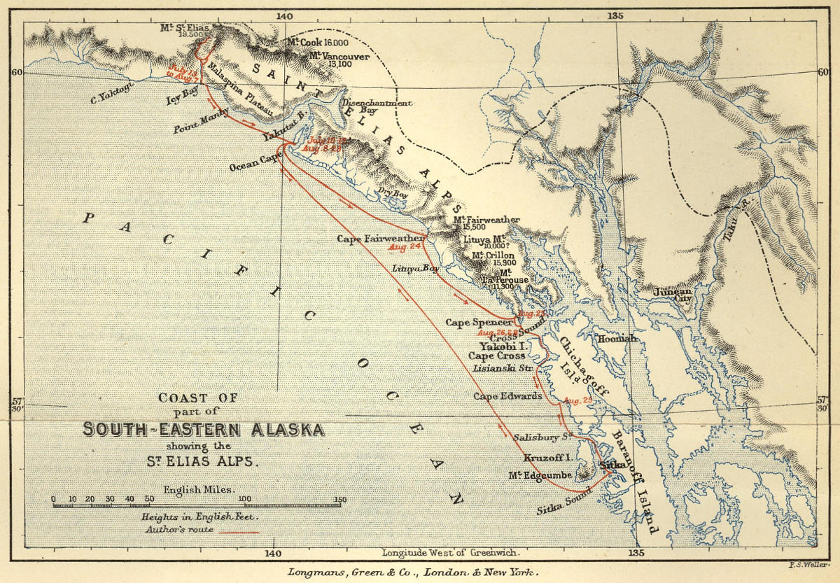 On the twenty-fifth of April, 1888, I was playing golf on our little links at home, and had driven off for the Stile Hole, situated on the lawn-tennis ground, when I observed the butler emerge from the house with an orange envelope in his hand, and come towards me across the lawn. Having with due deliberation played a neat approach shot over the railings on to the green, I climbed over after it, putted out the hole, and then went to meet him. The telegram proved to be from my friend Harold T., with whom at Saas in the previous summer I had discussed Seton-Karr’s book on Alaska, and we had both come to the[2] conclusion that we should much like to go there. Finding that I should have the summer of ’88 at my disposal, I had written to him at the end of March to ask about his plans and now got this telegram in reply. It was sent from Victoria, B.C., and was an urgent appeal to join him and his brother at once, as they meant to make an attempt on Mount St. Elias that summer, and must start northward by the end of May. I retired to the smoking-room to consider the situation, and finally came to the conclusion that such a hurried departure might be managed.