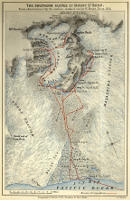 Saturday, the 14th.—The morning was spent in sorting and arranging the stores. With the object of remaining as long as possible in the vicinity of the mountain, we four agreed to carry our own properties, so that the men might be free to carry more food, and soon came to the conclusion that we must leave our rifles at the beach. W. and E. tried to take one between them, but left it at the first cache. We saw a green humming-bird flashing along the shore, and another had been observed at Yakutat. In the afternoon we all sallied forth to explore the neighbourhood; H. and Ed. went along the beach, which was covered with bear-tracks, for some four miles to the first outlet of the river, re-christened by Lieutenant Schwatka with the euphonious name of Jones, and Ed. returned considerably impressed with the walking powers of our gallant captain. E. and Shorty penetrated with great difficulty for some distance along the banks of the river, which ran[45] into the sea close to camp. I took the shot-gun and started with W. and Lyons along the beach, but I soon separated from them, and went on the shore-side of the lagoons, where I hoped to find duck. In this I was disappointed, but I shot a large sandpiper and a couple of ring-necked plover. On the sandhills of the beach were the largest wild strawberries I ever saw, some fully as big as a shilling, while the supply was utterly inexhaustible. It came on to pour in torrents, and we all returned soaked through, and quite undecided as to our future route. All that night the rain descended in a deluge, and, driven by a fierce east wind, even succeeded in penetrating our excellent green tent which had stood so well on Mount Edgcumbe.