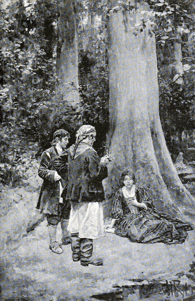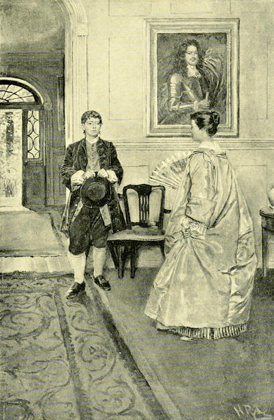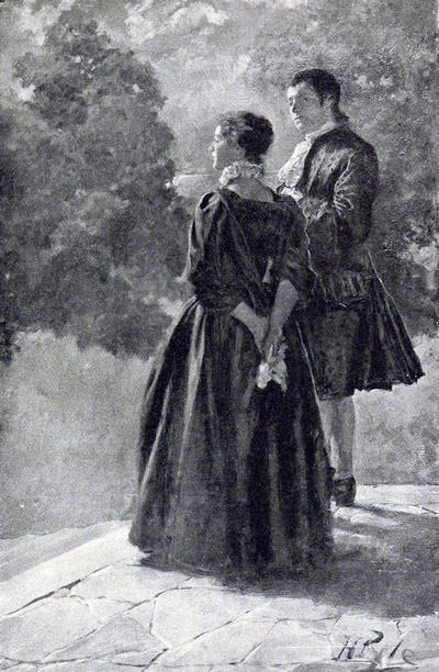 After Jack had finished reading the letter he sat thinking a long time. Would he ever go back to Virginia again? As he sat there, he felt a sudden longing for it—its warm wildness, its pine woods, its wide stretches of inland waters—and while the feeling was strong within him, he sat down and wrote to her. “It is all very fine here”—he said, “a great, grand house, with a wide park of trees, and a lawn with terraces and stone steps, and a great garden all laid out in patterns and scrolls, with box bushes and hedges trimmed into shapes of peacocks and round balls and what not.” And so on in a page or so of description. “My uncle is as kind as ever he can be, only—I will tell you this in secret—he will drink too much wine at dinner, and then sometimes is cross. Well, he is a dear, good, kind man, and almost like a father to me. My Aunt Diana is kind to me, too, and my cousins—dear, good, sweet girls—do all they can to make me happy. Yet I always think of Virginia, and more than all else, when I am thinking of it, do I think of one who stood with me at the window the last day I was there, and wish I were there to see her again. Ay, sometimes I would give all I have in the world if I could only be back again.” It was a great pleasure for him to write this, and as he wrote it his heart warmed and thrilled again. “Indeed,[416] I did look for you that morning I went away,” he wrote, “for I hoped to say good-by to you again when there was no one by to hear me say it. But you did not come, and I went away so sad and broken-hearted that I could almost have cried. I was so sad that I would have given all the world to be back again.