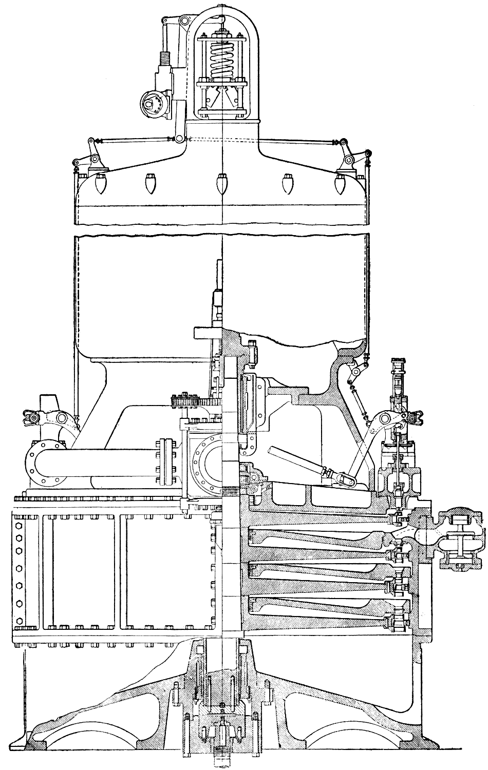 The speed of the machine is controlled by the automatic opening and closing of the admission valves under the control of a governor (Fig. 19), of the spring-weighted type attached directly to the top end of the turbine shaft. The action of the governor depends on the balance of force exerted by the spring, and the centrifugal effort of the rectangular-shaped weights at the lower end; the moving weights acting through the knife-edge suspension tend to pull down the lever against the resistance of the heavy helical spring. The governor is provided with an auxiliary spring on the outside of the governor dome for varying the speed [28]while synchronizing. The tension of the auxiliary spring is regulated by a small motor wired to the switchboard. This spring should be used only to correct slight changes in speed. Any marked change should be corrected by the use of the large hexagonal nut in the upper plate of the governor frame. This nut is screwed down to increase the speed, and upward to decrease it.