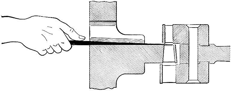 While the machine is running it is imperative that there be no rubbing contact between the revolving and stationary parts, and this is provided for by the clearance between the rows of moving buckets and the intermediates. Into each stage of the machine a 2-inch pipe hole is drilled and tapped. Sometimes this [16]opening is made directly opposite a row of moving buckets as in Fig. 10, and sometimes it is made opposite the intermediate. When opposite a row of buckets, it will allow one to see the amount of clearance between the buckets and the intermediates, and between the buckets and the nozzles. When drilled opposite the intermediates, the clearance is shown top and bottom between the buckets and intermediates. (See Fig. 11.) This clearance is not the same in all stages, but is greatest in the fourth stage and least in the first. The clearances in each stage are nearly as follows: First stage, 0.060 to 0.080; second stage, 0.080 to 0.100; third stage, 0.080 to 0.100; fourth stage, 0.080 to 0.200. These clearances are measured by what are called clearance gages, which are simply taper slips of steel about 1/2-inch wide accurately ground and graduated, like a jeweler's ring gage, by marks about 1/2-inch apart; the difference in thickness of the gage is one-thousandth of an inch from one mark to the next.