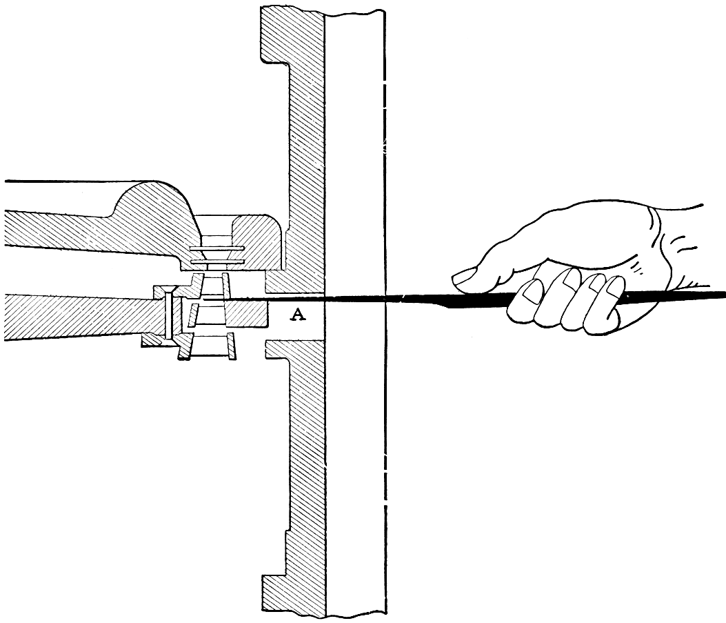 The rods which connect the governor with the valve-gear have ordinary brass ends or heads and are adjusted by right-and-left threads and secured by lock-nuts. They are free fits on the pins which pass through the heads, and no friction is likely to occur which will interfere with the regulation, but too close work on the shield-plate bushings, or a slight warping of the steam chest, will often produce friction which will seriously impair the regulation. If it is noticed that the shield-plate shaft has any tendency to oscillate in unison with the rock-shaft which carries the pawls, it is a sure indication that the shield-plates are not as [36]free as they should be, and should be attended to. The governor-rod should be disconnected, the pawls thrown out and the pawl strings hooked over the ends.