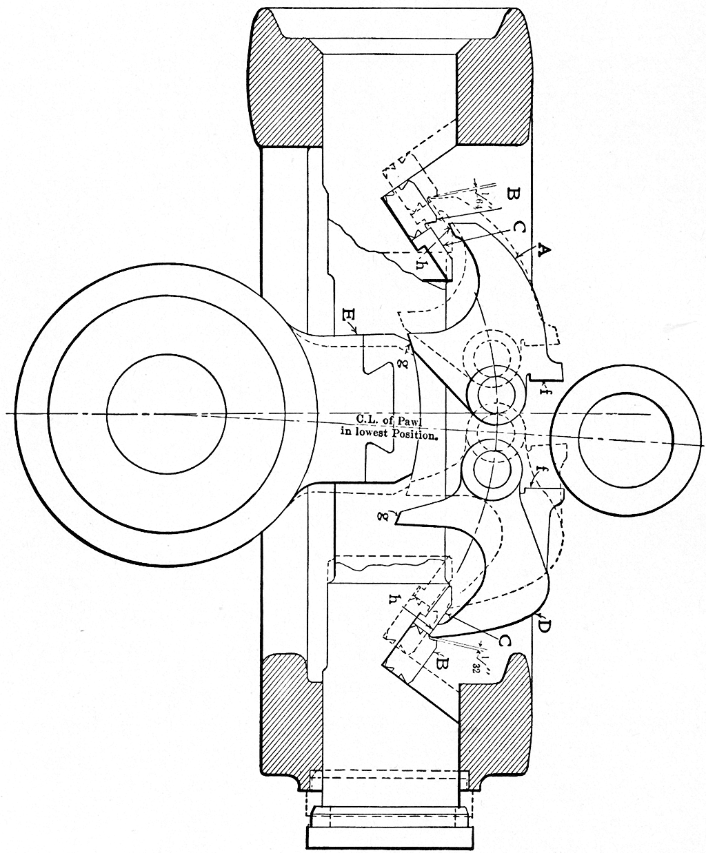 In setting the valves we should first "throw out" all pawls to avoid breakage in case the rods are not already [33]of proper length, holding the pawls out by slipping the ends of the pawl springs over the points of the pawls, as seen in Fig. 21. Then turn the machine slowly by hand until the pawls on one set of valves are at their highest point of travel, then with the valves wide open adjust the drive-rods, i.e., the rods extending from the crank to the rock-shaft, so that there is 1/32 of an inch clearance (shown dotted in Fig. 17, Chap. I) at the point of opening of the pawls when they are "in." (See Fig. 22.) Then set up the check-nuts on the drive-rod. Turn the machine slowly, until the pawls are at their lowest point of travel. Then, with the valves closed, adjust each valve-stem to give 1/32 of an inch clearance at the point of closing of the pawls when they are "in," securely locking the check-nut as each valve is set. Repeat this operation on the other side of the machine and we are ready to [34] adjust the governor-rods. (Valves cannot be set on both sides of the machine at the same time, as the pawls will not be in the same relative position, due to the angularity of the drive-rods.)