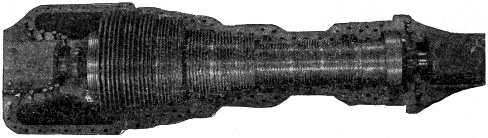 The water which goes to the step-bearing passes through a baffler, the latest type of which is shown by [37]Fig. 23. It is a device for restricting the flow of water or oil to the step- and guide-bearing. The amount of water necessary to float the machine and lubricate the guide-bearing having been determined by calculation and experiment, the plug is set at that point which will give the desired flow. The plug is a square-threaded worm, the length of which and the distance which it enters the barrel of the baffler determining the amount of flow. The greater the number of turns which the water must pass through in the worm the less will flow against the step-pressure.