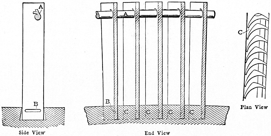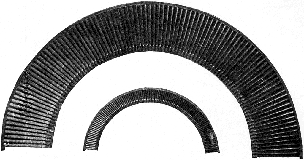 Referring back to Fig. 11, at A is shown one of the peep-holes opposite the intermediate in the third stage wheel for the inspection of clearance. The taper clearance gage is inserted through this hole both above and below the intermediate, and the distance which it enters registers the clearance on that side. This sketch also shows plainly how the shrouding on the buckets and the intermediates extends beyond the sharp edges of the buckets, protecting them from damage in case of slight rubbing. In a very few cases [19]wheels have been known to warp to such an extent from causes that were not discovered until too late, that adjustment would not stop the rubbing. In such cases the shrouding has been turned or faced off by a cutting-off tool used through the peep-hole.