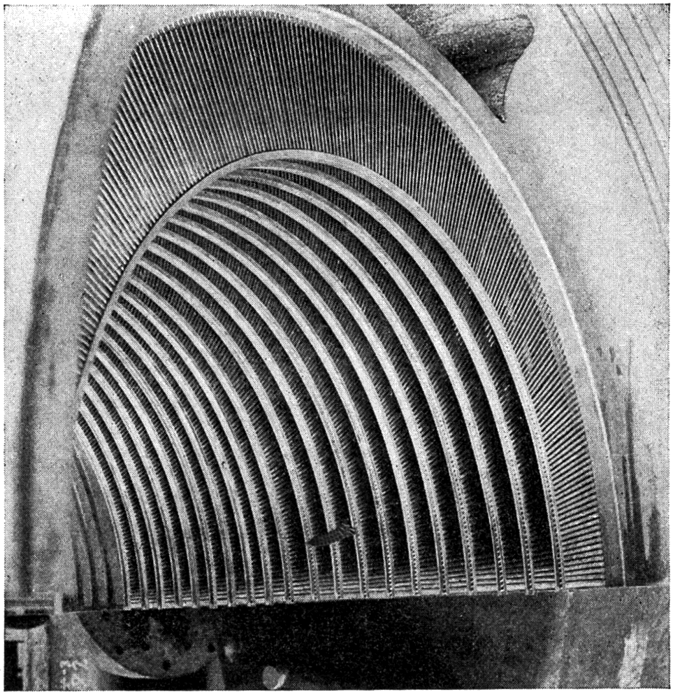 The expanding nozzles and moving buckets constantly increase in size and number from the top [15]toward the bottom. This is because the steam volume increases progressively from the admission to the exhaust and the entire expansion is carried out in the separate sets of nozzles, very much as if it were one continuous nozzle; but with this difference, not all of the energy is taken out of the steam in any one set of nozzles. The idea is to keep the velocity of the steam in each stage as nearly constant as possible. The nozzles in the diaphragms and the intermediates do not, except in the lowest stage, take up the entire circumference, but are proportioned to the progressive expansion of steam as it descends toward the condenser.
