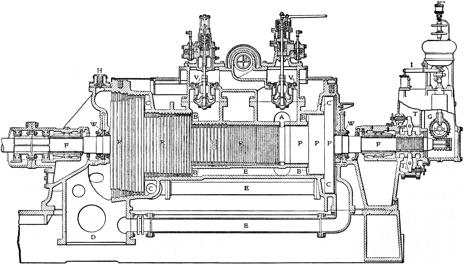 We will consider what is known as the "mechanical" valve-gear, with two sets of valves, one set of five valves being located on each side of the machine.