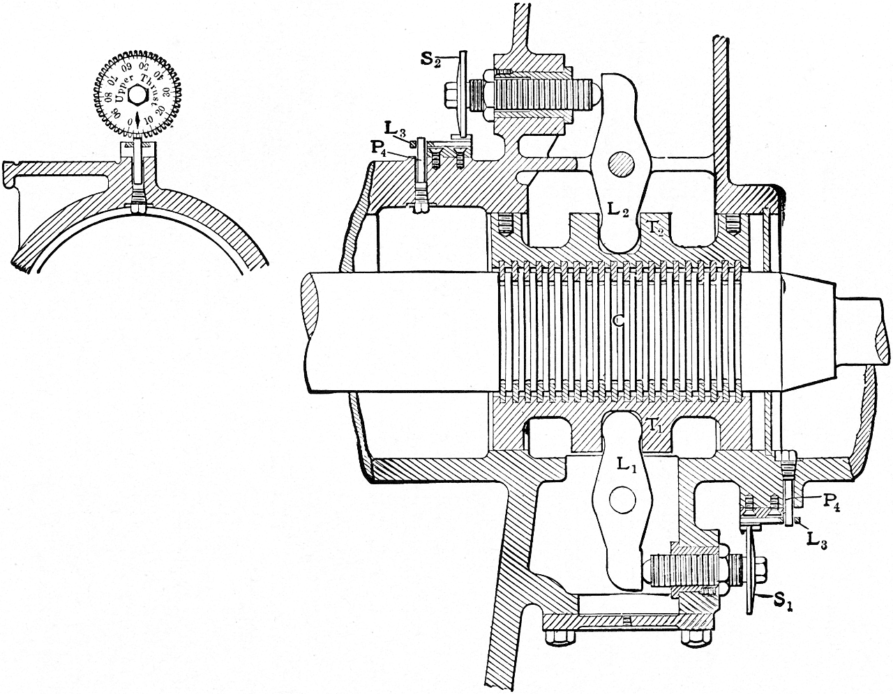 The carbon ring shown in Fig. 12 is the older design. The segments are held against the flat bearing surface of the case by spiral springs set in brass ferrules. The circle is held together by a bronze strap screwed and [22] drawn together at the ends by springs. Still other springs press the straps against the surface upon which the carbon bears, cutting off leaks through joints and across horizontal surfaces of the carbon. The whole ring is prevented from turning by a connecting-rod which engages a pin in the hole, like those provided for the springs.