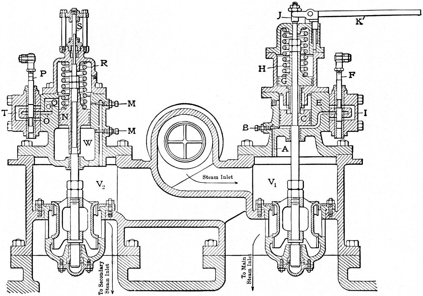 Fig. 20 represents one of the several designs of stage valve, sometimes called the overload valve, the office of which is to prevent too high pressure in the first stage in case of a sudden overload, and to [29]transfer a part of the steam to a special set of expanding nozzles over the second-stage wheel. This valve is balanced by a spring of adjustable tension, and is, or can be, set to open and close within a very small predetermined range of first-stage pressure. The valve is intended to open and close instantly, and to supply or cut off steam from the second stage, without affecting the speed regulation or economy of [30]operation. If any leaking occurs past the valve it is taken care of by a drip-pipe to the third stage.
