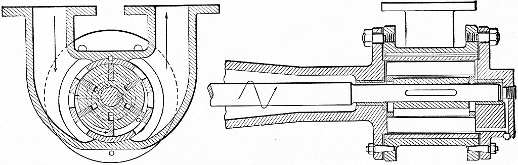 Fig. 8 shows an elevation and part-sectional view of a 1500-kilowatt Curtis steam turbine. If one should go into the exhaust base of one of these turbines, all that could be seen would be the under side of the [14] lower or fourth-stage wheel, with a few threaded holes for the balancing plugs which are sometimes used. The internal arrangement is clearly indicated by the illustration, Fig. 8. It will be noticed that each of the four wheels has an upper and a lower row of buckets and that there is a set of stationary buckets for each wheel between the two rows of moving buckets. These stationary buckets are called intermediates, and are counterparts of the moving buckets. Their sole office is to redirect the steam which has passed through the upper buckets into the lower ones at the proper angle.