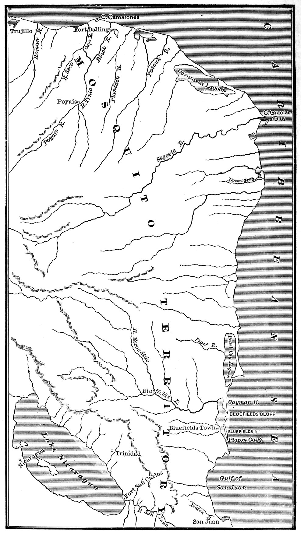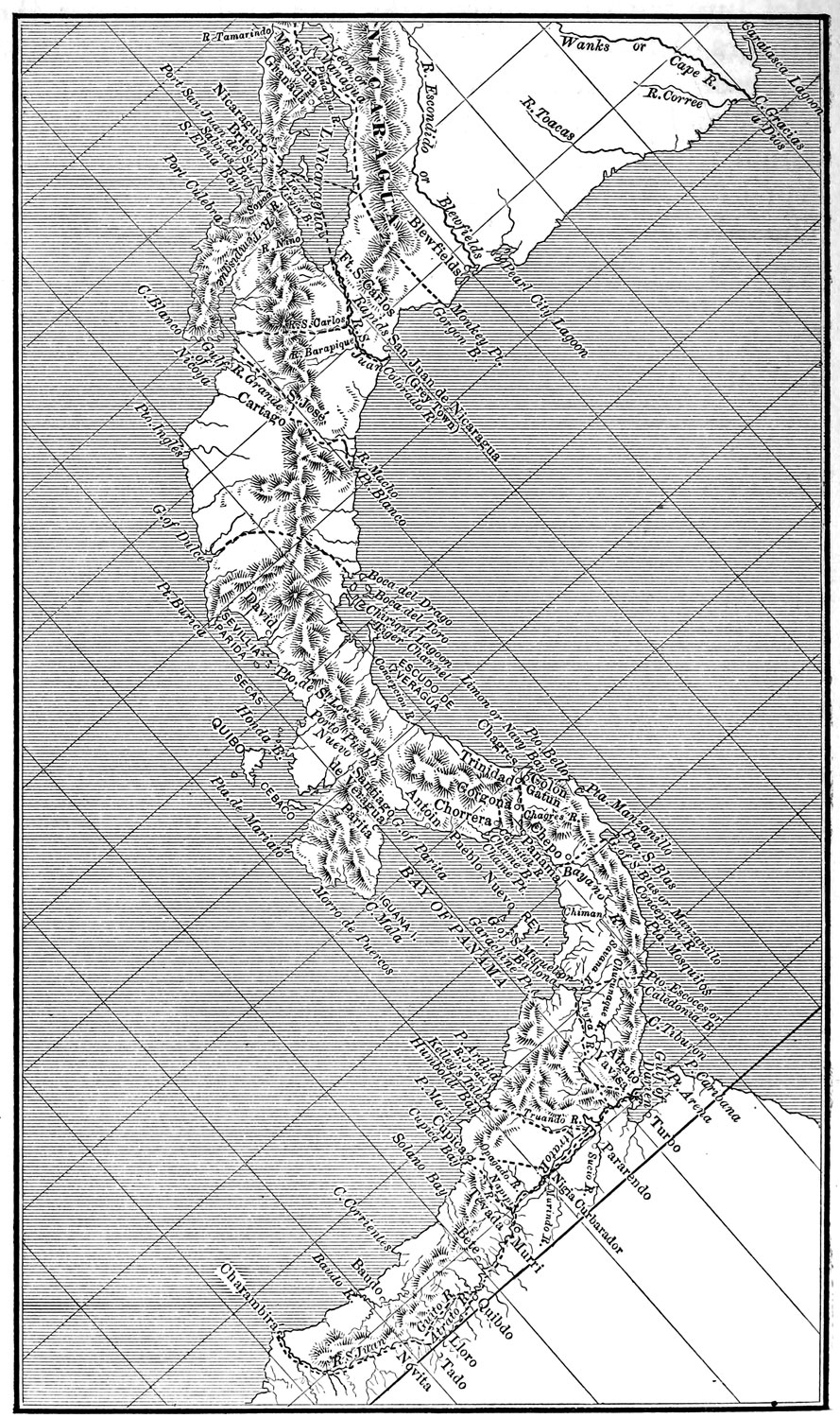 Thanks to the far-seeing and indefatigable hydrographer to the admiralty, Admiral Sir Francis Beaufort, the British surveys have included much of the coasts of Central America, and they are now placed in relatively correct positions on our latest maps. Having therefore exact coast-lines, or boundaries, we can avail ourselves more readily of much Spanish interior detail; but it is exceedingly difficult to get at the original works.