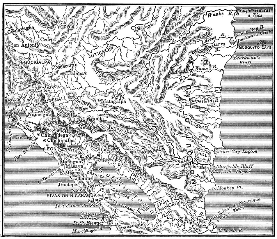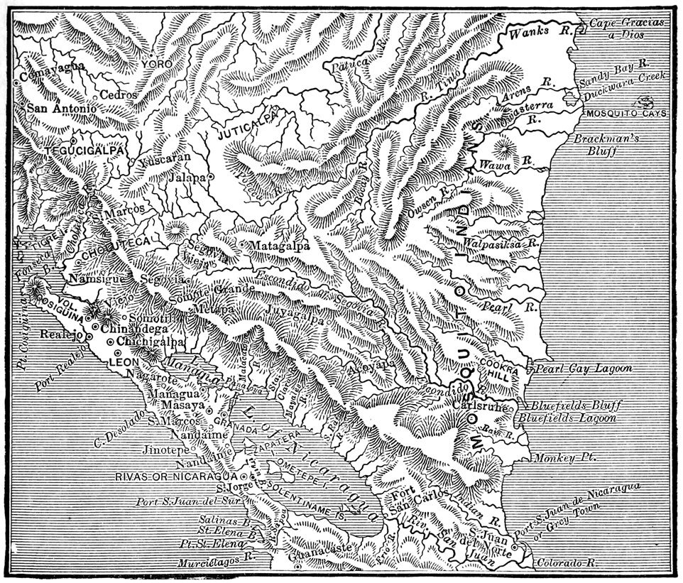 | State Government—Director Buitrago's Conservatism—British Aggression—Director Sandoval's Rule—Internal Troubles—Guerrero's Administration—The Mosquito Kingdom—Its Origin and History—Bubbles—British Pretensions—Seizure of San Juan del Norte—Diplomatic Complications—Clayton-Bulwer Treaty—Nicaragua Recovers her Own—Relations with Foreign Powers—An American War Ship Bombards San Juan del Norte—Pineda's Government—Establishment of the Republic—Party Dissensions—Legitimists versus Democrats—Chamorro and Castellon—Civil War—Death of Chamorro—Estrada Succeeds Him | 238 |