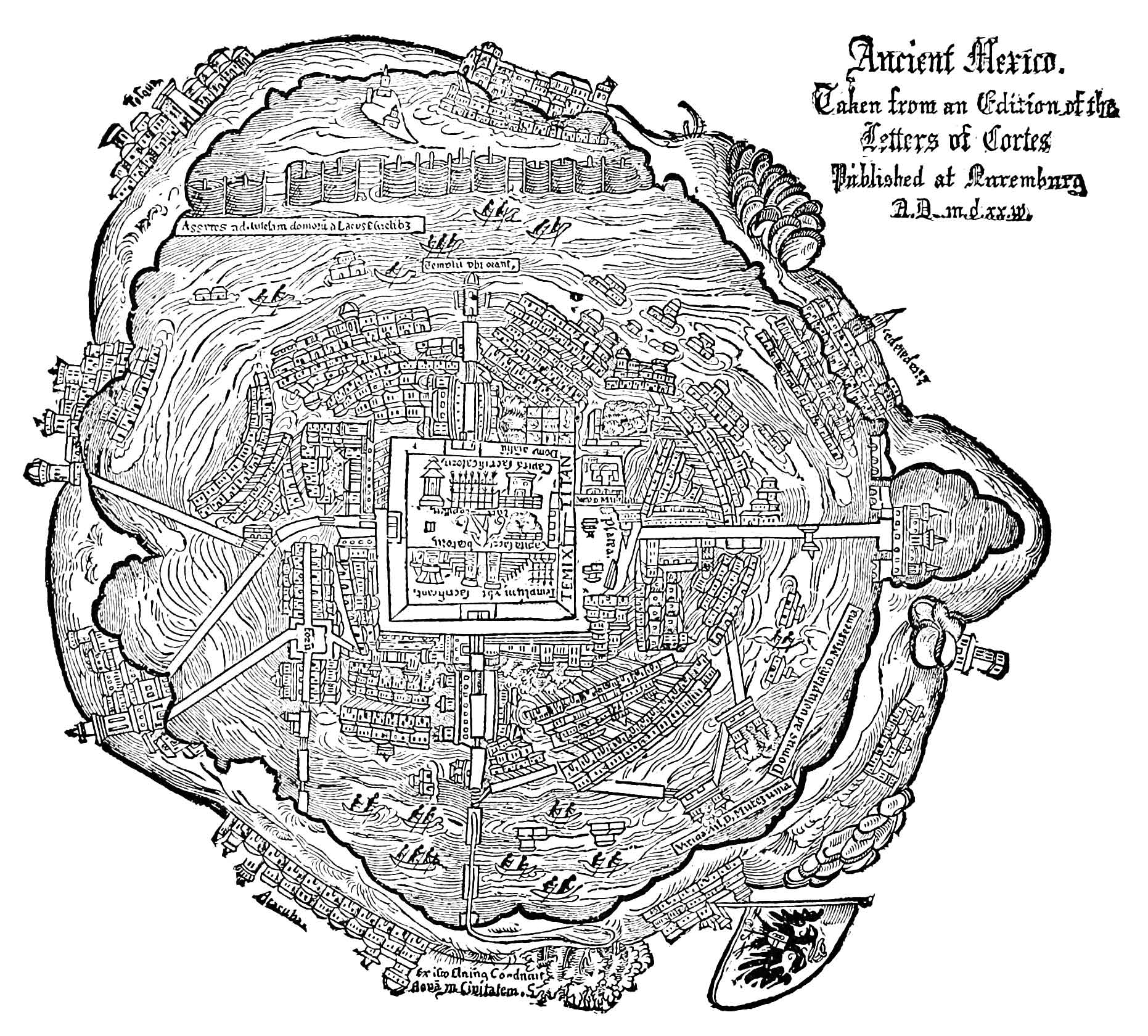 By the night cruisers and the Chinampanecs, supplies were nearly all cut off, and gaunt hunger began to stalk the streets of the fated capital. The ravages of the fleet and the flotilla along the eastern suburbs had rendered these wholly untenable, and the south-eastern district had been desolated by Cortés’ divisions, compelling the inhabitants to abandon the greater part of Tenochtitlan and concentrate chiefly in Tlatelulco. These two main divisions of the city had been rivals ever since its foundation, with frequent disputes to sustain the flame of discord. Gradually the Tenochtitlans had assumed the sway, honored by imperial presence, while the other division had assumed a plebeian stamp, patronized by the former. During this common misfortune, however, rivalry was forgotten, and the more warlike Tlatelulcans unhesitatingly aided the others and now welcomed them into their quarter.[1153]