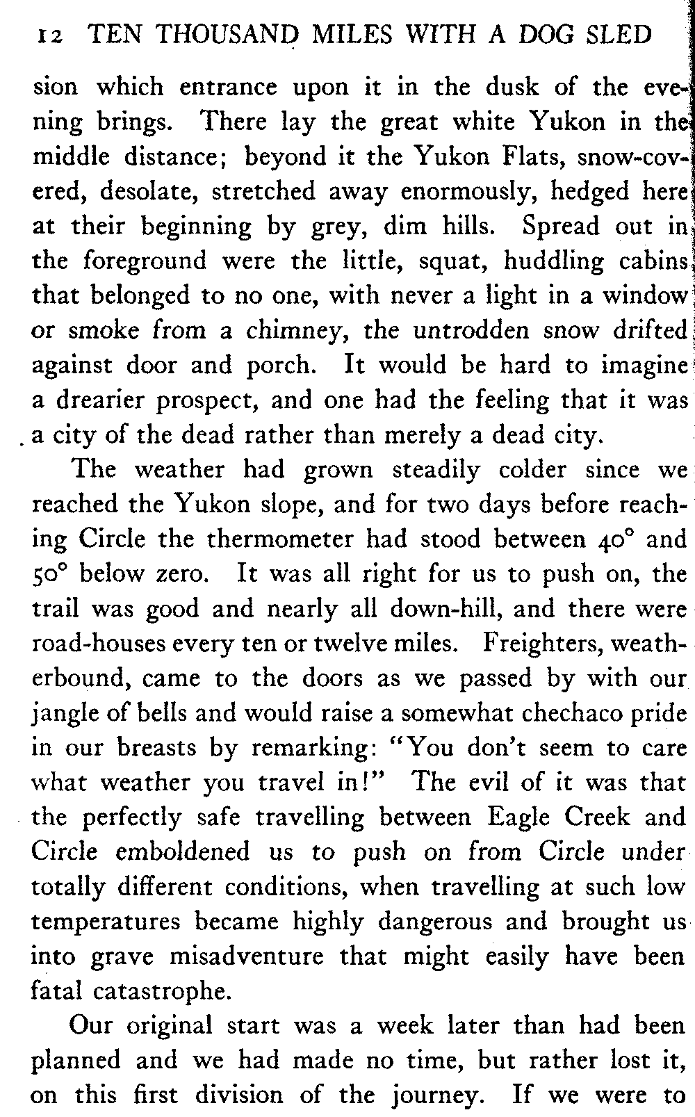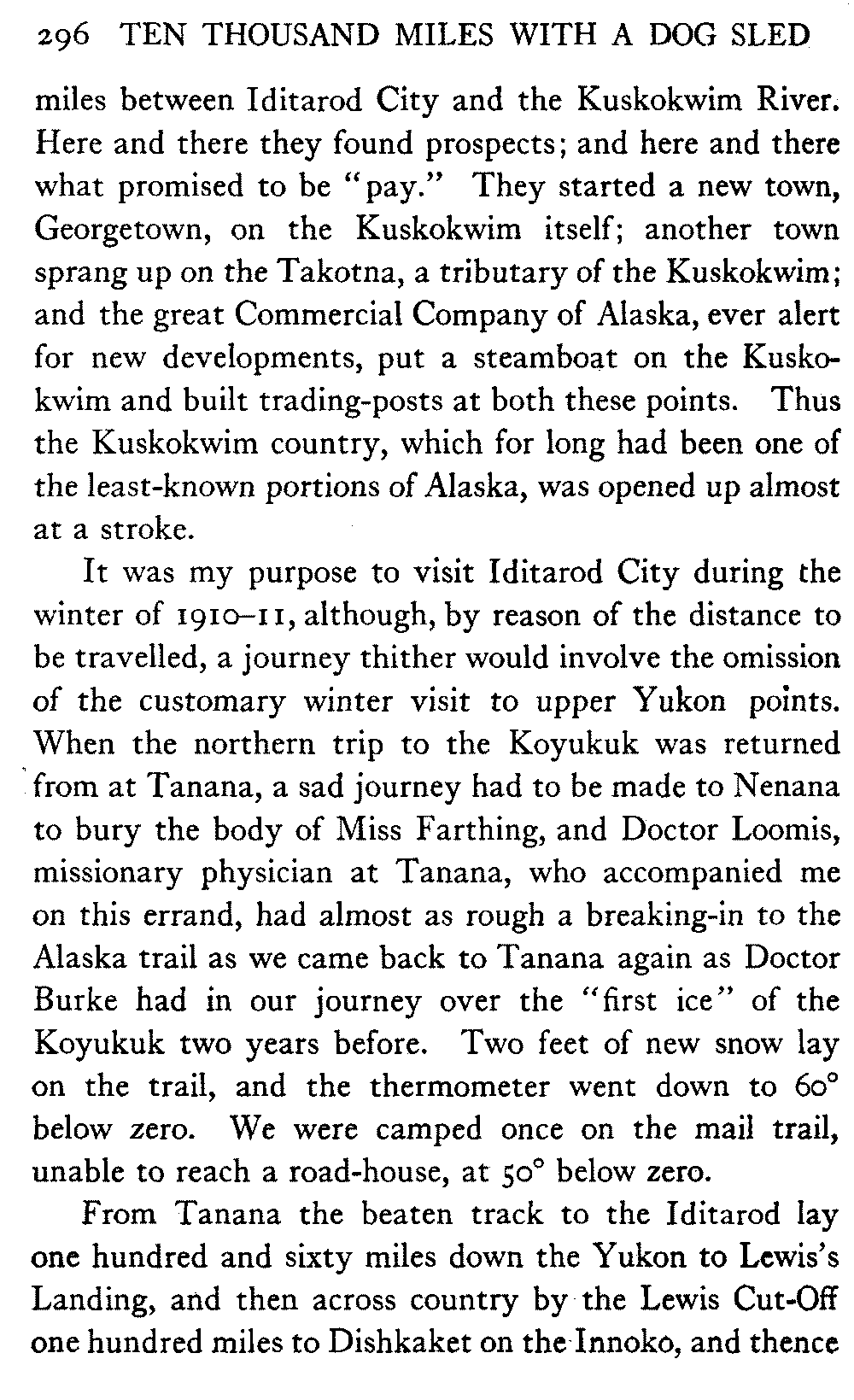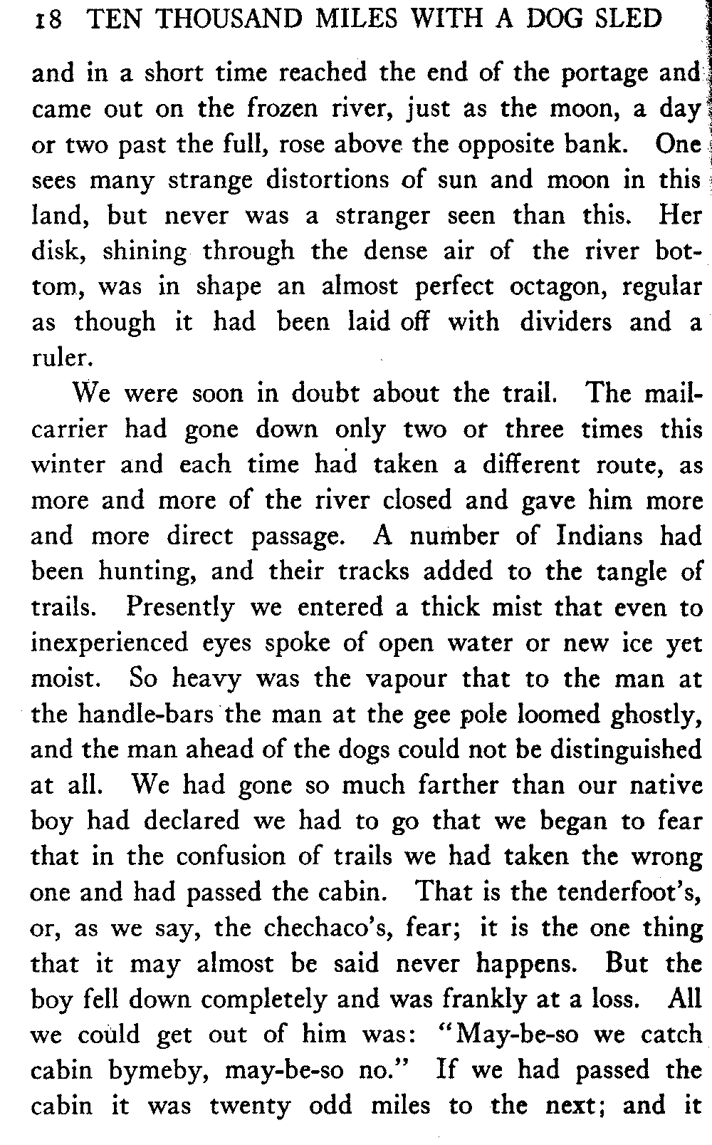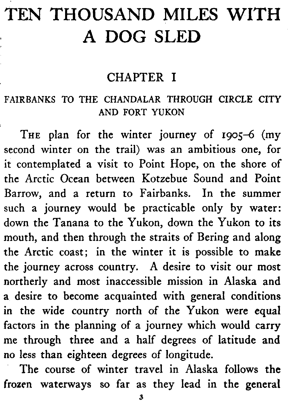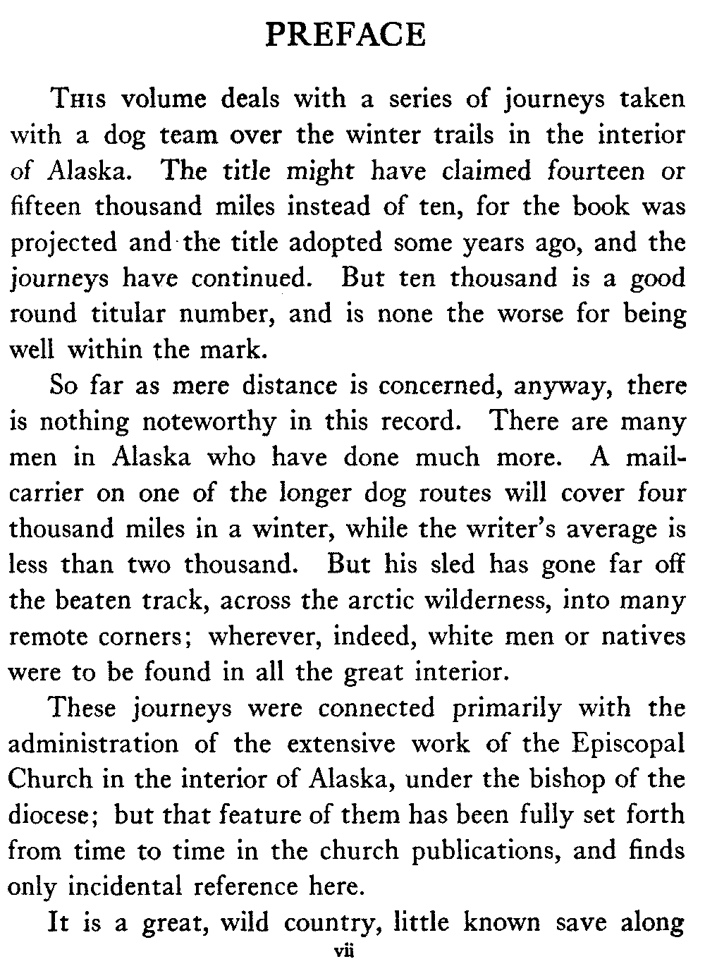This volume deals with a series of journeys taken with a dog team over the winter trails in the interior of Alaska. The title might have claimed fourteen or fifteen thousand miles instead of ten, for the book was projected and the title adopted some years ago, and the journeys have continued. But ten thousand is a good round titular number, and is none the worse for being well within the mark.