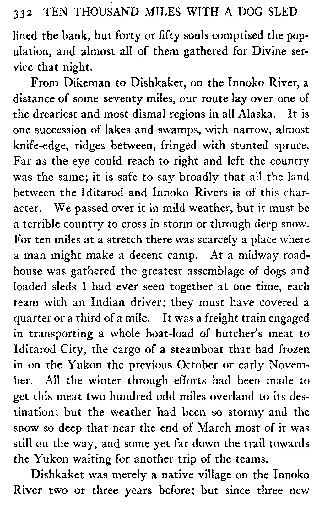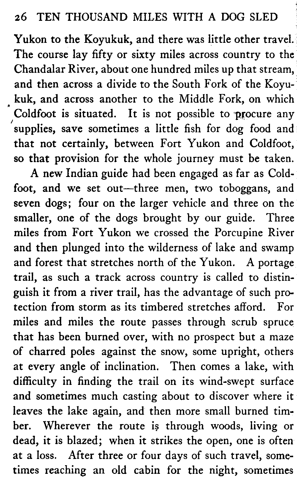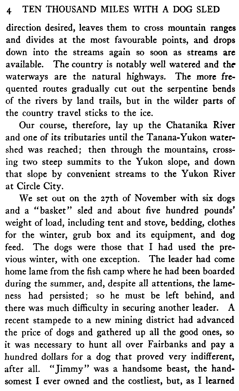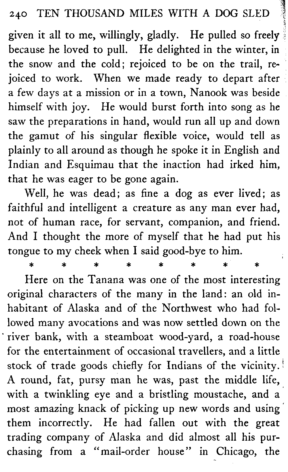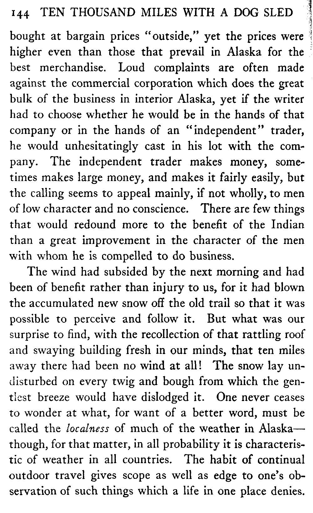This volume deals with a series of journeys taken with a dog team over the winter trails in the interior of Alaska. The title might have claimed fourteen or fifteen thousand miles instead of ten, for the book was projected and the title adopted some years ago, and the journeys have continued. But ten thousand is a good round titular number, and is none the worse for being well within the mark.