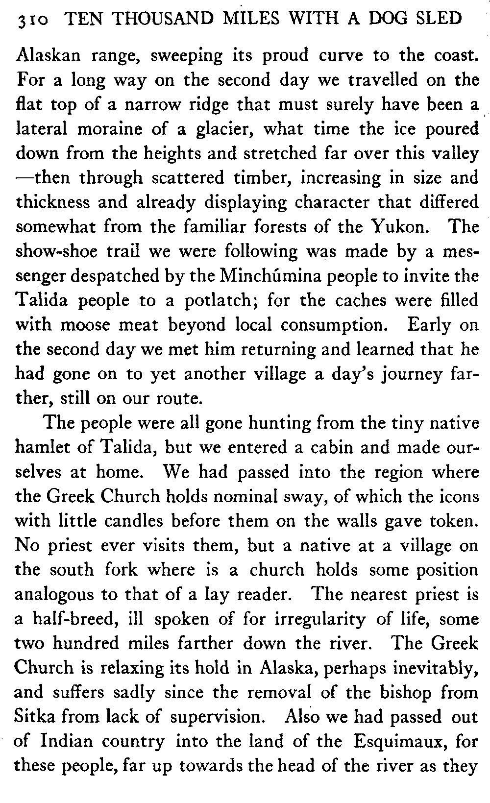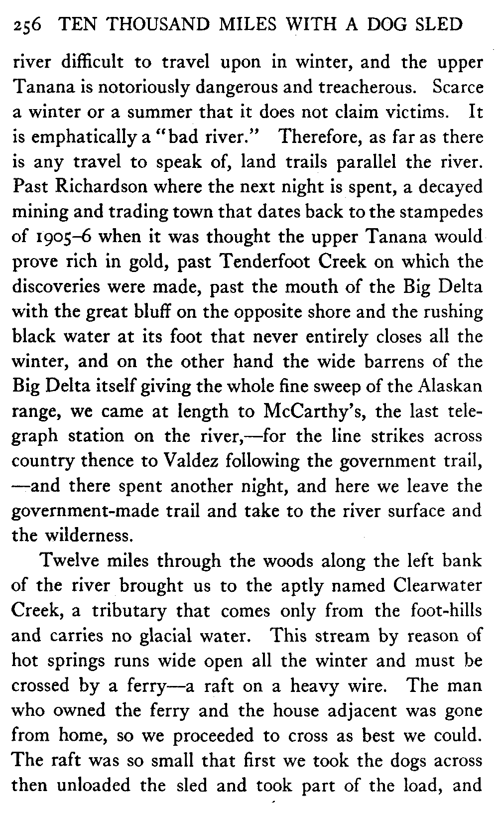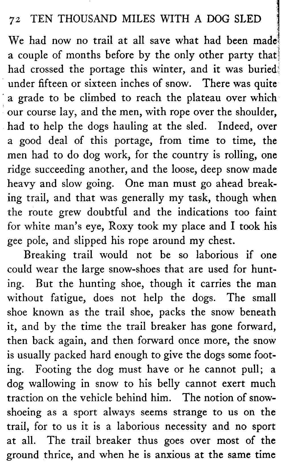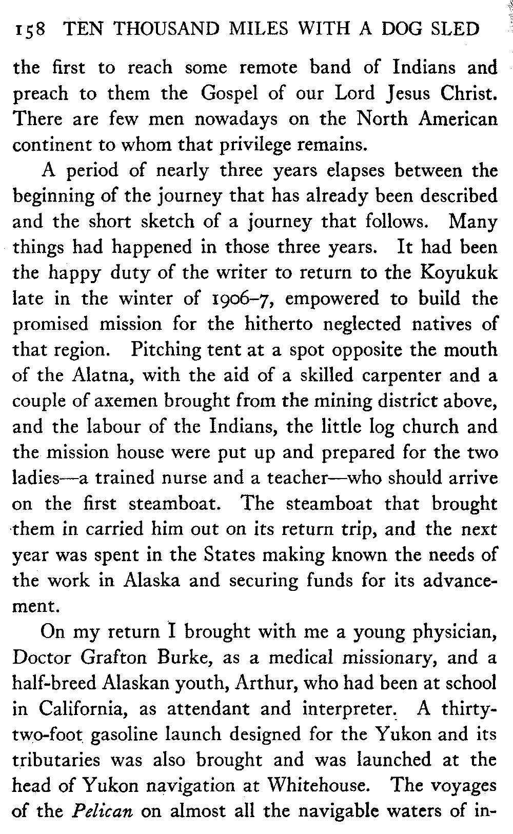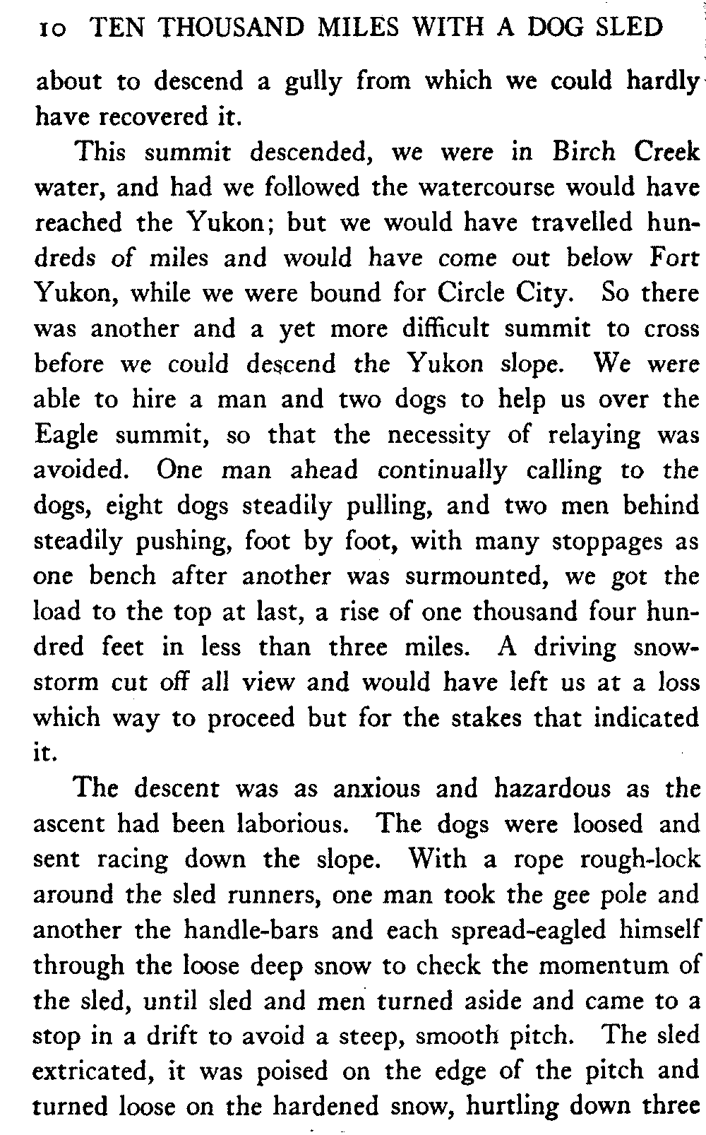 This volume deals with a series of journeys taken with a dog team over the winter trails in the interior of Alaska. The title might have claimed fourteen or fifteen thousand miles instead of ten, for the book was projected and the title adopted some years ago, and the journeys have continued. But ten thousand is a good round titular number, and is none the worse for being well within the mark.