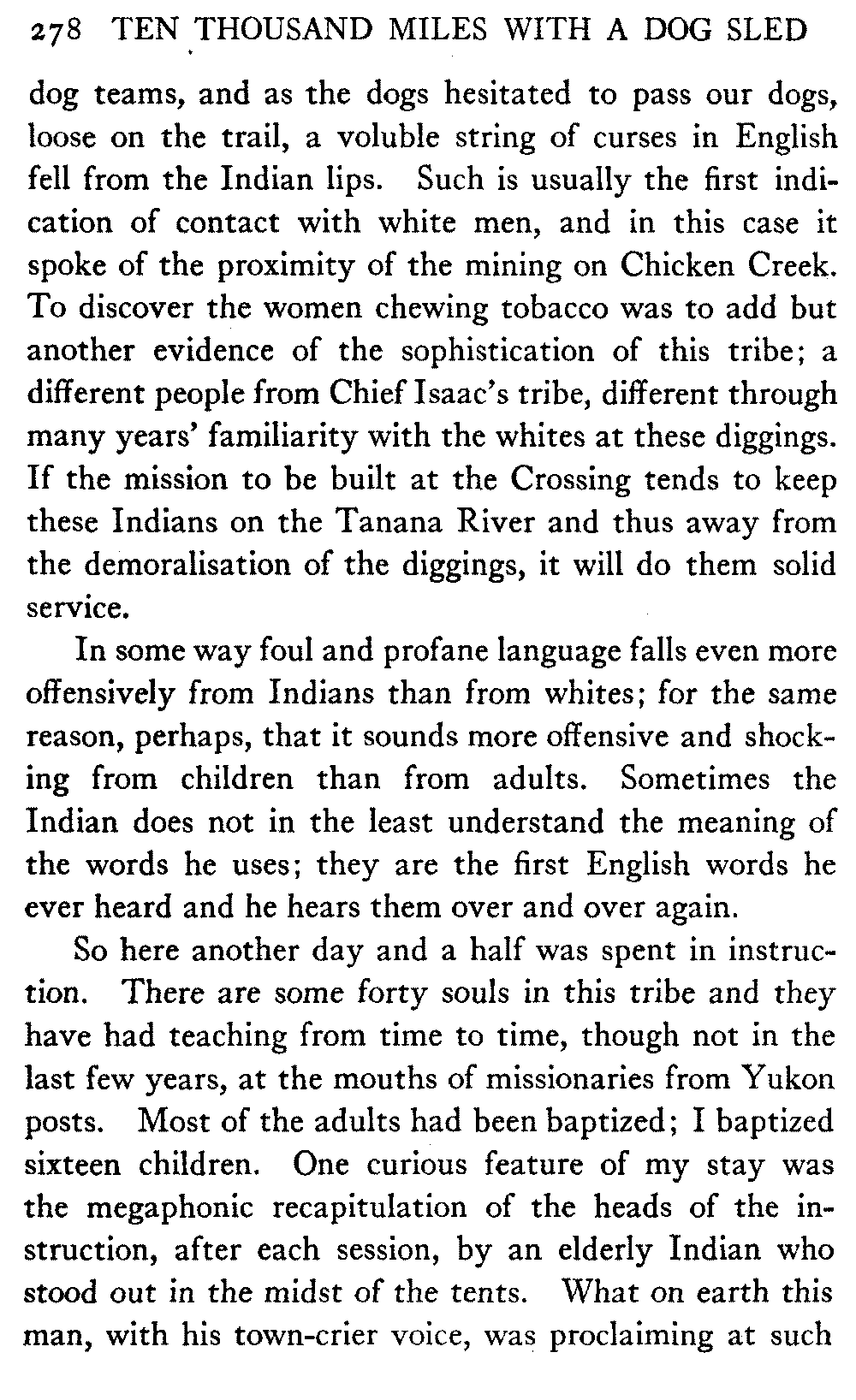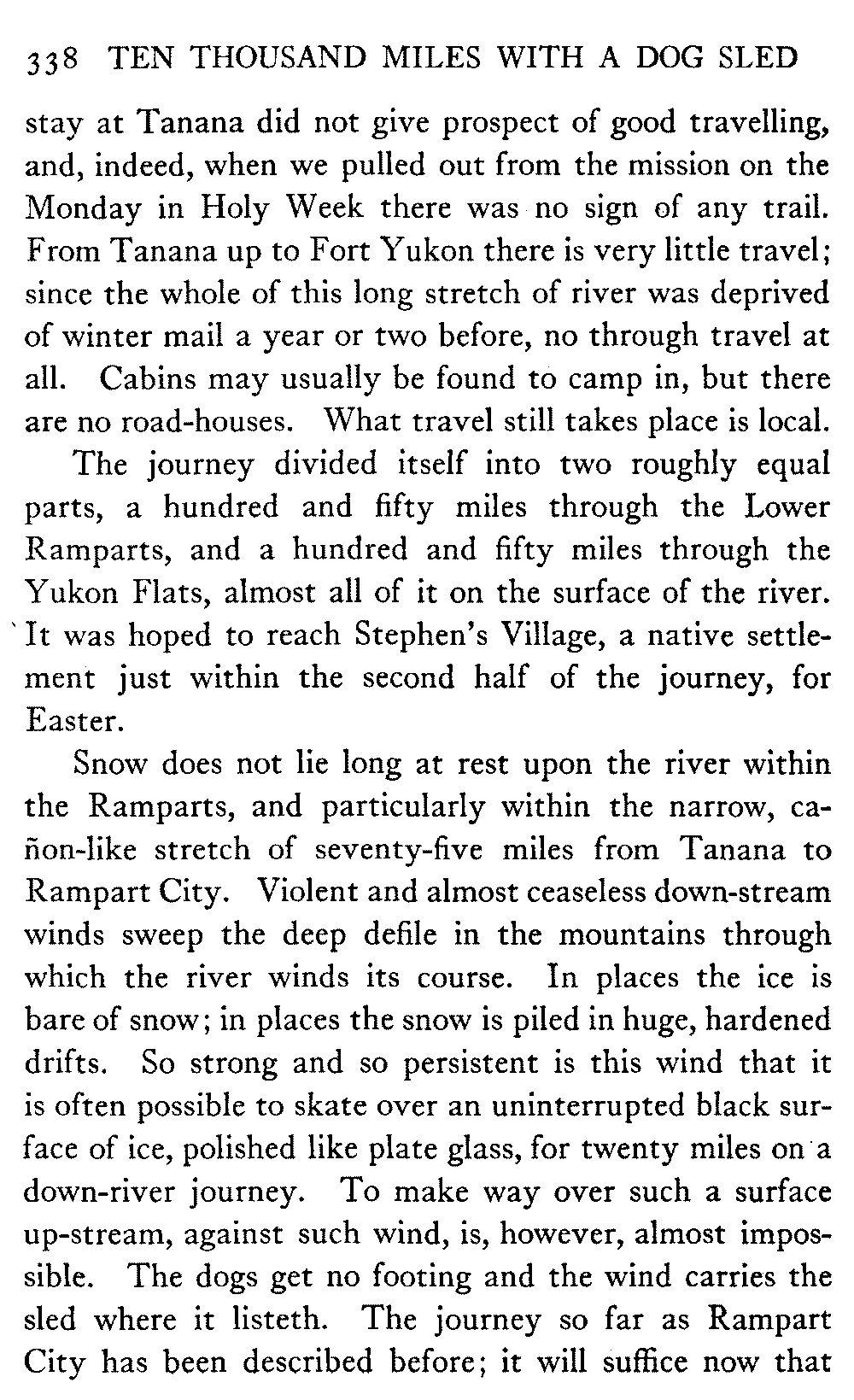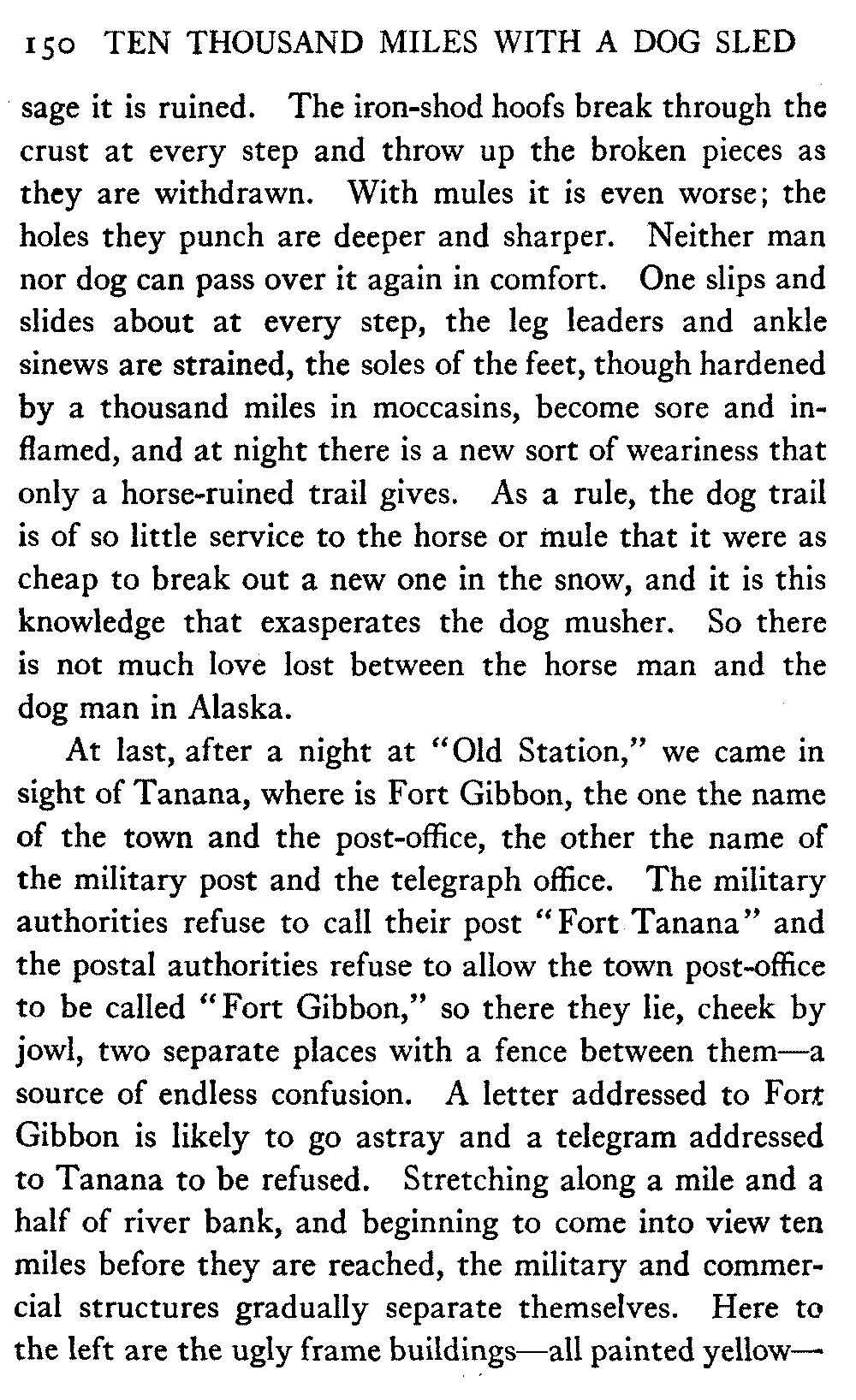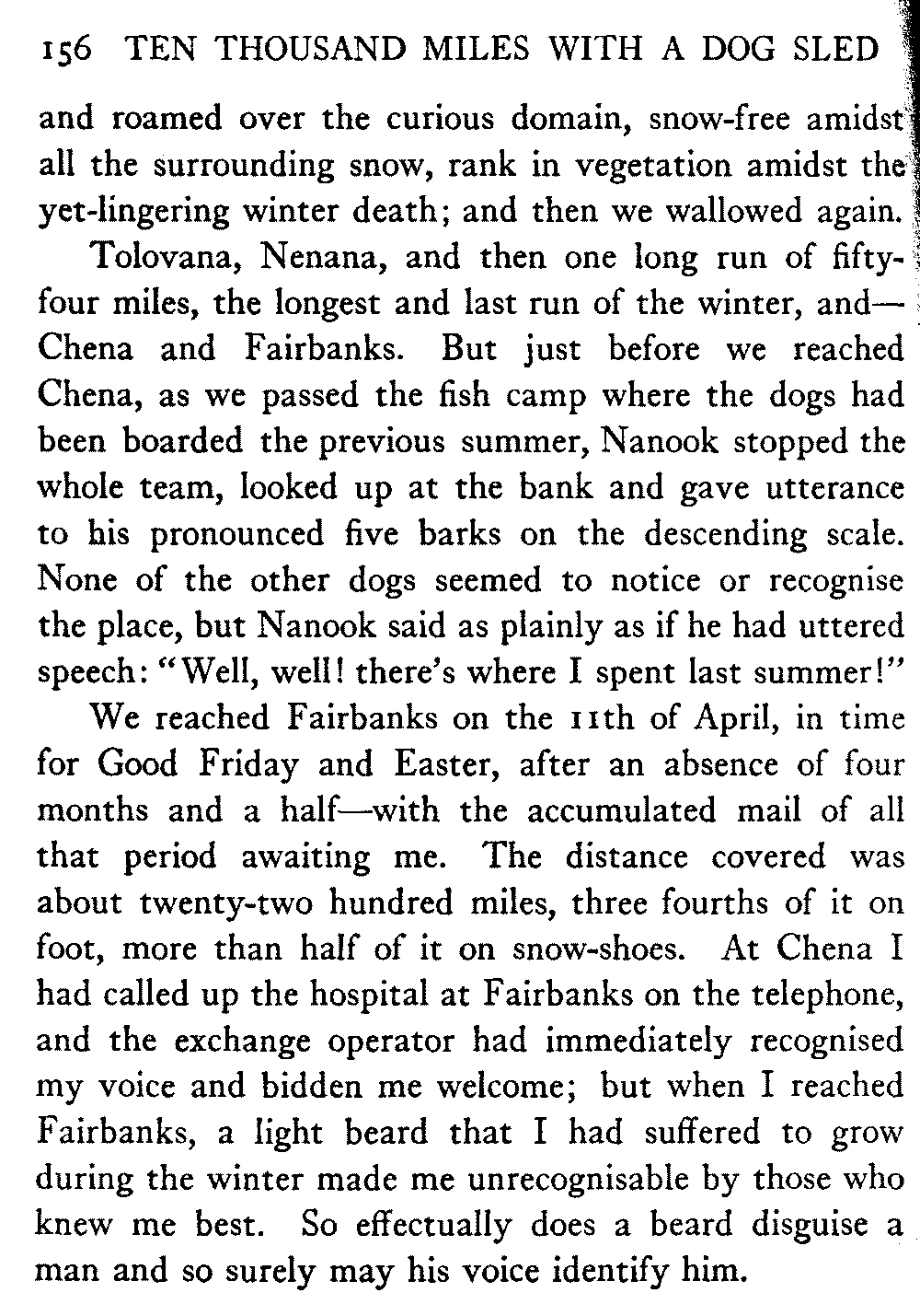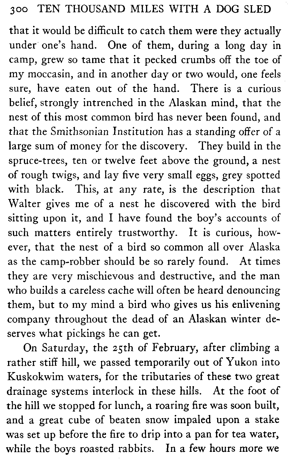 This volume deals with a series of journeys taken with a dog team over the winter trails in the interior of Alaska. The title might have claimed fourteen or fifteen thousand miles instead of ten, for the book was projected and the title adopted some years ago, and the journeys have continued. But ten thousand is a good round titular number, and is none the worse for being well within the mark.