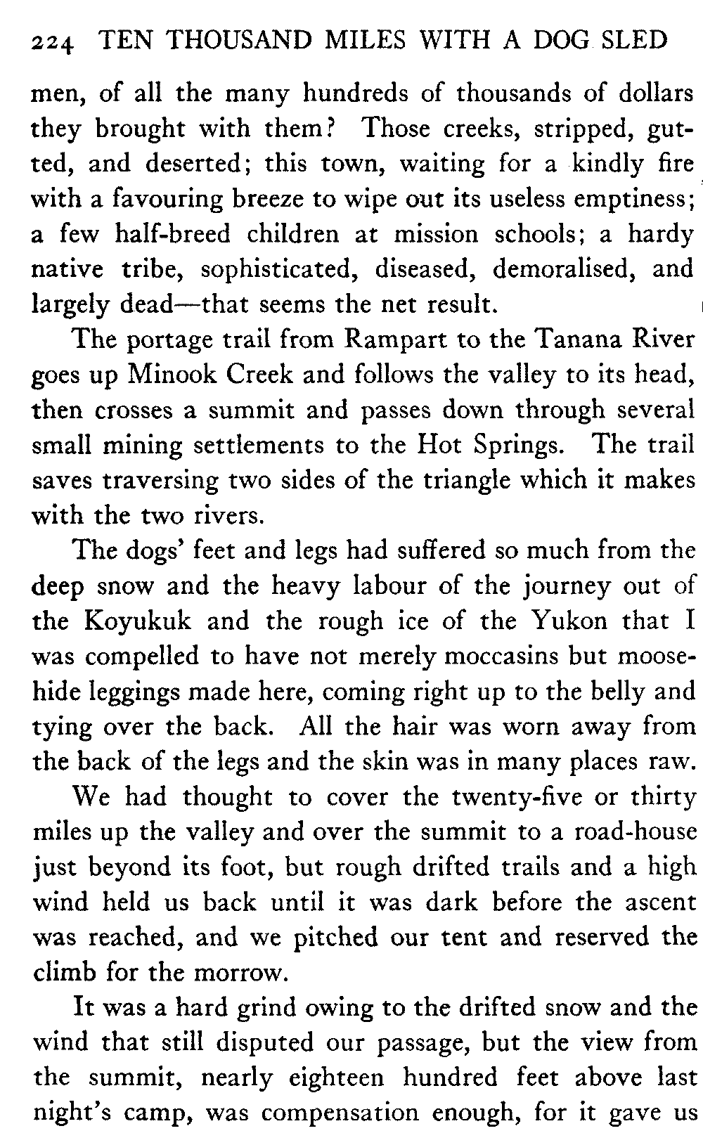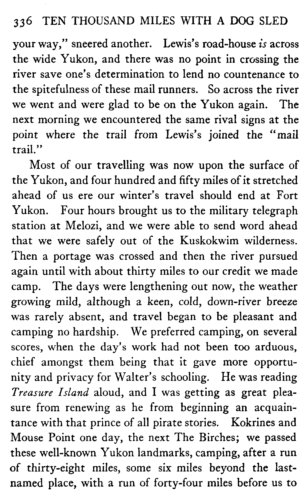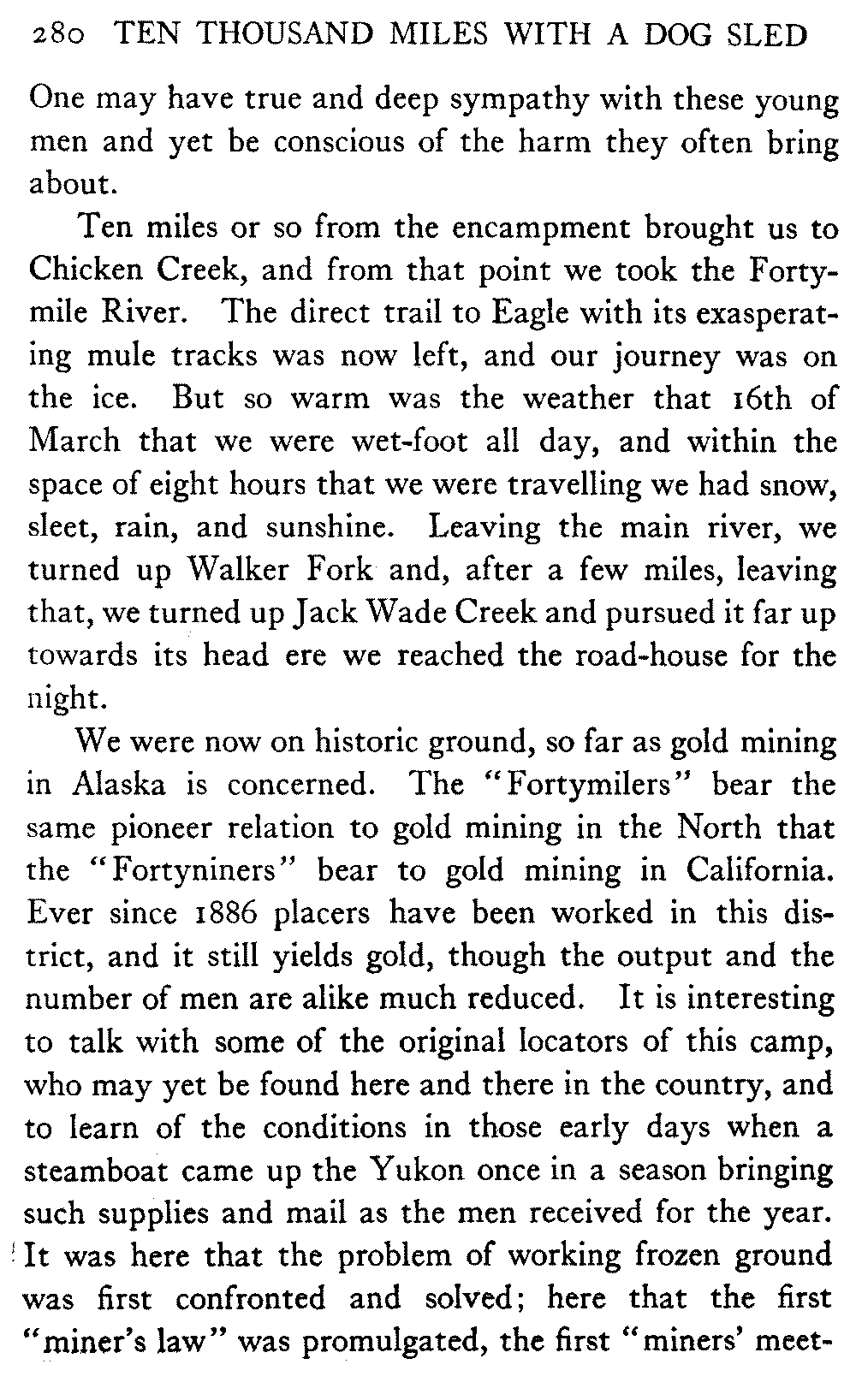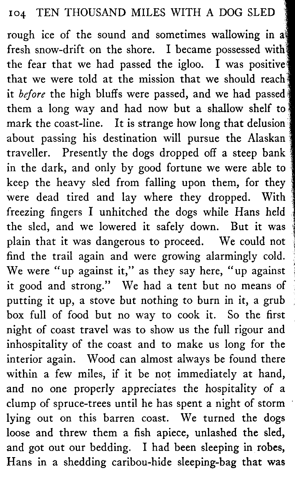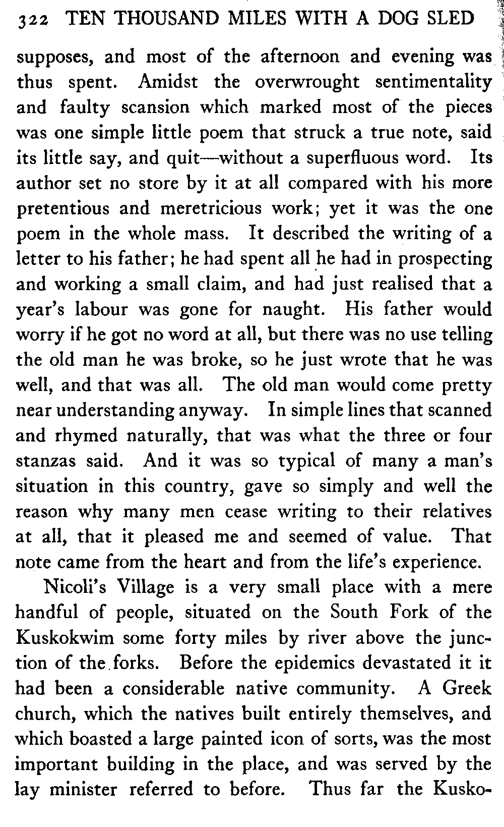 This volume deals with a series of journeys taken with a dog team over the winter trails in the interior of Alaska. The title might have claimed fourteen or fifteen thousand miles instead of ten, for the book was projected and the title adopted some years ago, and the journeys have continued. But ten thousand is a good round titular number, and is none the worse for being well within the mark.