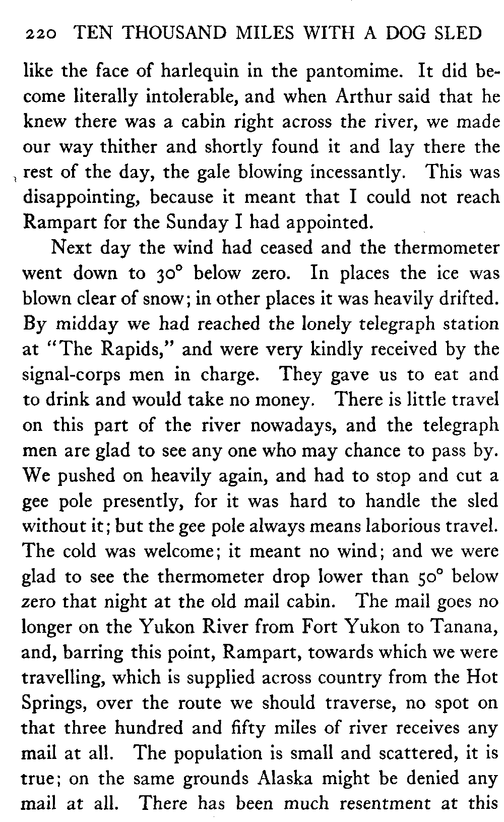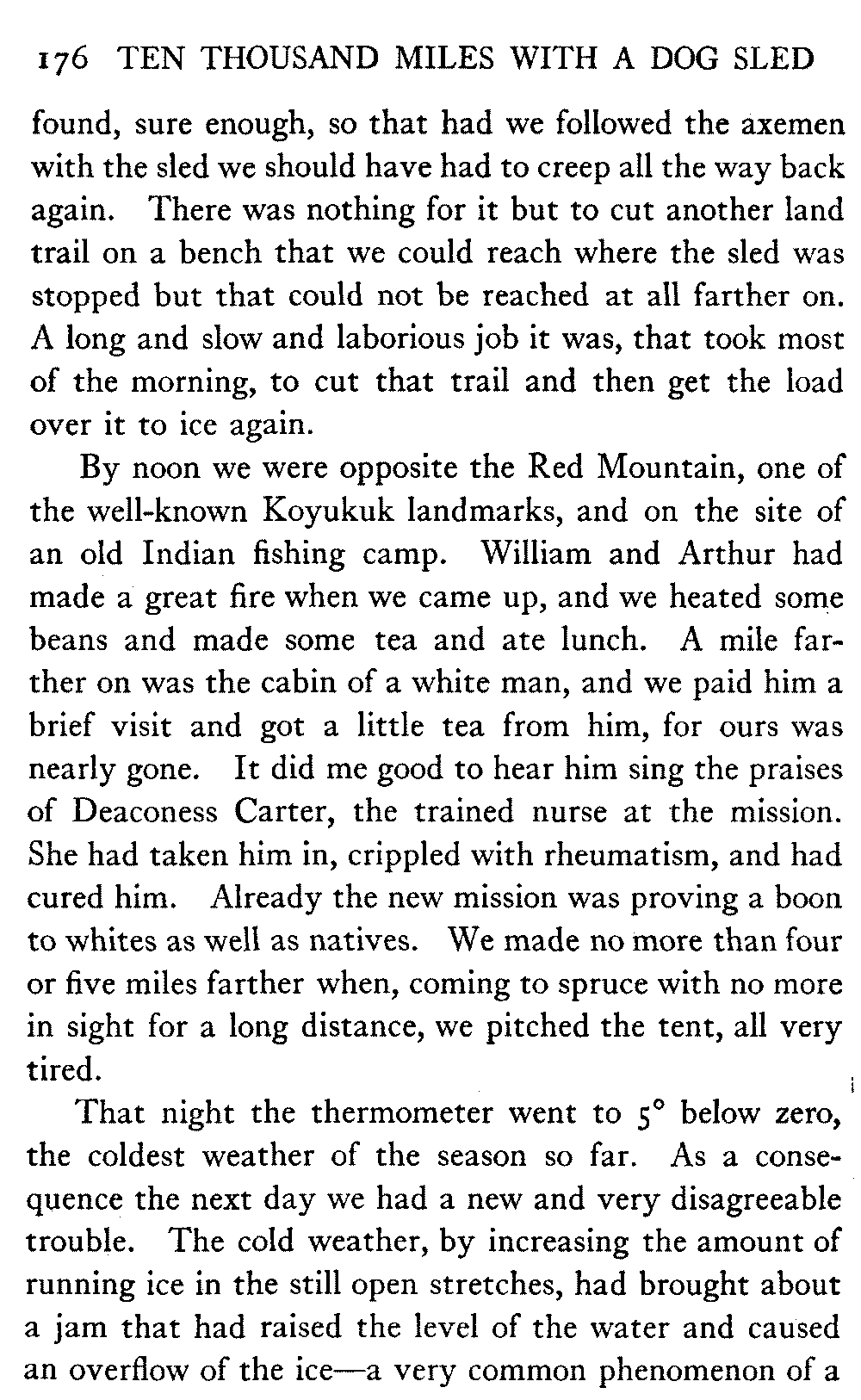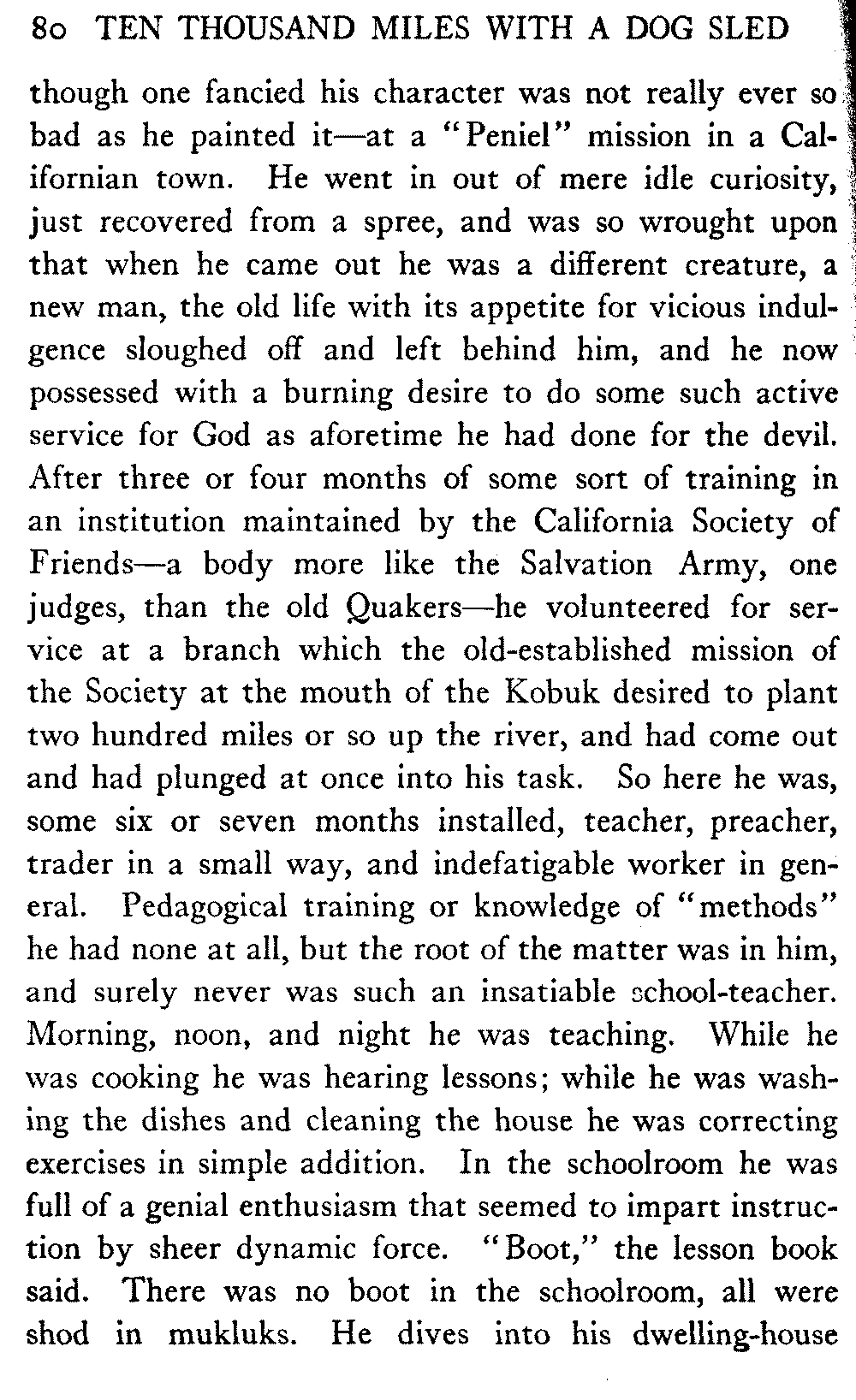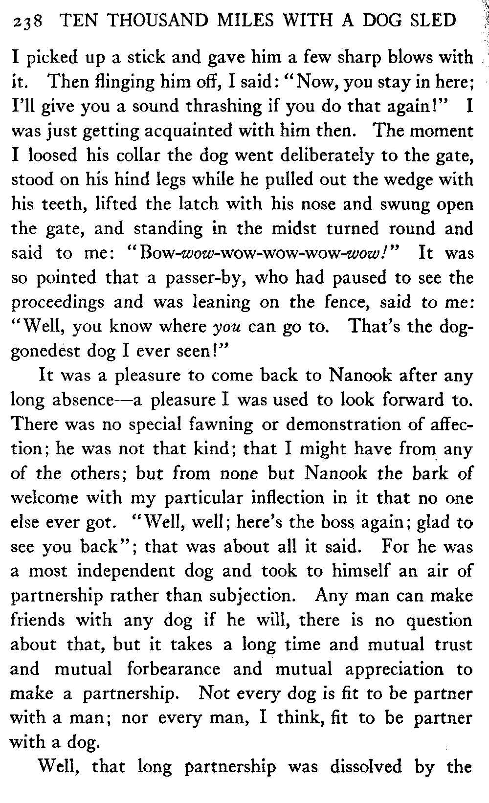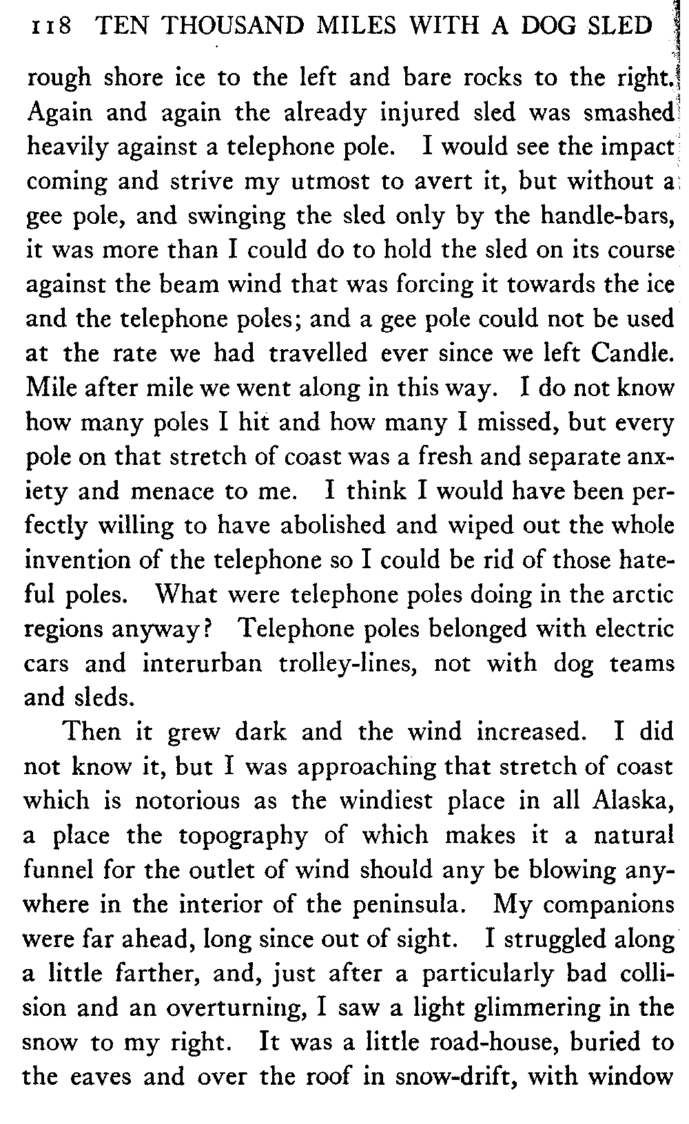 This volume deals with a series of journeys taken with a dog team over the winter trails in the interior of Alaska. The title might have claimed fourteen or fifteen thousand miles instead of ten, for the book was projected and the title adopted some years ago, and the journeys have continued. But ten thousand is a good round titular number, and is none the worse for being well within the mark.