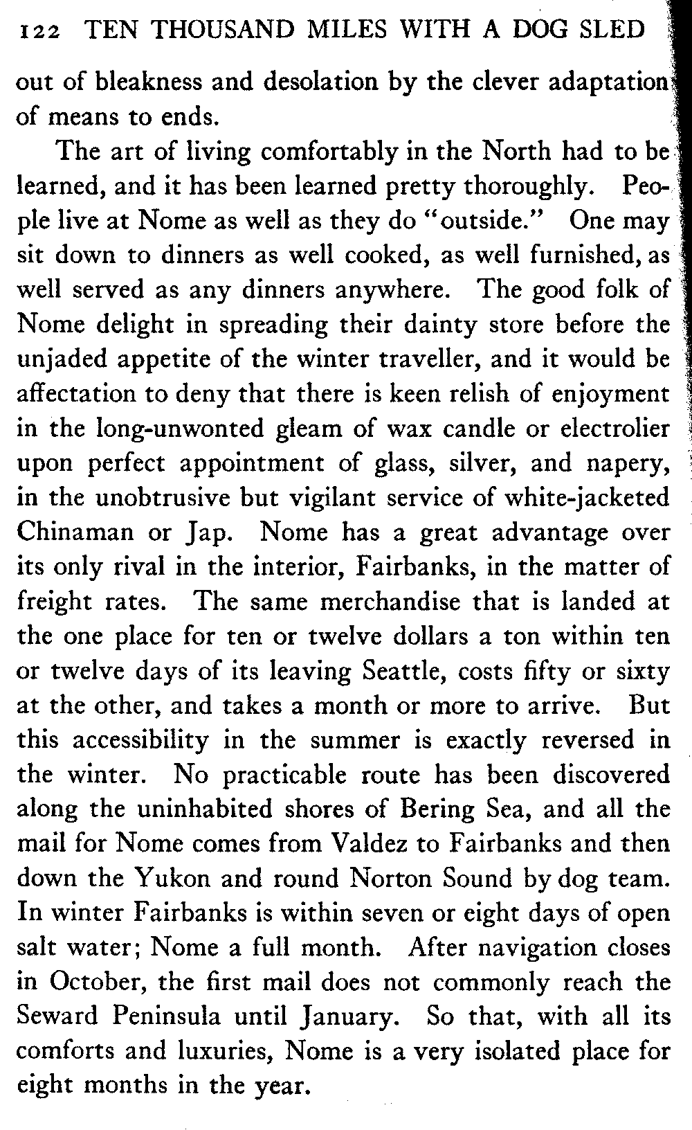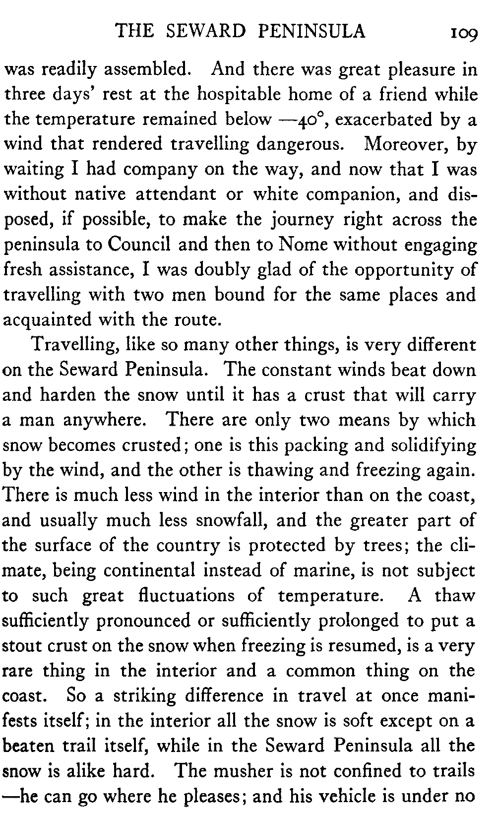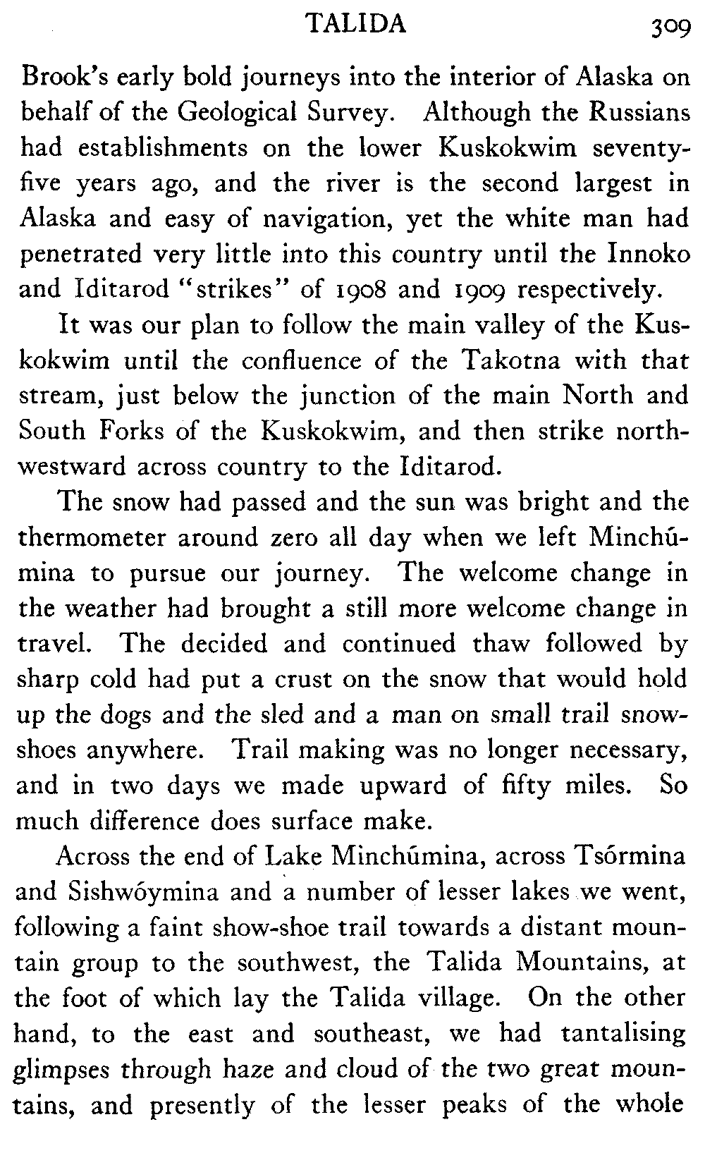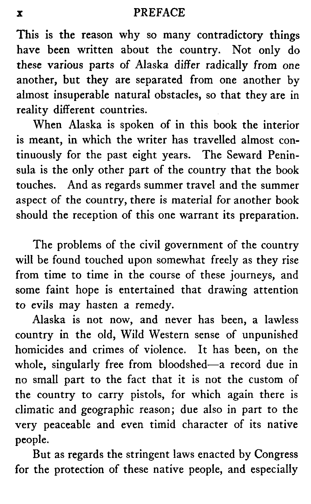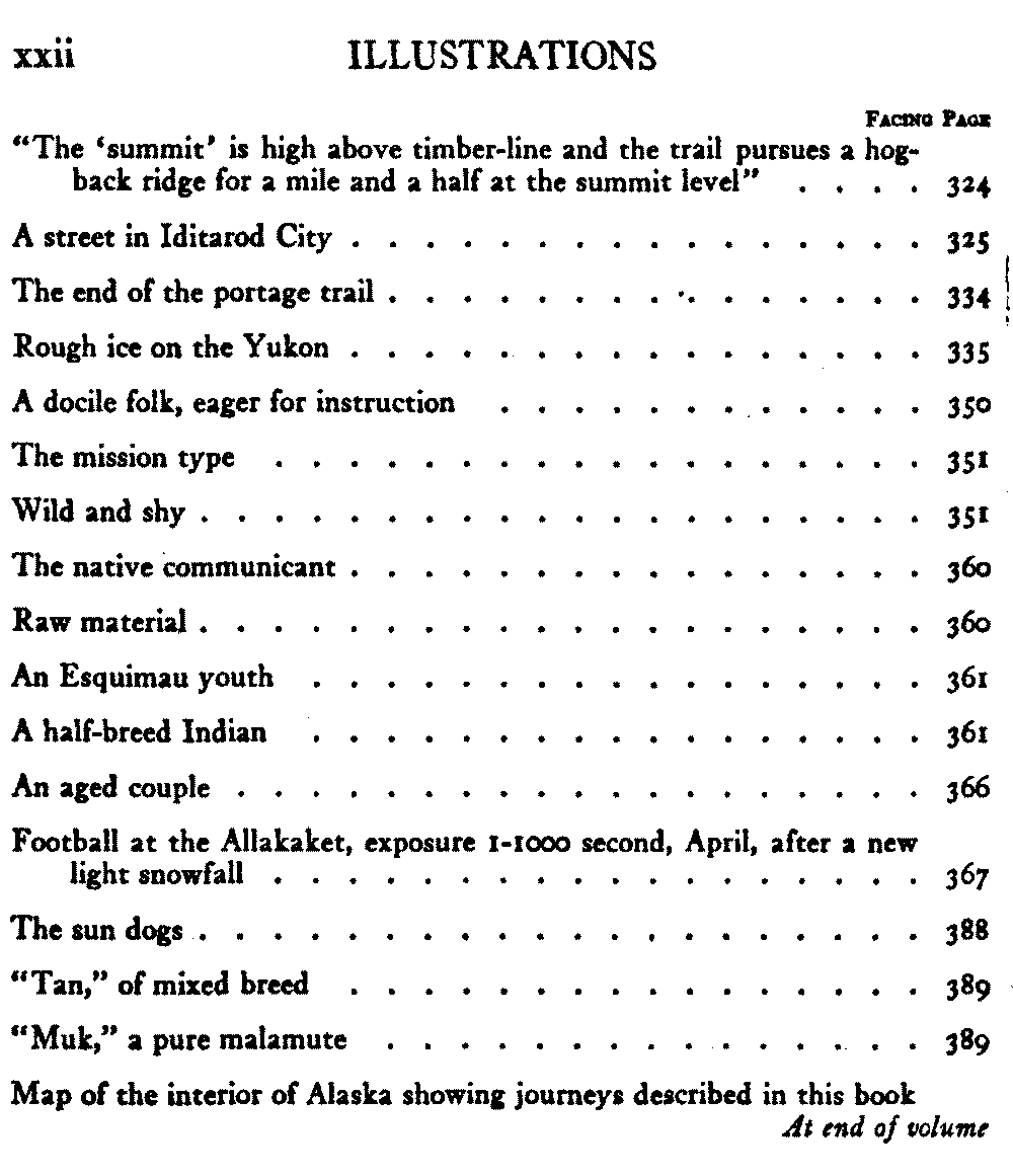 When Alaska is spoken of in this book the interior is meant, in which the writer has travelled almost continuously for the past eight years. The Seward Peninsula is the only other part of the country that the book touches. And as regards summer travel and the summer aspect of the country, there is material for another book should the reception of this one warrant its preparation.
