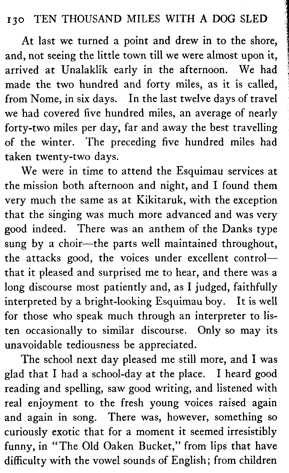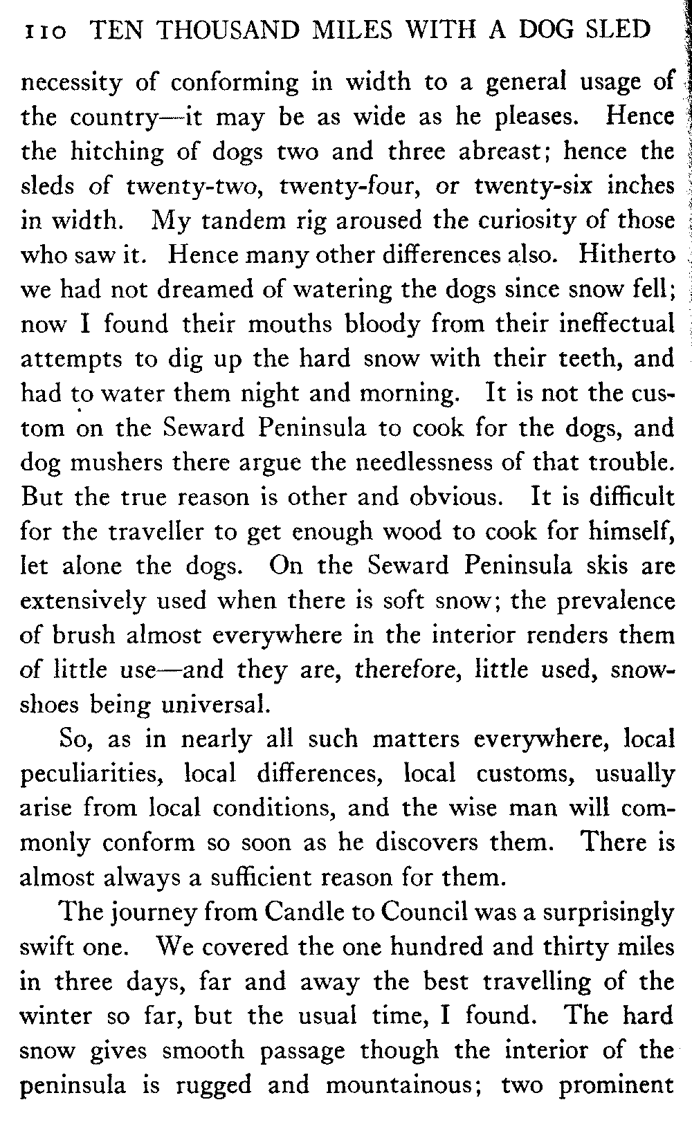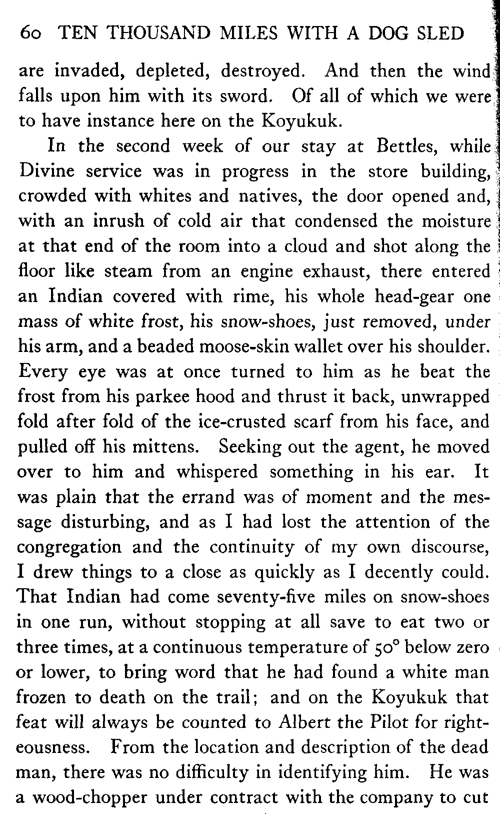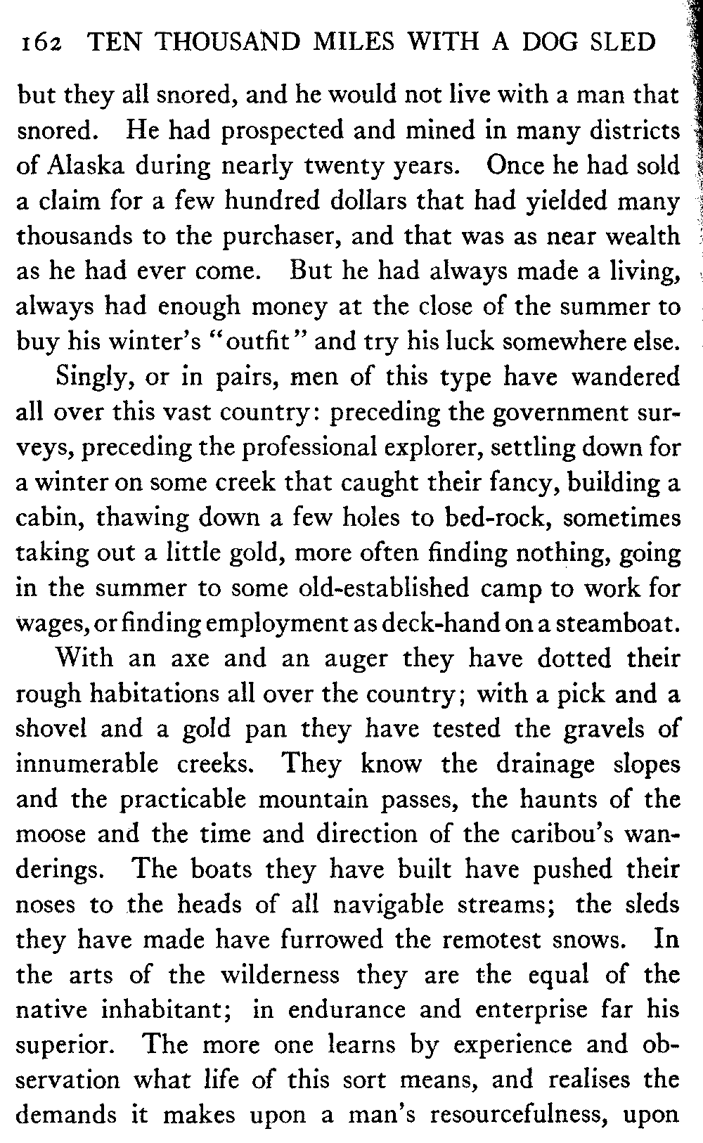 So far as mere distance is concerned, anyway, there is nothing noteworthy in this record. There are many men in Alaska who have done much more. A mail-carrier on one of the longer dog routes will cover four thousand miles in a winter, while the writer's average is less than two thousand. But his sled has gone far off the beaten track, across the arctic wilderness, into many remote corners; wherever, indeed, white men or natives were to be found in all the great interior.