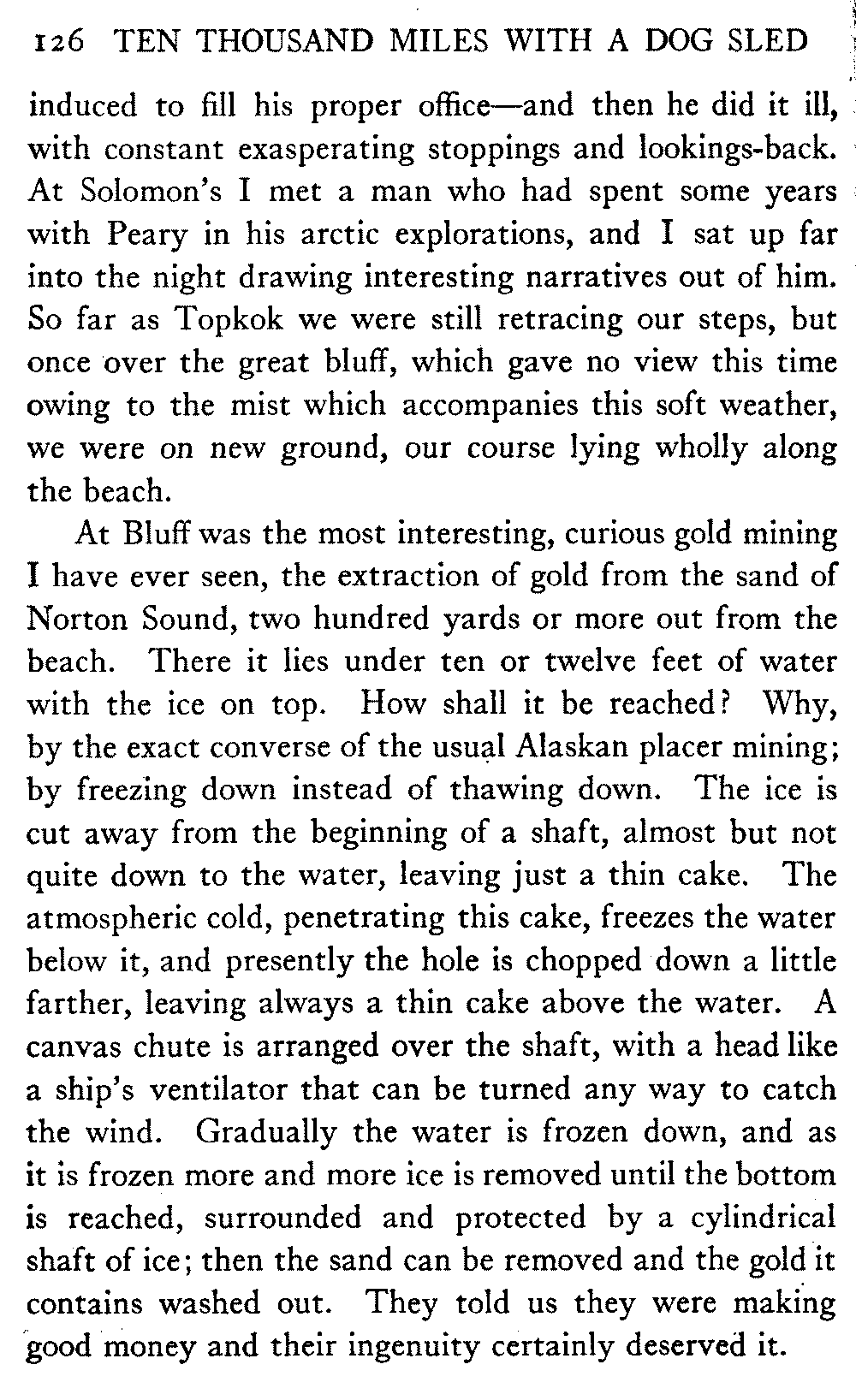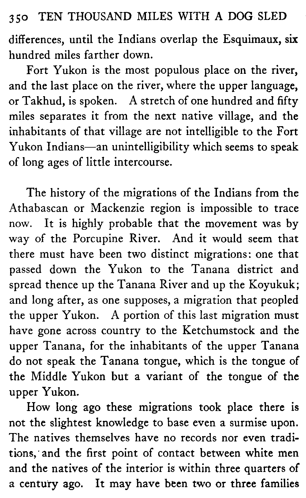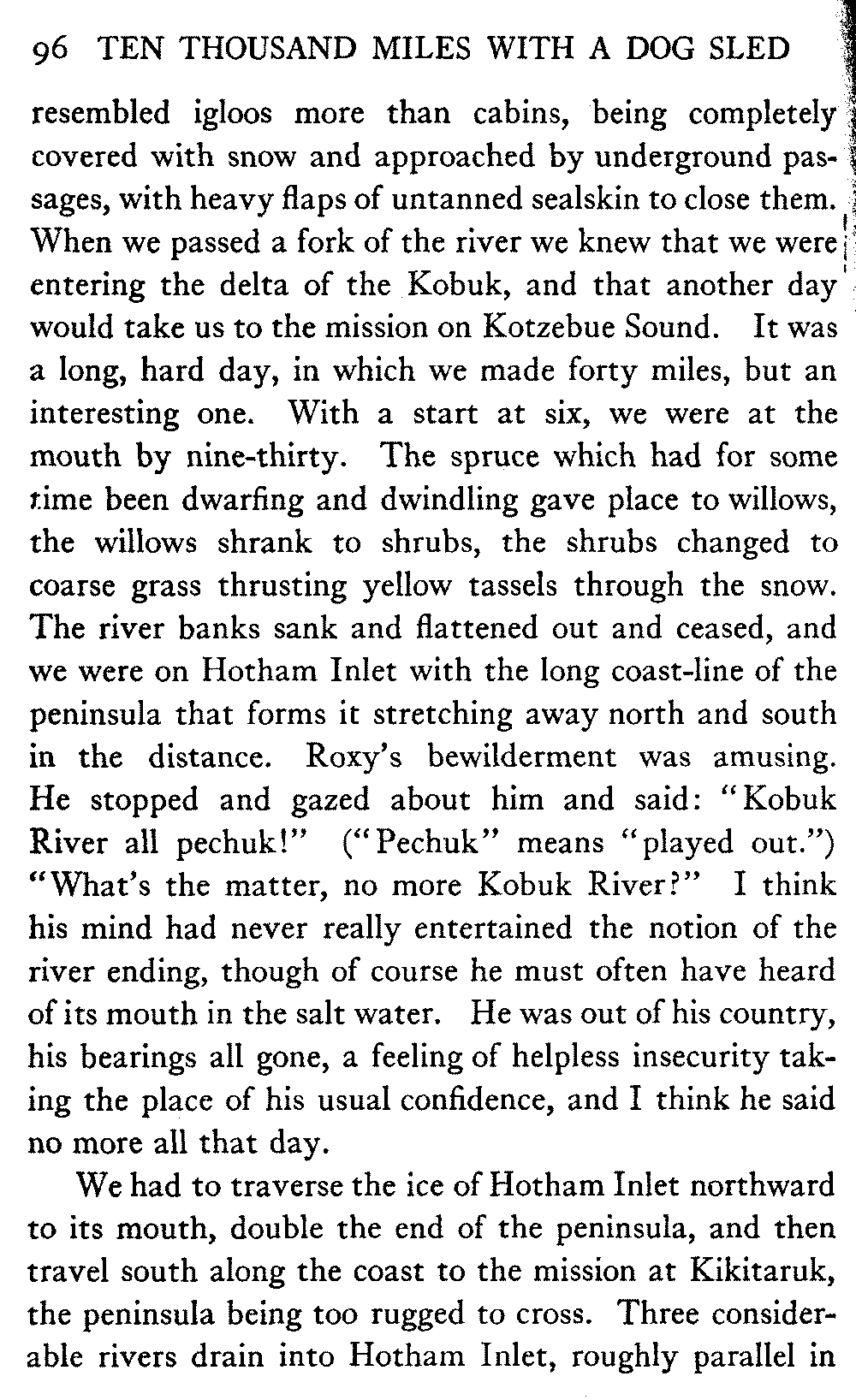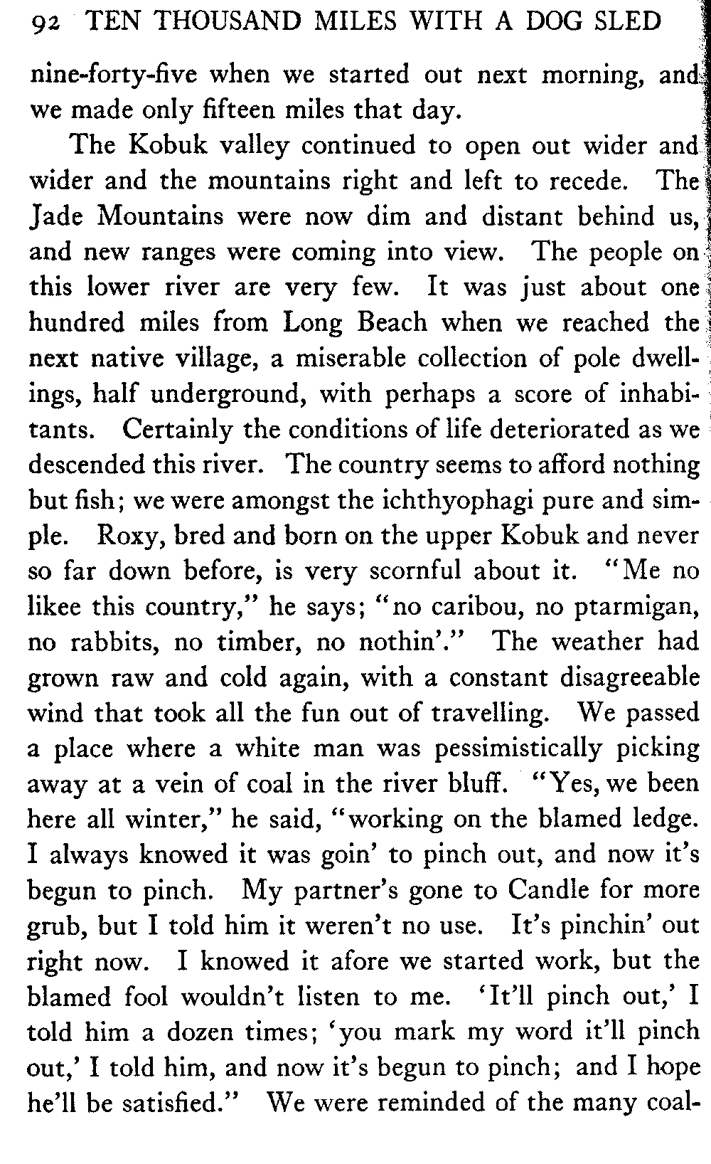 So far as mere distance is concerned, anyway, there is nothing noteworthy in this record. There are many men in Alaska who have done much more. A mail-carrier on one of the longer dog routes will cover four thousand miles in a winter, while the writer's average is less than two thousand. But his sled has gone far off the beaten track, across the arctic wilderness, into many remote corners; wherever, indeed, white men or natives were to be found in all the great interior.