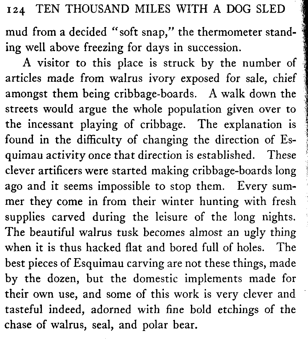 Amongst men of thought and feeling there is noticeable revulsion from the supercilious attitude that used not to be uncommon toward the little peoples of the world. It begins to be recognised that it is quite possible that even the smallest of the little peoples may have some contribution to make to the welfare and progress of the human race. What is the Boy Scout movement that[xviii] is sweeping the country, to the enormous benefit of the rising generation, but the incorporating into the nurture of our youth of the things that were the nurture of the Indian youth; that are a large part of the nurture of the Alaskan Indian youth to-day? And the camp-fire clubs and woodcraft associations and the whole trend to the life of the open recognise that the Indian had developed a technique of wilderness life deserving of preservation for its value to the white man. While as for the Esquimaux, the author never sees the extraordinary prevalence amongst them of the art of graphic delineation displayed in bold etchings of incidents of the chase upon their implements and weapons (though not upon the articles made by the dozen for the curio-venders at Nome and Saint Michael) without dreaming that some day an artist will come from out that singular and most interesting people who shall teach the world something new about art.