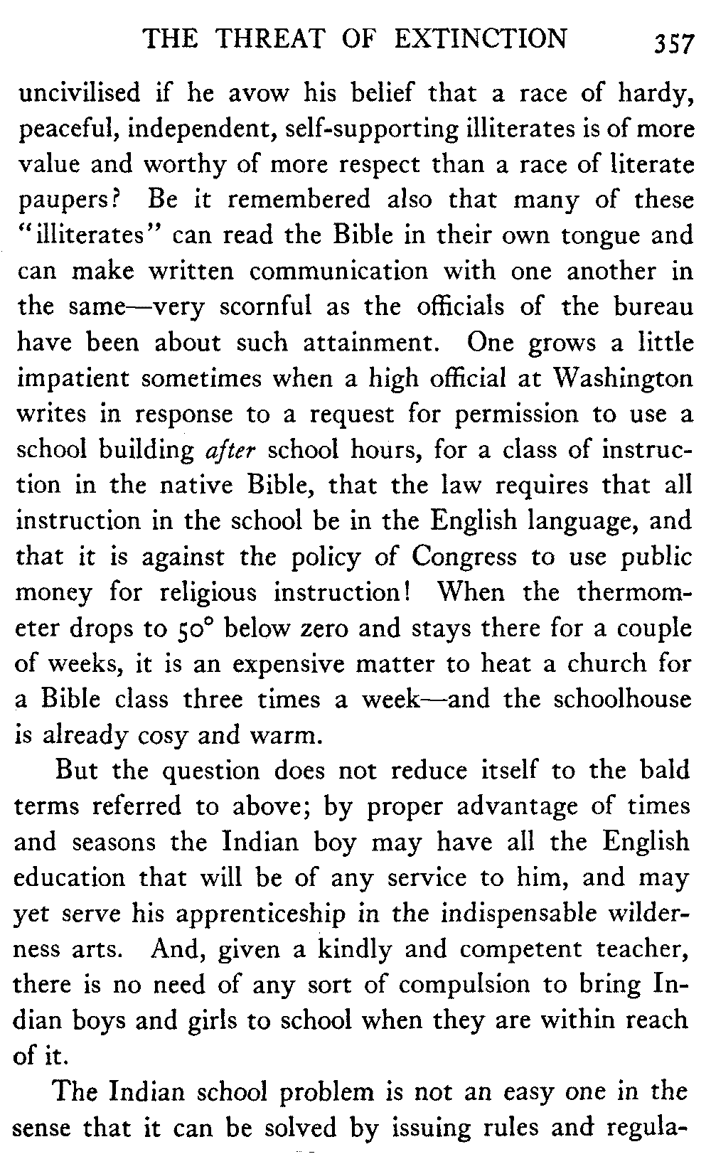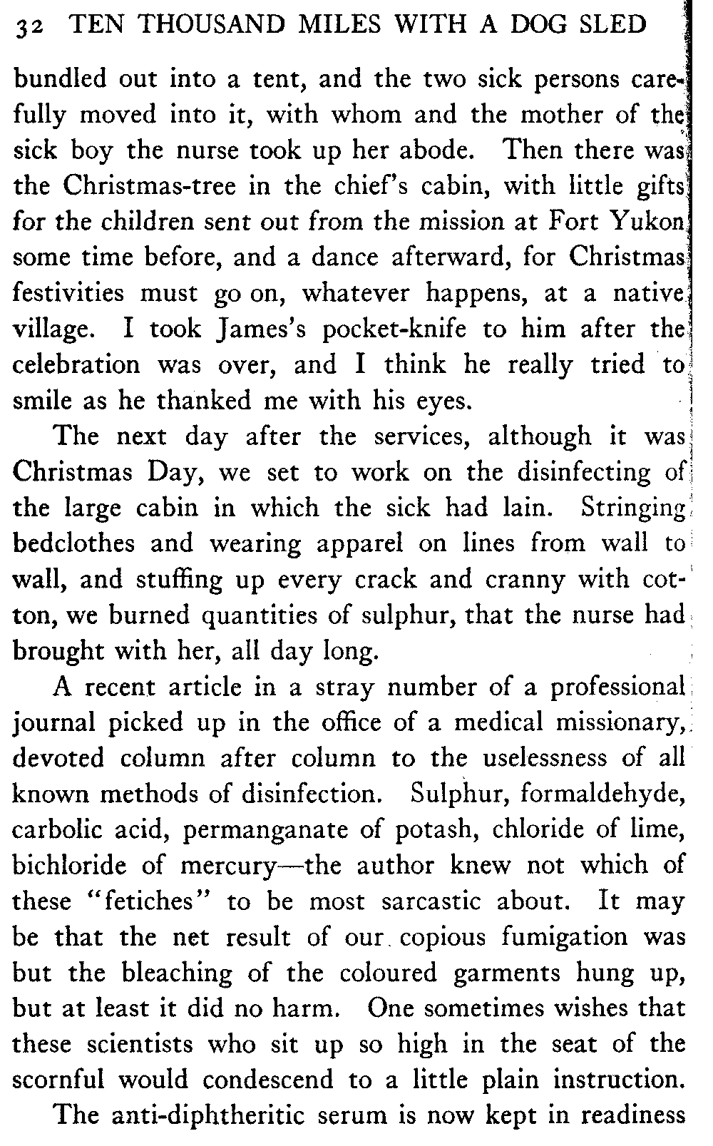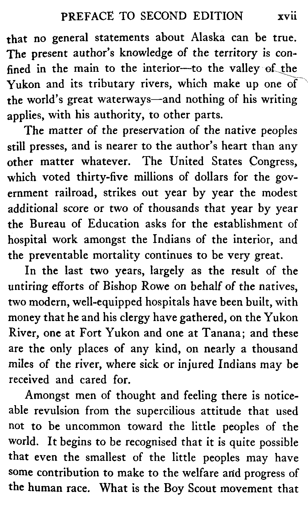 The matter of the preservation of the native peoples still presses, and is nearer to the author's heart than any other matter whatever. The United States Congress, which voted thirty-five millions of dollars for the government railroad, strikes out year by year the modest additional score or two of thousands that year by year the Bureau of Education asks for the establishment of hospital work amongst the Indians of the interior, and the preventable mortality continues to be very great.
