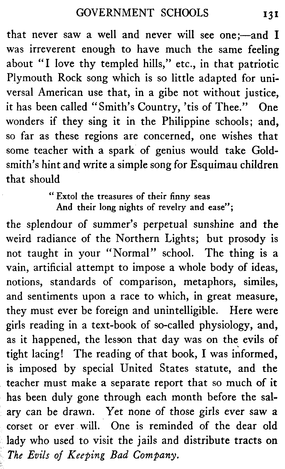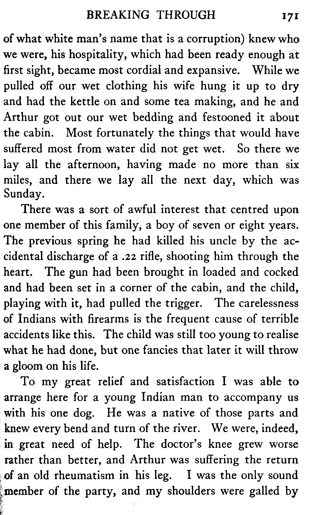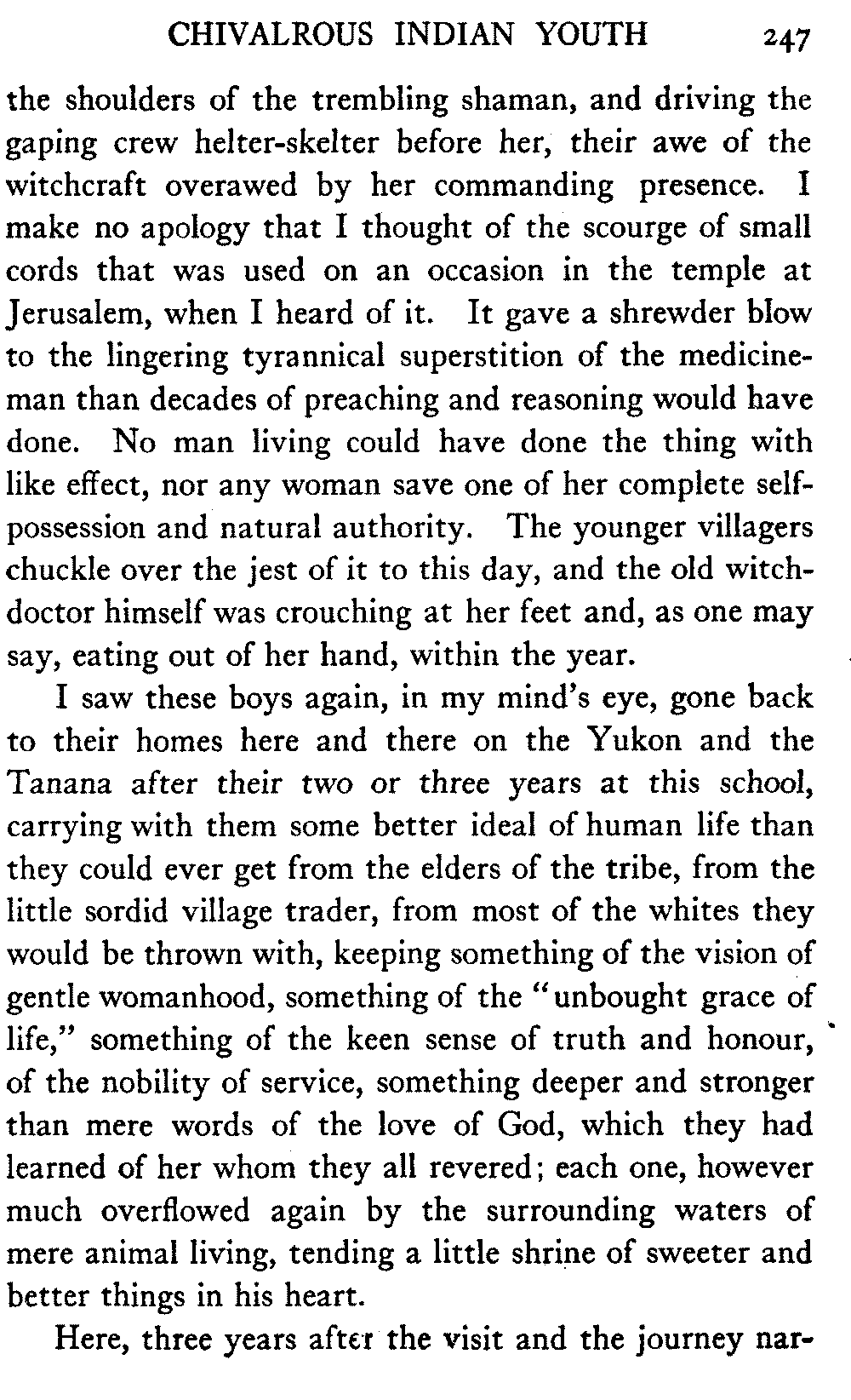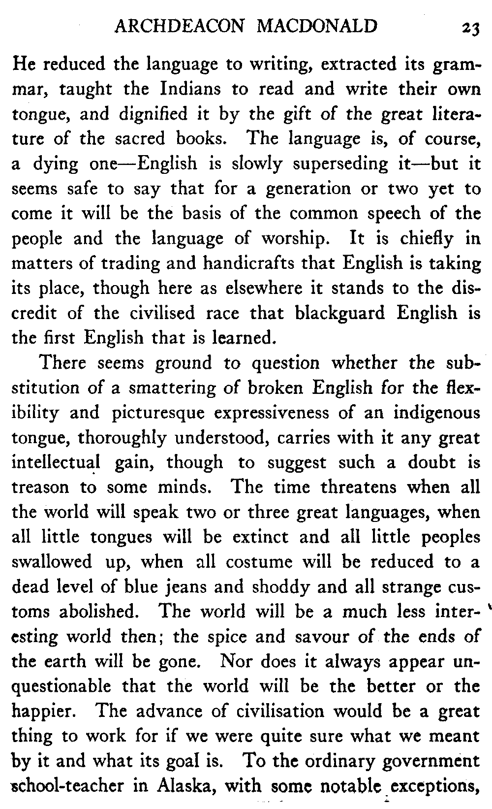 The matter of the preservation of the native peoples still presses, and is nearer to the author's heart than any other matter whatever. The United States Congress, which voted thirty-five millions of dollars for the government railroad, strikes out year by year the modest additional score or two of thousands that year by year the Bureau of Education asks for the establishment of hospital work amongst the Indians of the interior, and the preventable mortality continues to be very great.
