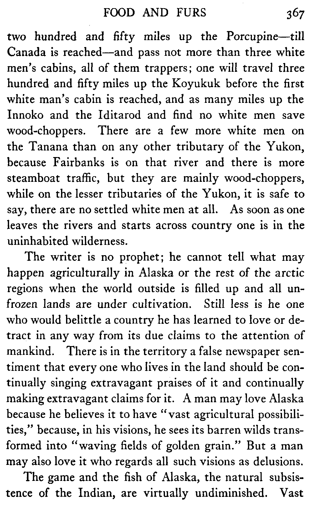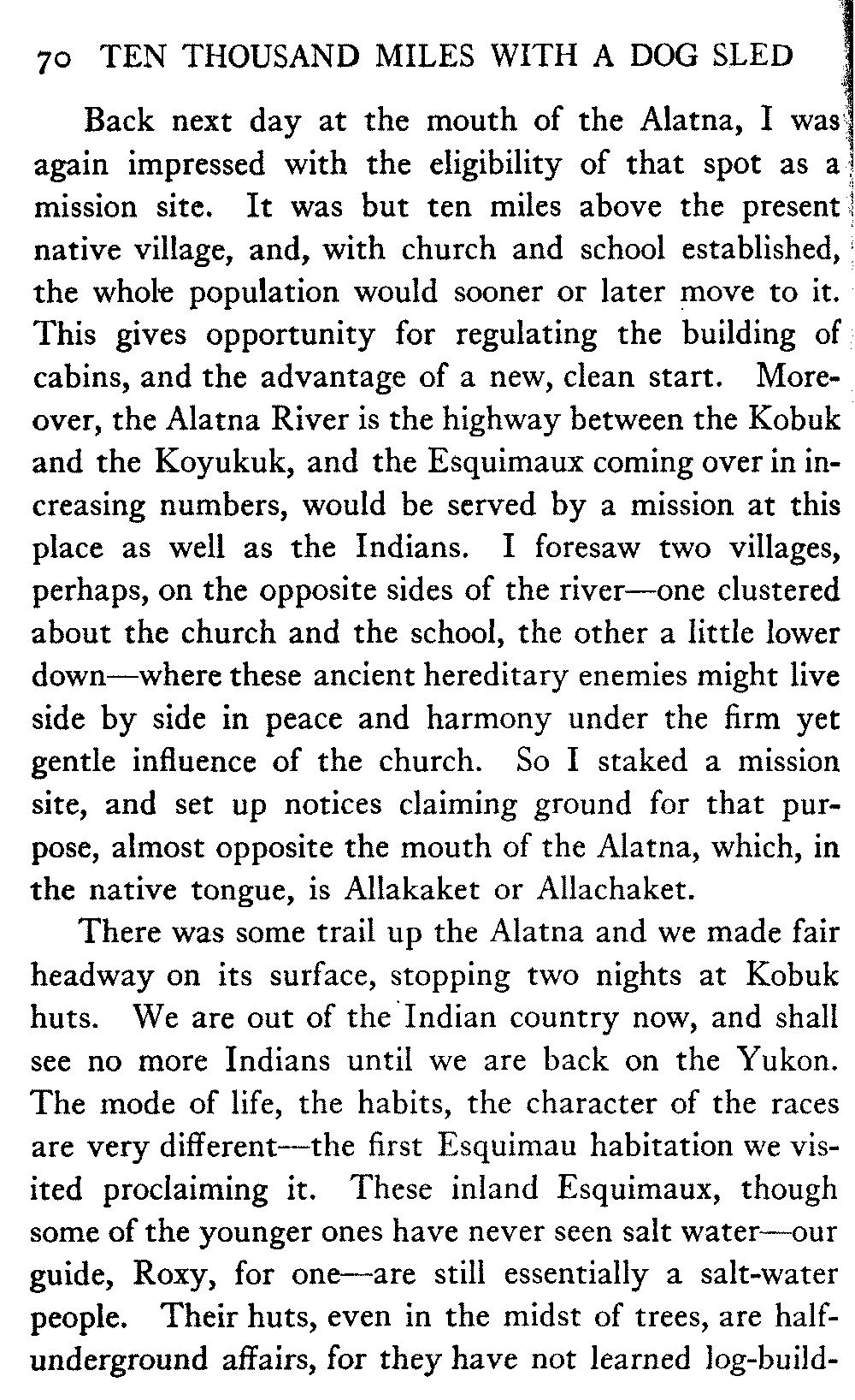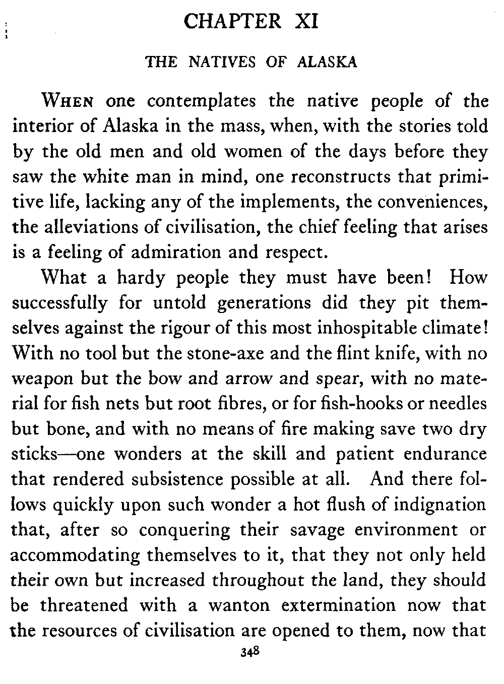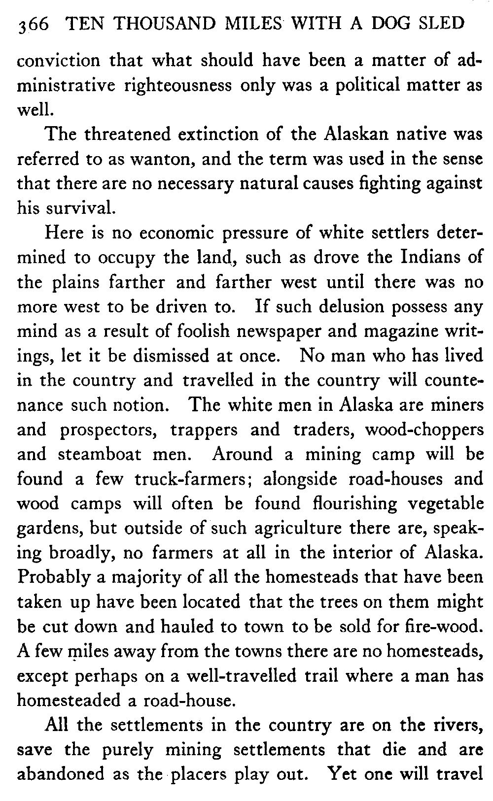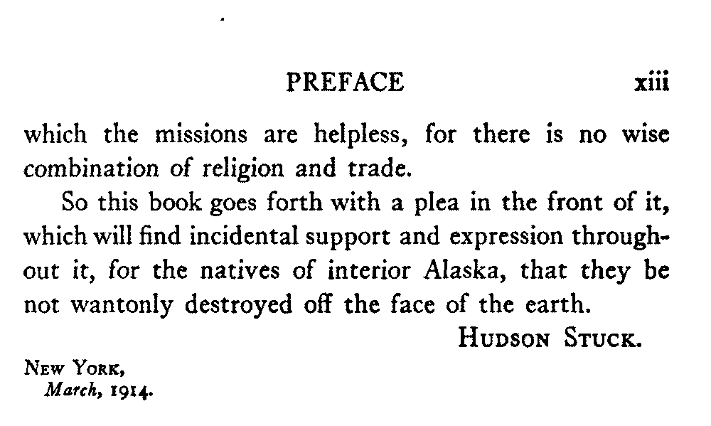 So this book goes forth with a plea in the front of it, which will find incidental support and expression throughout it, for the natives of interior Alaska, that they be not wantonly destroyed off the face of the earth.