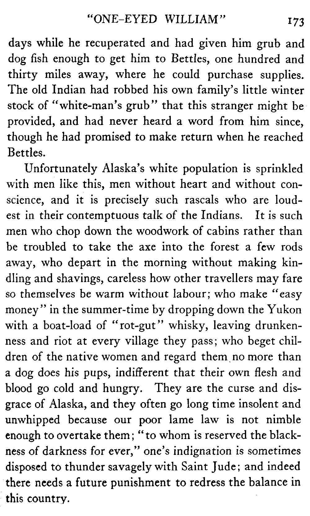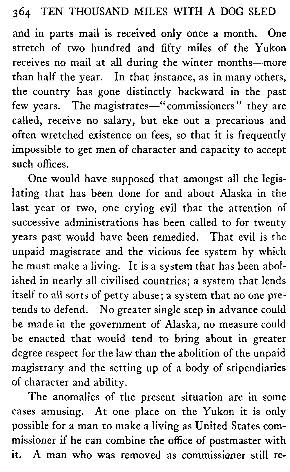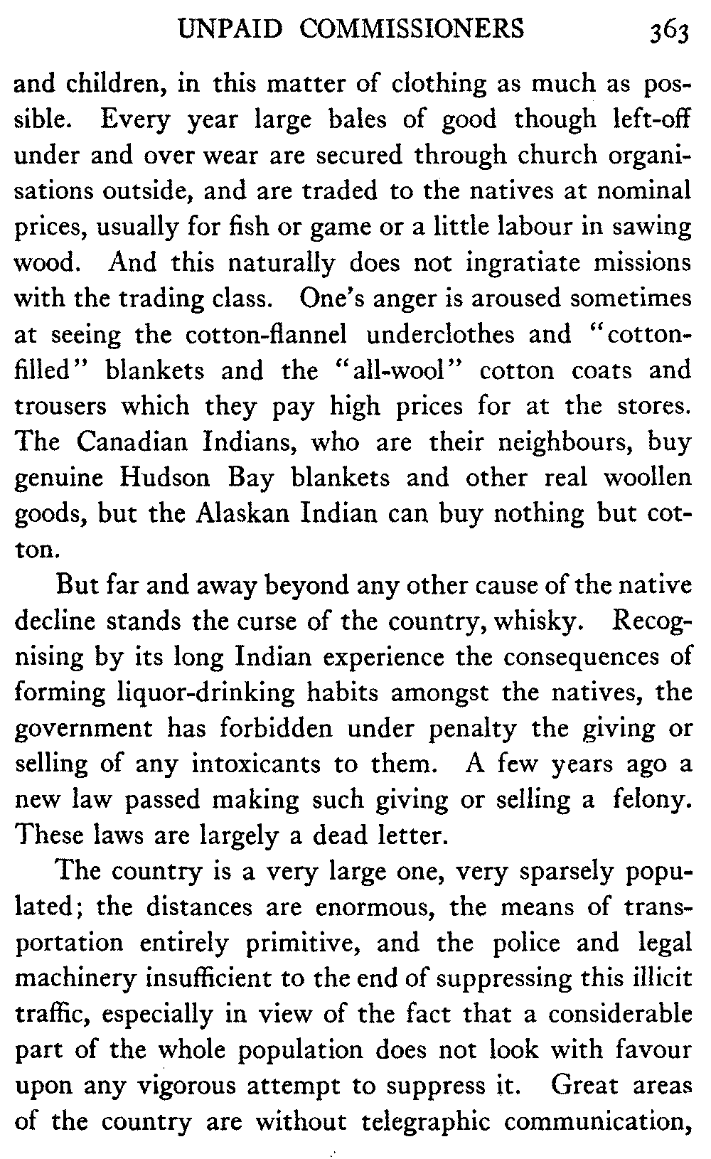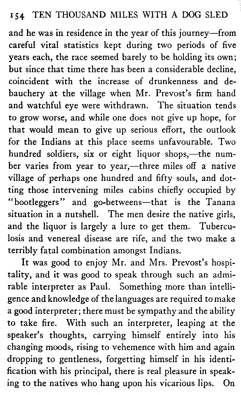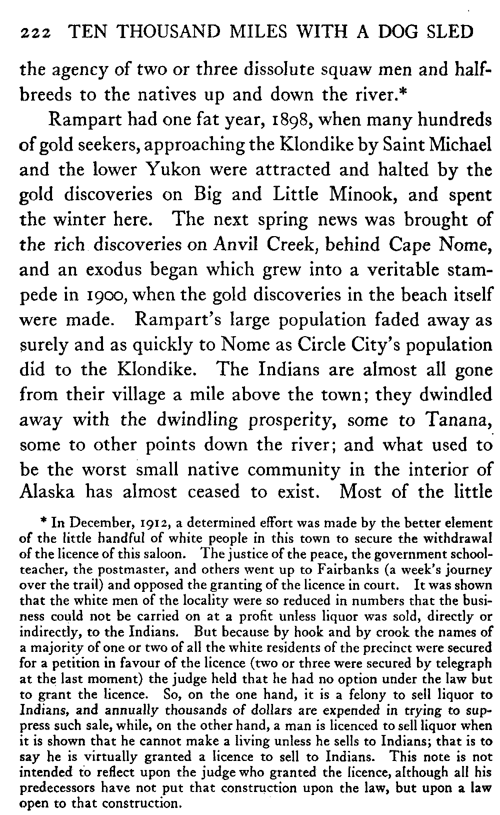 [C] In December, , a determined effort was made by the better element of the little handful of white people in this town to secure the withdrawal of the licence of this saloon. The justice of the peace, the government school-teacher, the postmaster, and others went up to Fairbanks (a week's journey over the trail) and opposed the granting of the licence in court. It was shown that the white men of the locality were so reduced in numbers that the business could not be carried on at a profit unless liquor was sold, directly or indirectly, to the Indians. But because by hook and by crook the names of a majority of one or two of all the white residents of the precinct were secured for a petition in favour of the licence (two or three were secured by telegraph at the last moment) the judge held that he had no option under the law but to grant the licence. So, on the one hand, it is a felony to sell liquor to Indians, and annually thousands of dollars are expended in trying to suppress such sale, while, on the other hand, a man is licenced to sell liquor when it is shown that he cannot make a living unless he sells to Indians; that is to say he is virtually granted a licence to sell to Indians. This note is not intended to reflect upon the judge who granted the licence, although all his predecessors have not put that construction upon the law, but upon a law open to that construction.