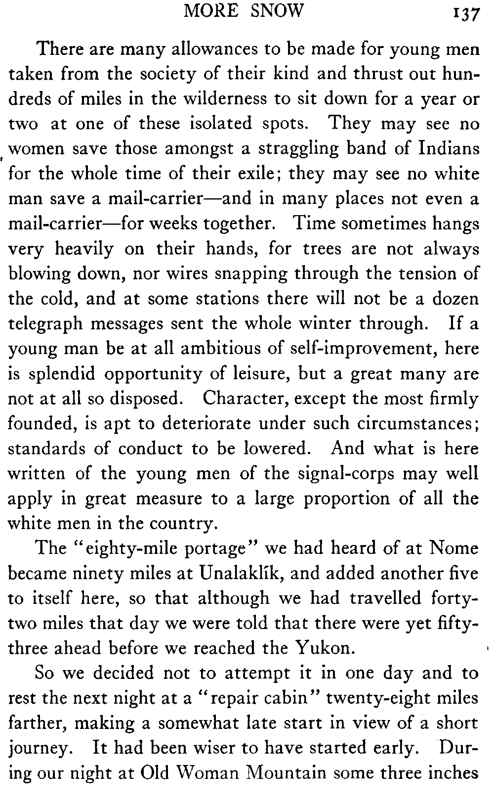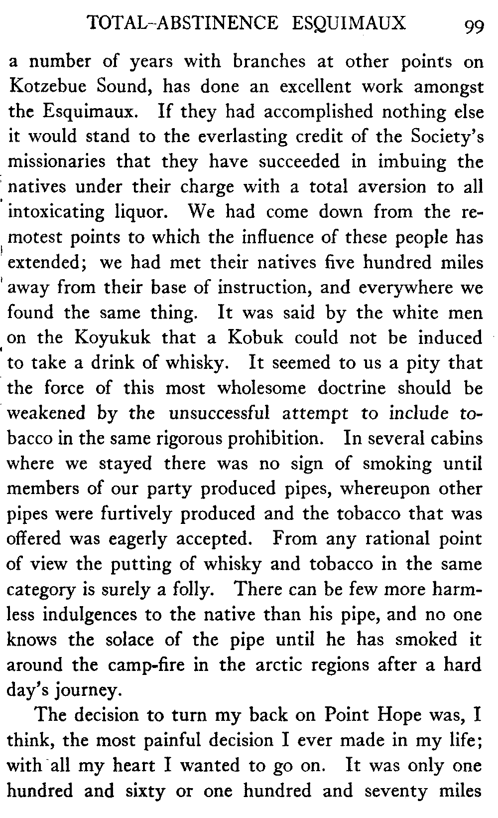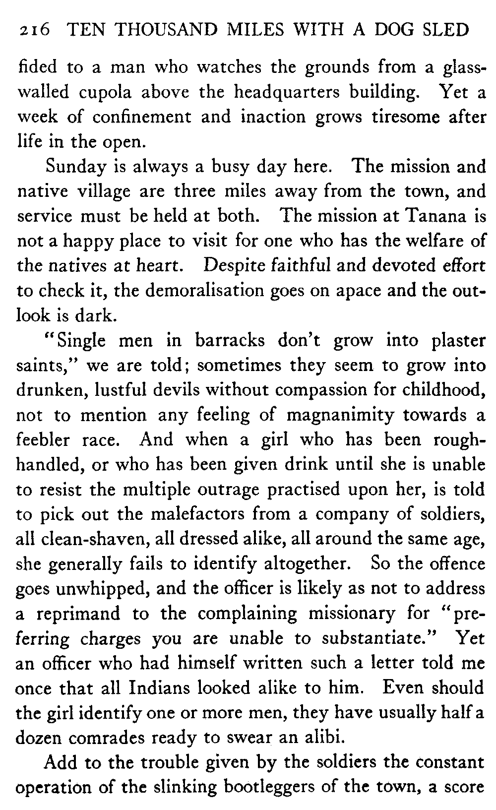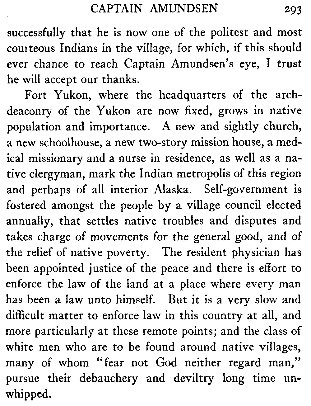 [C] In December, , a determined effort was made by the better element of the little handful of white people in this town to secure the withdrawal of the licence of this saloon. The justice of the peace, the government school-teacher, the postmaster, and others went up to Fairbanks (a week's journey over the trail) and opposed the granting of the licence in court. It was shown that the white men of the locality were so reduced in numbers that the business could not be carried on at a profit unless liquor was sold, directly or indirectly, to the Indians. But because by hook and by crook the names of a majority of one or two of all the white residents of the precinct were secured for a petition in favour of the licence (two or three were secured by telegraph at the last moment) the judge held that he had no option under the law but to grant the licence. So, on the one hand, it is a felony to sell liquor to Indians, and annually thousands of dollars are expended in trying to suppress such sale, while, on the other hand, a man is licenced to sell liquor when it is shown that he cannot make a living unless he sells to Indians; that is to say he is virtually granted a licence to sell to Indians. This note is not intended to reflect upon the judge who granted the licence, although all his predecessors have not put that construction upon the law, but upon a law open to that construction.