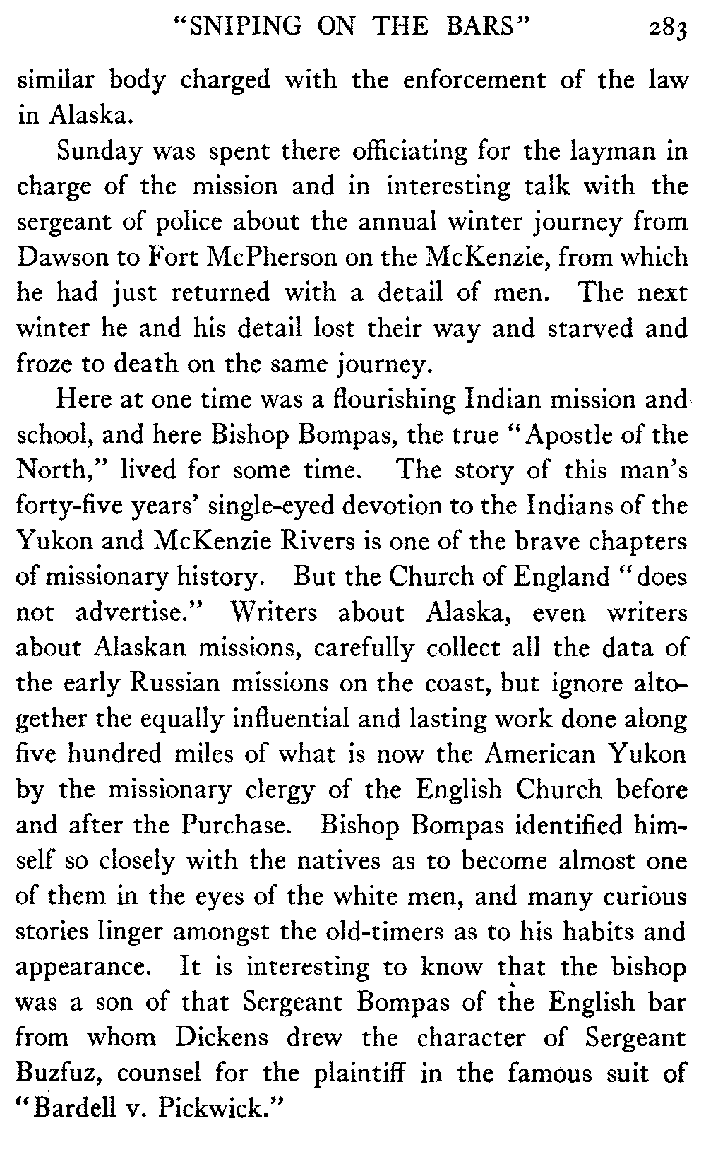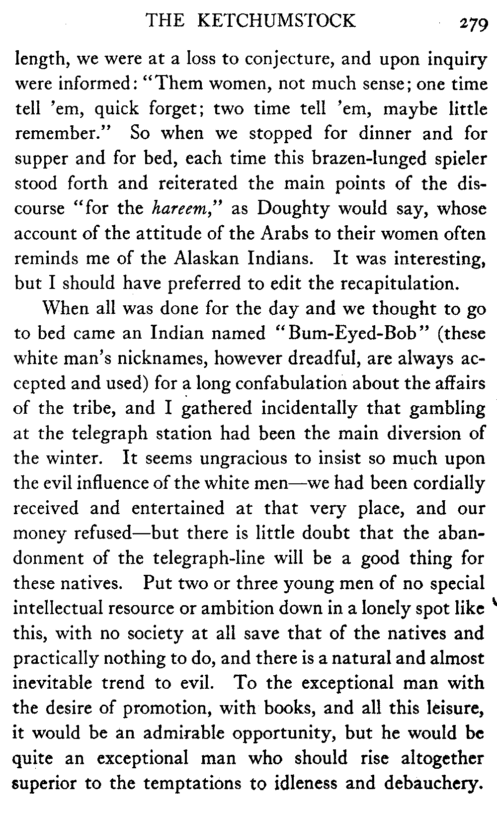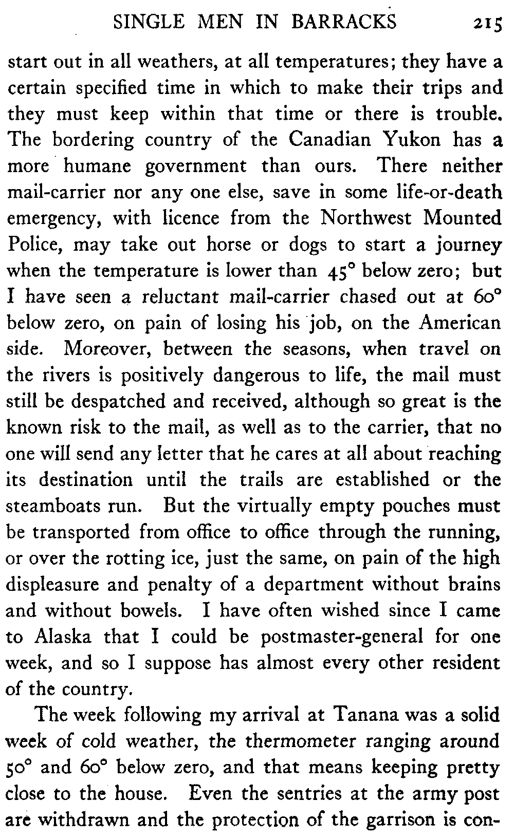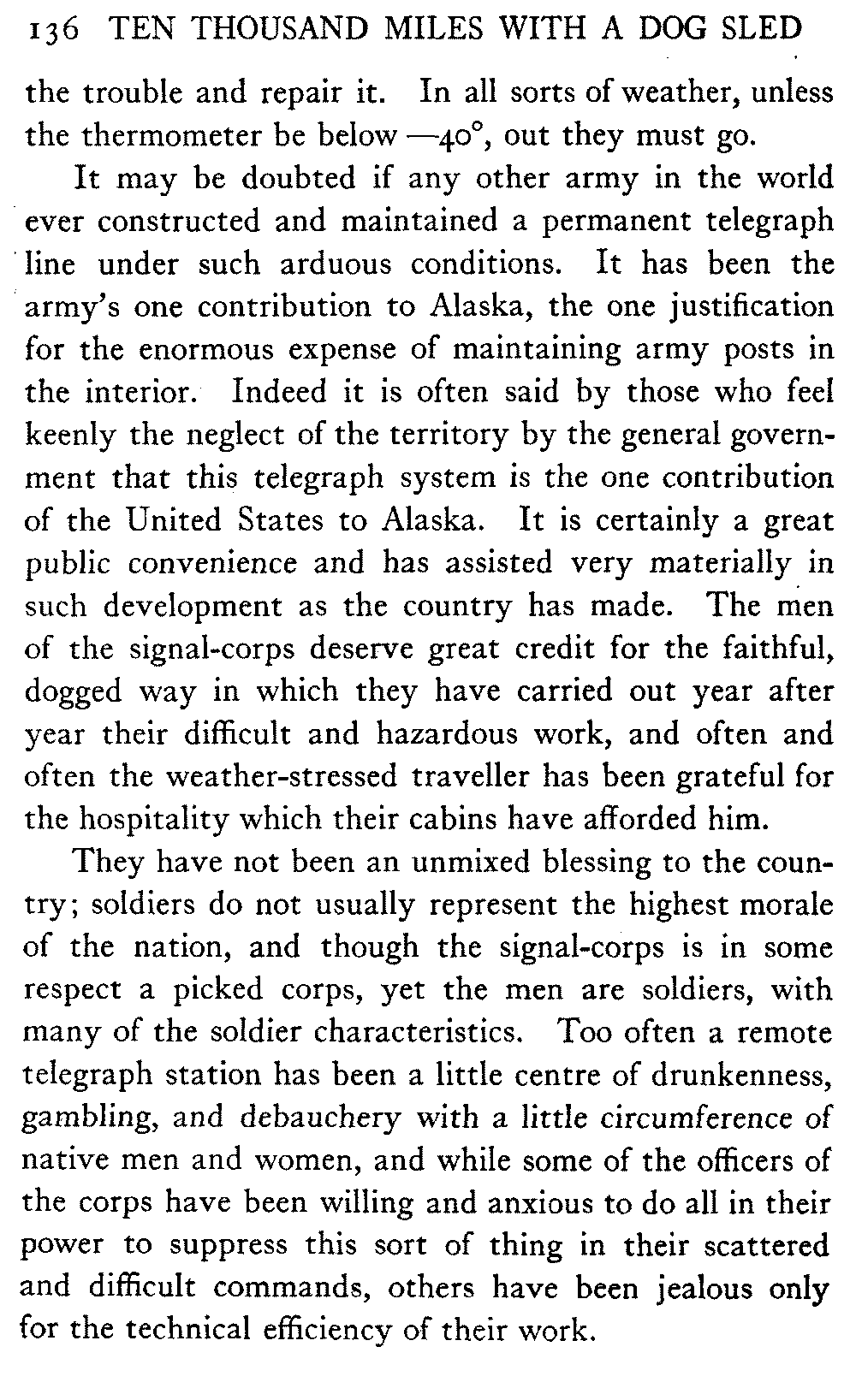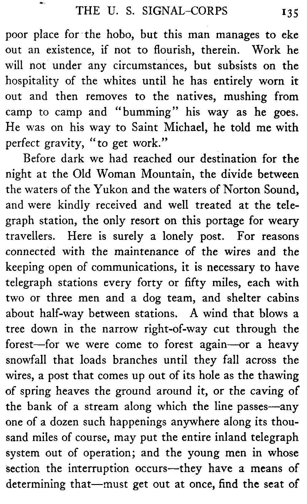 [C] In December, , a determined effort was made by the better element of the little handful of white people in this town to secure the withdrawal of the licence of this saloon. The justice of the peace, the government school-teacher, the postmaster, and others went up to Fairbanks (a week's journey over the trail) and opposed the granting of the licence in court. It was shown that the white men of the locality were so reduced in numbers that the business could not be carried on at a profit unless liquor was sold, directly or indirectly, to the Indians. But because by hook and by crook the names of a majority of one or two of all the white residents of the precinct were secured for a petition in favour of the licence (two or three were secured by telegraph at the last moment) the judge held that he had no option under the law but to grant the licence. So, on the one hand, it is a felony to sell liquor to Indians, and annually thousands of dollars are expended in trying to suppress such sale, while, on the other hand, a man is licenced to sell liquor when it is shown that he cannot make a living unless he sells to Indians; that is to say he is virtually granted a licence to sell to Indians. This note is not intended to reflect upon the judge who granted the licence, although all his predecessors have not put that construction upon the law, but upon a law open to that construction.