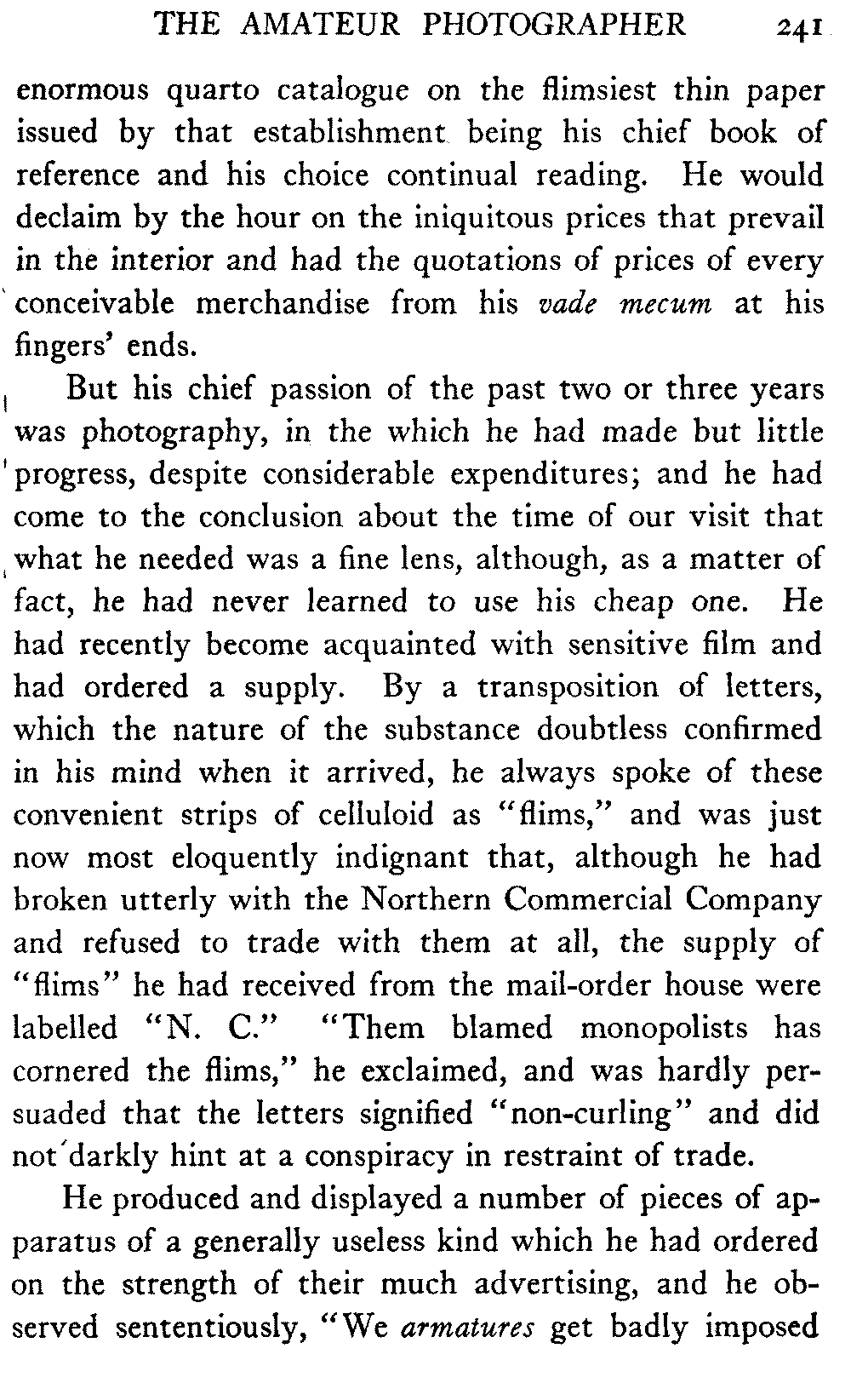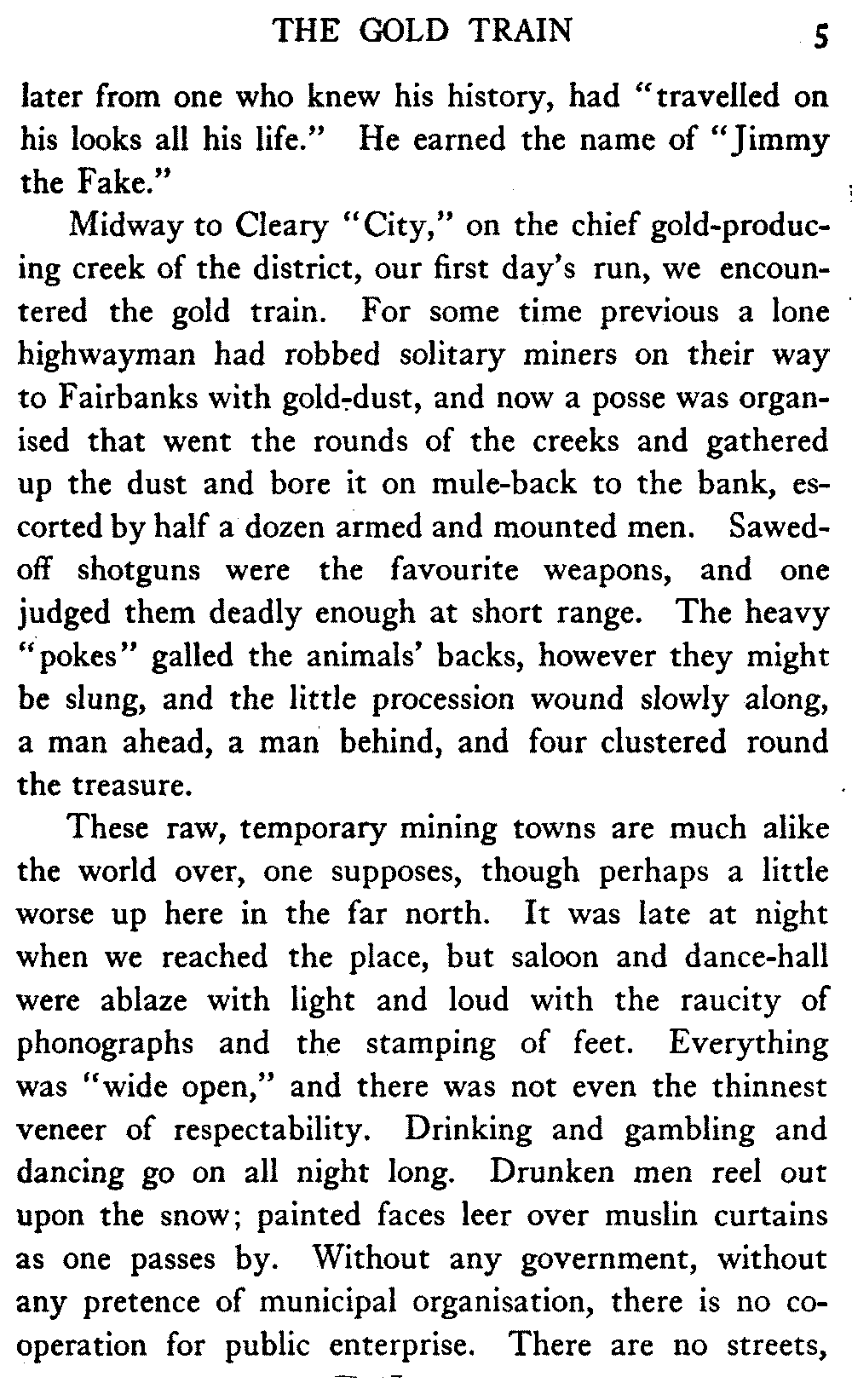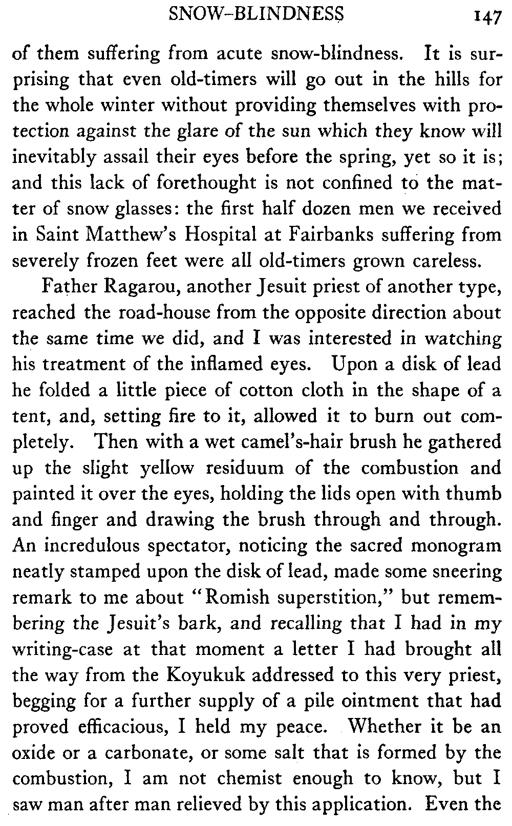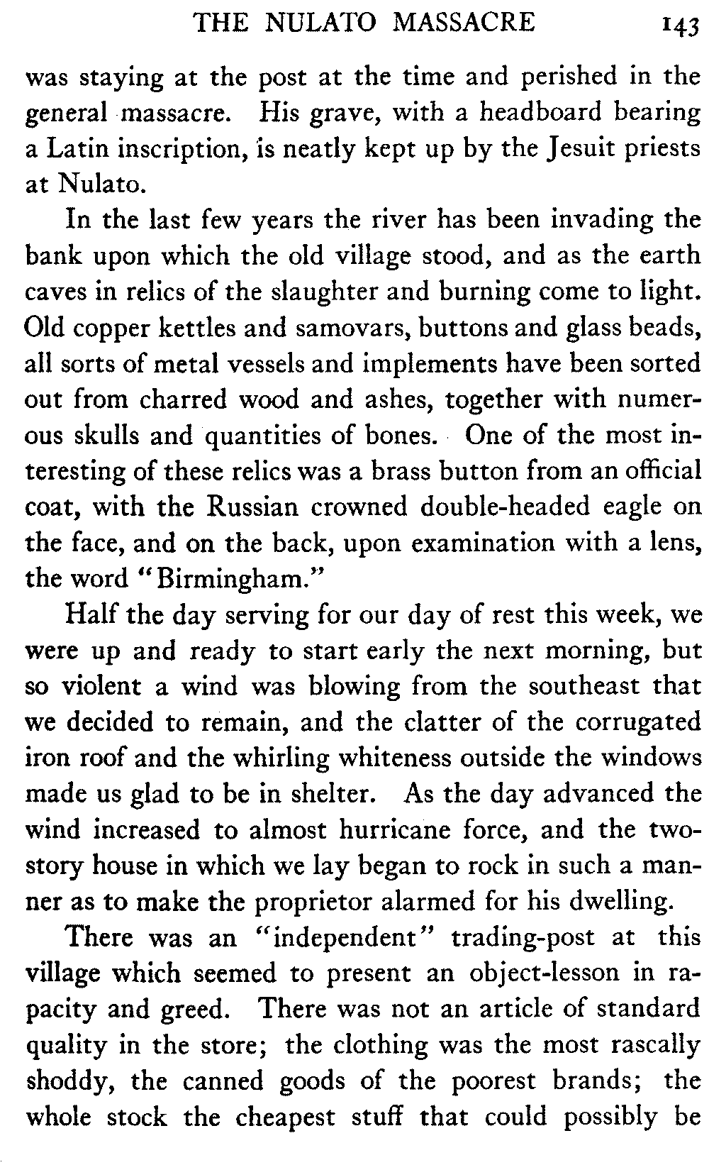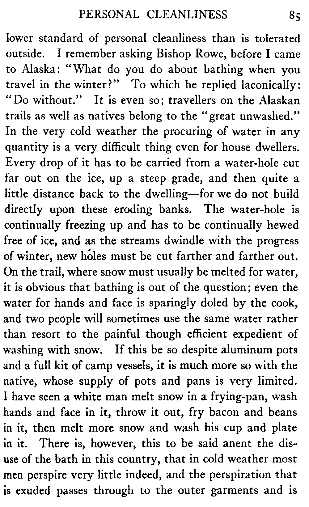 [C] In December, , a determined effort was made by the better element of the little handful of white people in this town to secure the withdrawal of the licence of this saloon. The justice of the peace, the government school-teacher, the postmaster, and others went up to Fairbanks (a week's journey over the trail) and opposed the granting of the licence in court. It was shown that the white men of the locality were so reduced in numbers that the business could not be carried on at a profit unless liquor was sold, directly or indirectly, to the Indians. But because by hook and by crook the names of a majority of one or two of all the white residents of the precinct were secured for a petition in favour of the licence (two or three were secured by telegraph at the last moment) the judge held that he had no option under the law but to grant the licence. So, on the one hand, it is a felony to sell liquor to Indians, and annually thousands of dollars are expended in trying to suppress such sale, while, on the other hand, a man is licenced to sell liquor when it is shown that he cannot make a living unless he sells to Indians; that is to say he is virtually granted a licence to sell to Indians. This note is not intended to reflect upon the judge who granted the licence, although all his predecessors have not put that construction upon the law, but upon a law open to that construction.