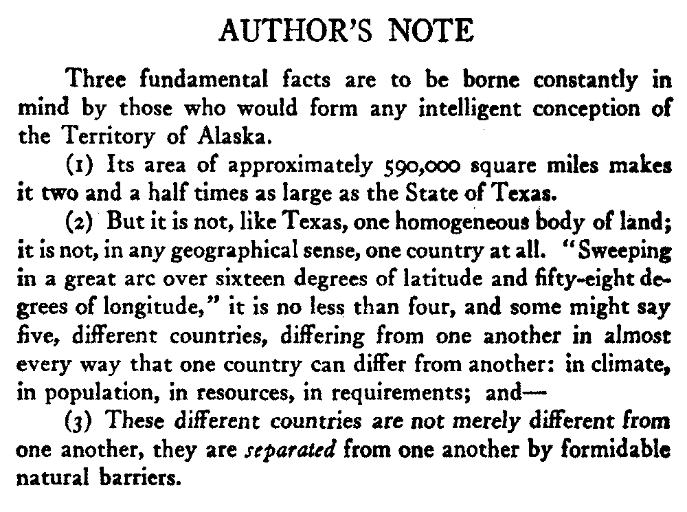 Truth, however, is not more wont than of old to be found in extremes, and the author of this book believes that those who desire a sober view of the country it deals with will find it herein. He claims no more than that he has had adequate opportunity of forming his opinions and that he has a right to their expression. It is now twelve years since he began almost constant travelling, winter and summer, in the interior of Alaska. He has described nothing that he has not seen; ventured no judgment that he has not well digested, and has nothing to retract or even modify; but he would repeat and emphasise a caution of the original preface. Alaska is not one country but many countries, and so widely do they differ from one another in almost every respect[xvii] that no general statements about Alaska can be true. The present author's knowledge of the territory is confined in the main to the interior—to the valley of the Yukon and its tributary rivers, which make up one of the world's great waterways—and nothing of his writing applies, with his authority, to other parts.