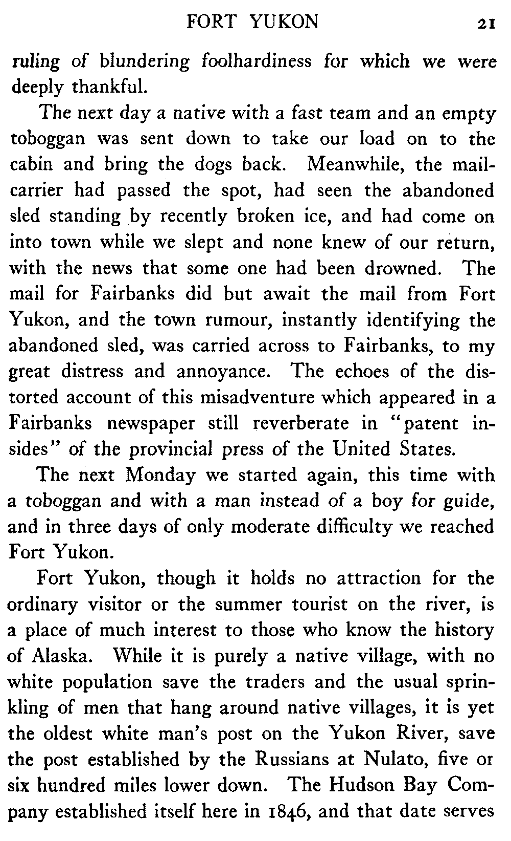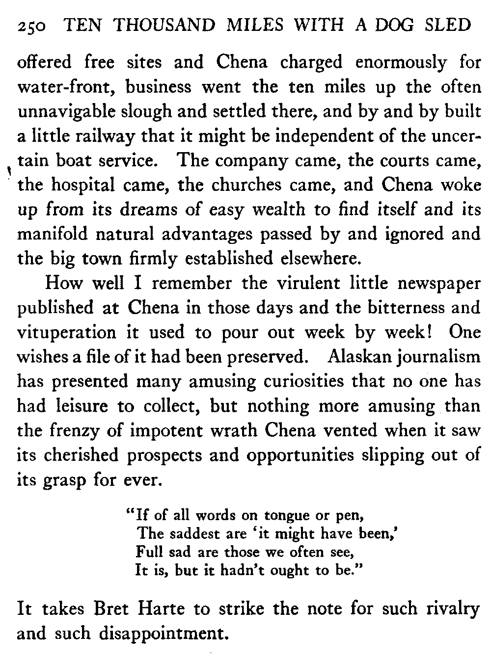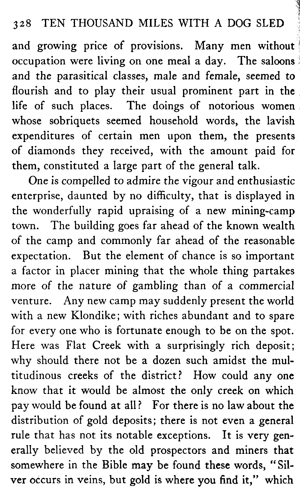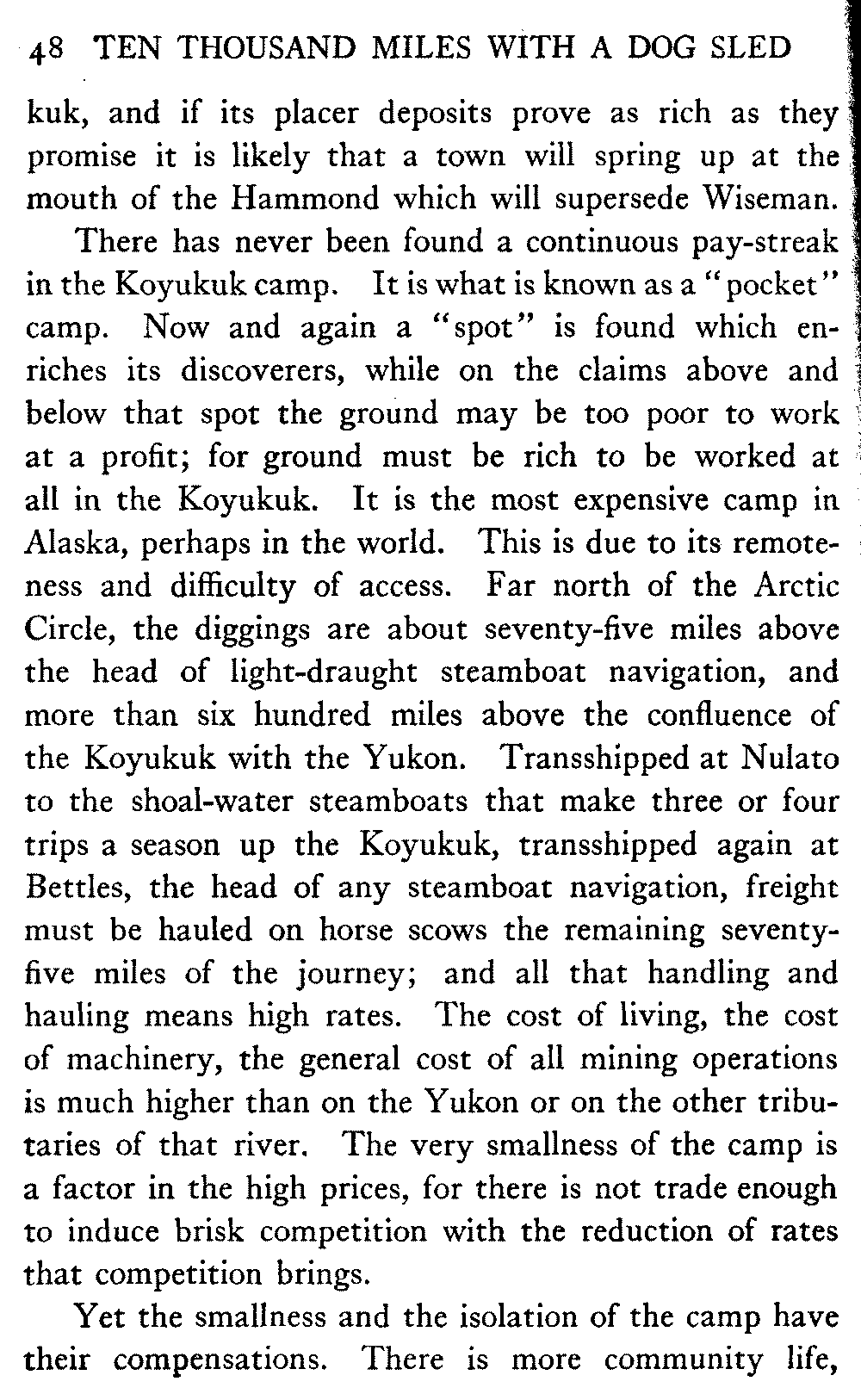 And in the North itself—though no one there would write about the timber resources of the interior—in certain shrill journals the man who does not confidently expect to see the Yukon Flats waving with golden grain and "the lowing herd wind slowly o'er the lea" of the Koyukuk and the Chandalar is regarded as a traitor to his country and his God. But it must be remembered that there are a number of journalists in Alaska who know nothing of the country outside their respective towns, and that "boosting" grows shriller, as Eugene Field found red paint grow redder, "the further out West one goes." When they get a newspaper at Cape Prince of Wales what a clarion it will be!