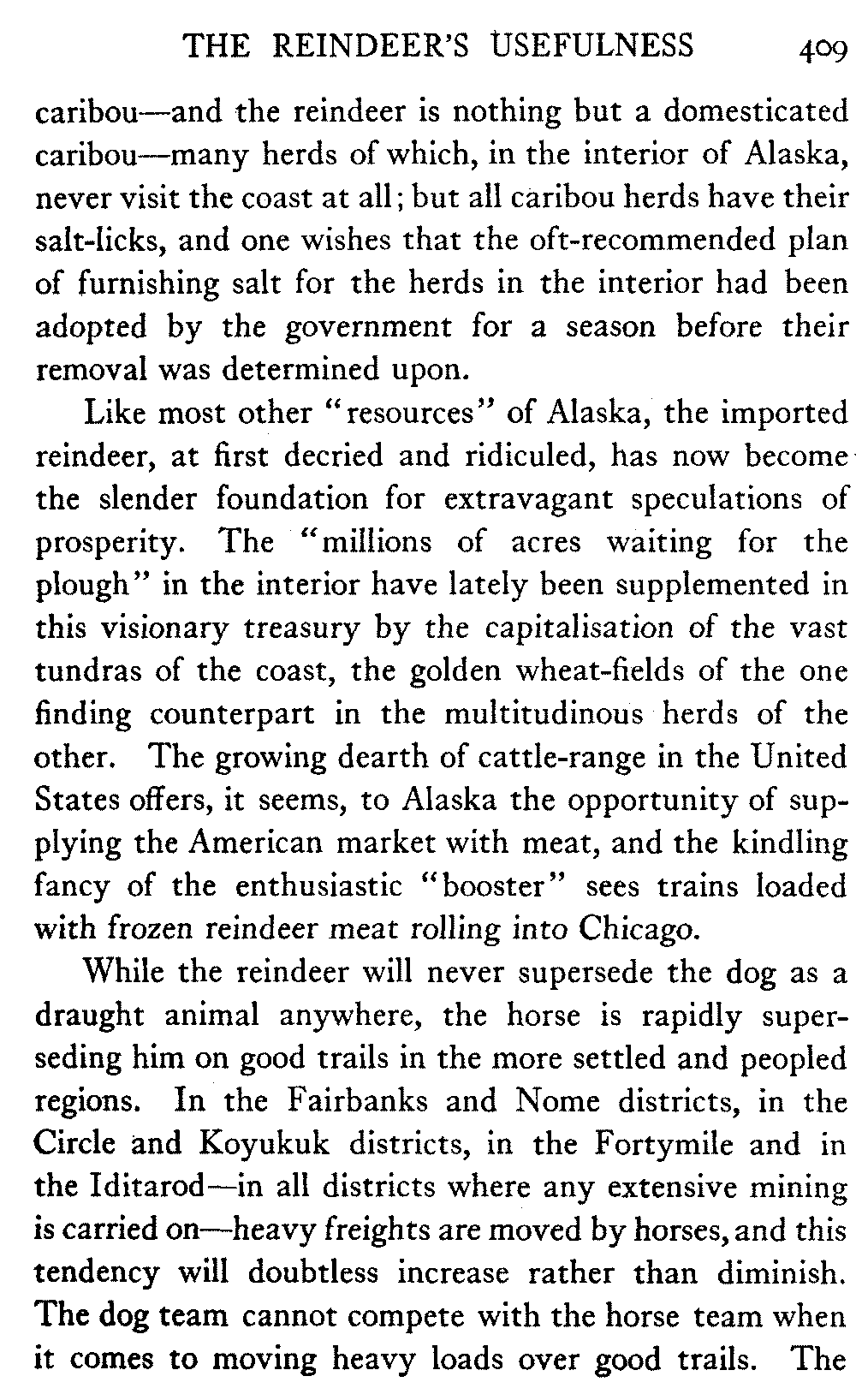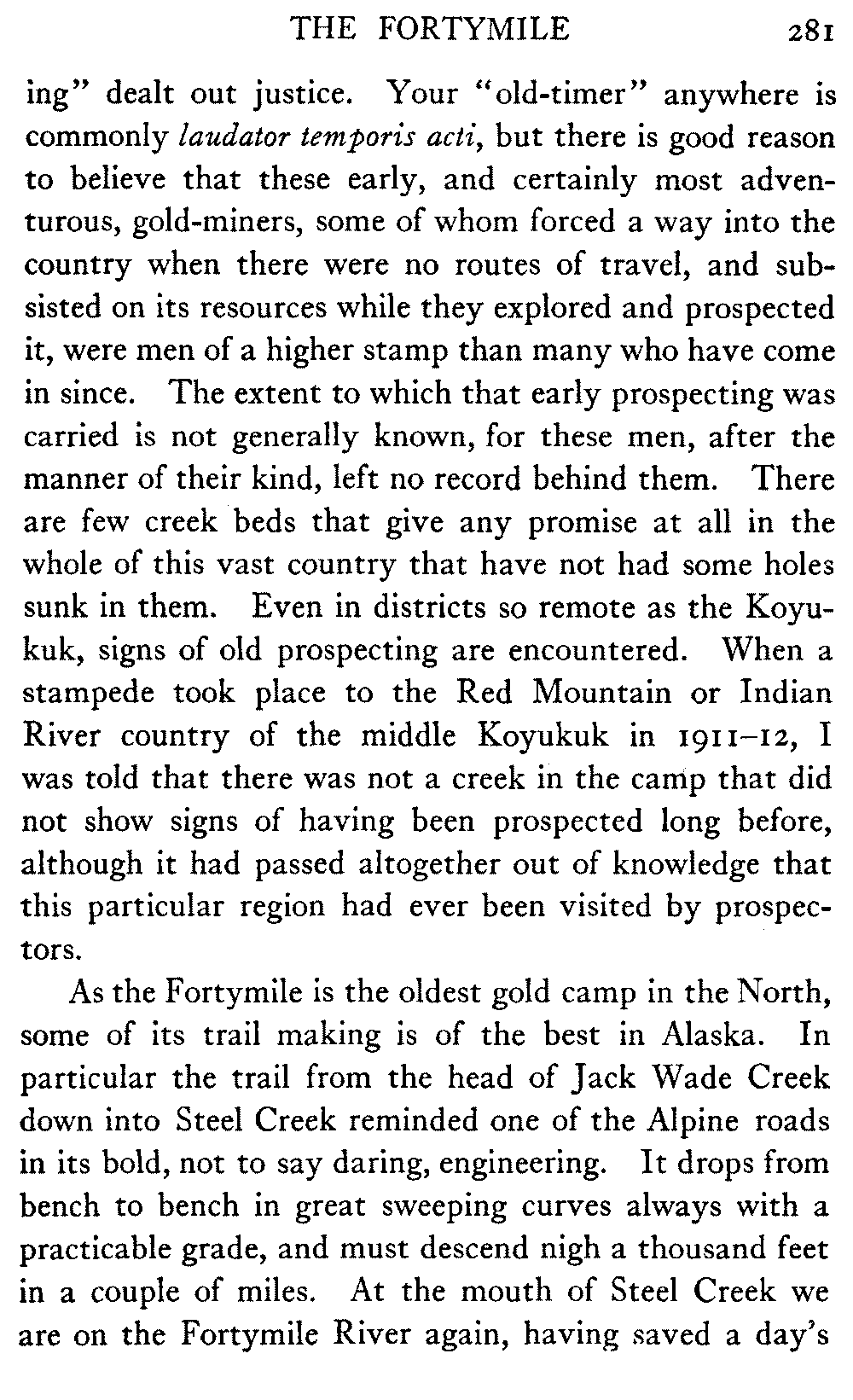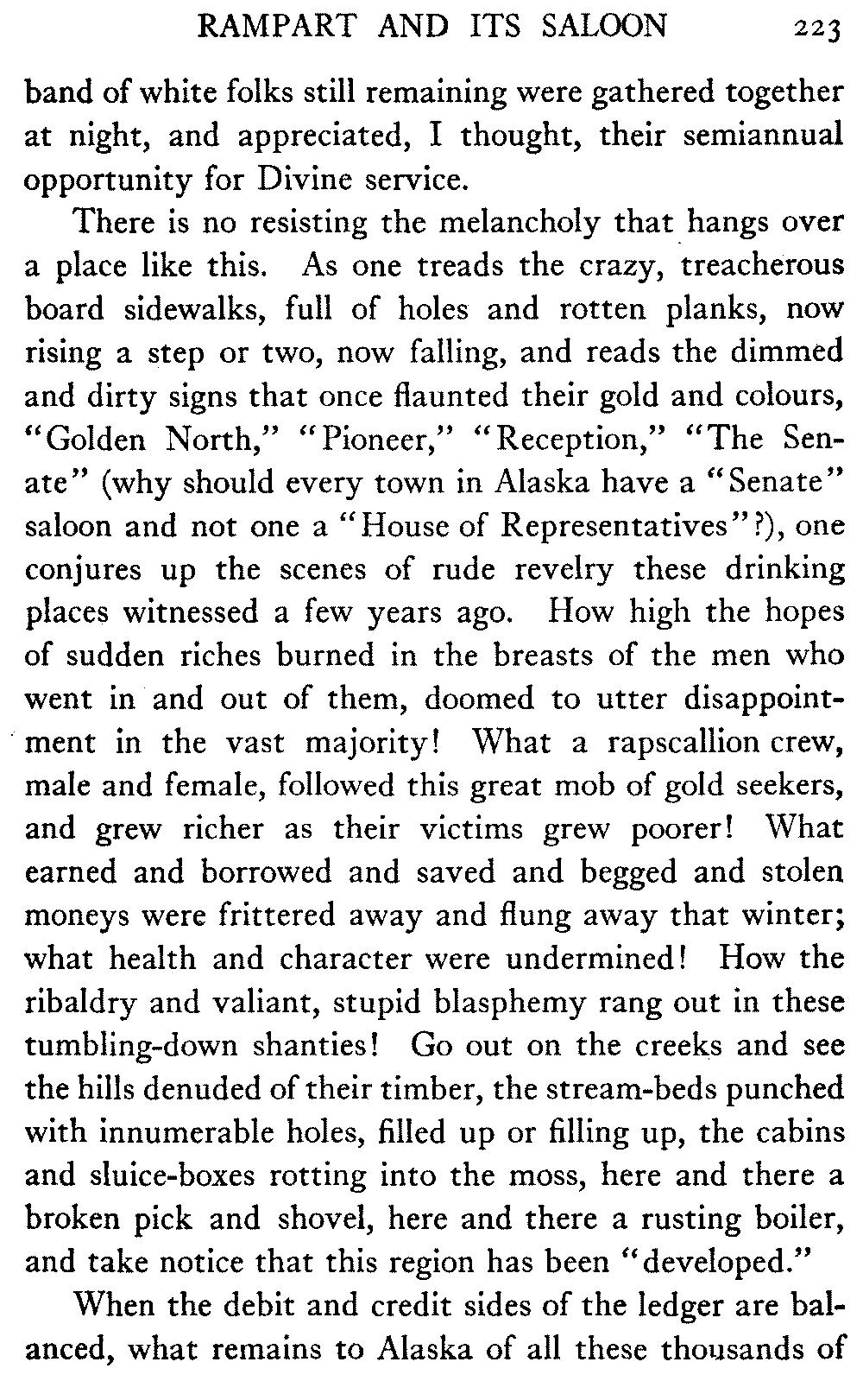 And in the North itself—though no one there would write about the timber resources of the interior—in certain shrill journals the man who does not confidently expect to see the Yukon Flats waving with golden grain and "the lowing herd wind slowly o'er the lea" of the Koyukuk and the Chandalar is regarded as a traitor to his country and his God. But it must be remembered that there are a number of journalists in Alaska who know nothing of the country outside their respective towns, and that "boosting" grows shriller, as Eugene Field found red paint grow redder, "the further out West one goes." When they get a newspaper at Cape Prince of Wales what a clarion it will be!