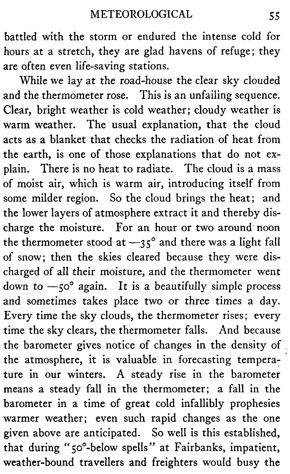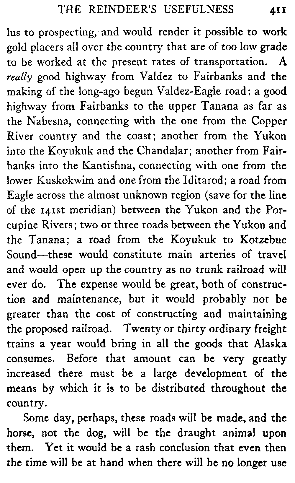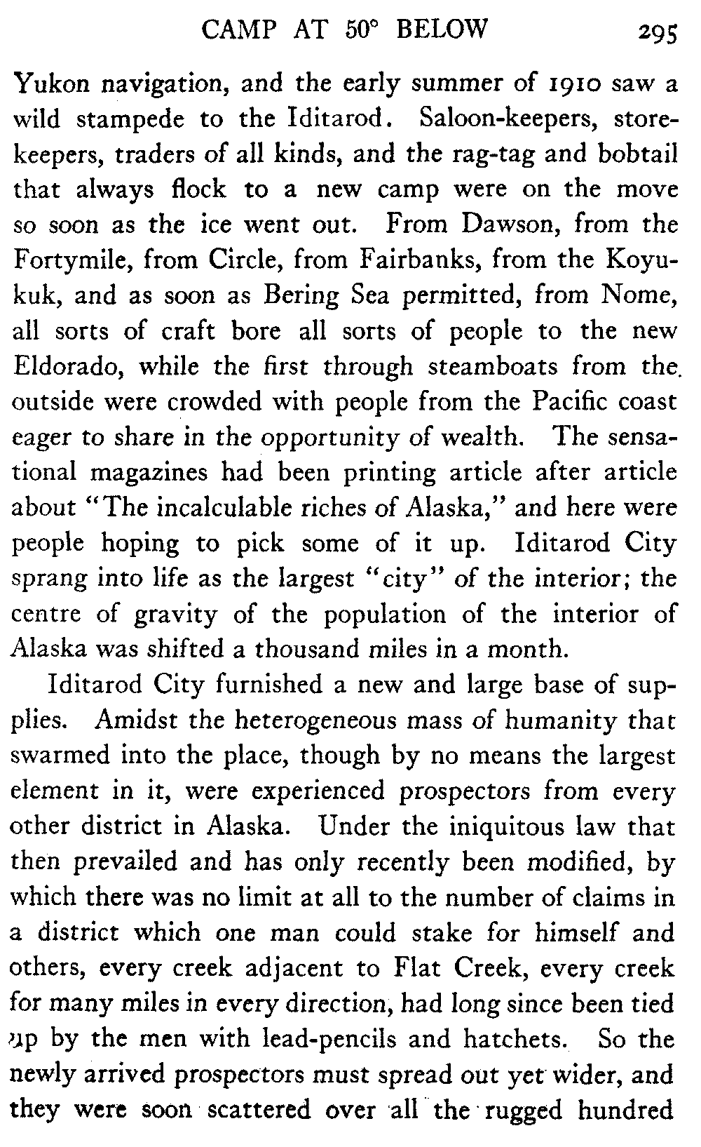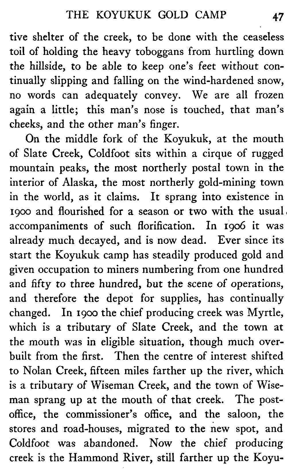 And in the North itself—though no one there would write about the timber resources of the interior—in certain shrill journals the man who does not confidently expect to see the Yukon Flats waving with golden grain and "the lowing herd wind slowly o'er the lea" of the Koyukuk and the Chandalar is regarded as a traitor to his country and his God. But it must be remembered that there are a number of journalists in Alaska who know nothing of the country outside their respective towns, and that "boosting" grows shriller, as Eugene Field found red paint grow redder, "the further out West one goes." When they get a newspaper at Cape Prince of Wales what a clarion it will be!