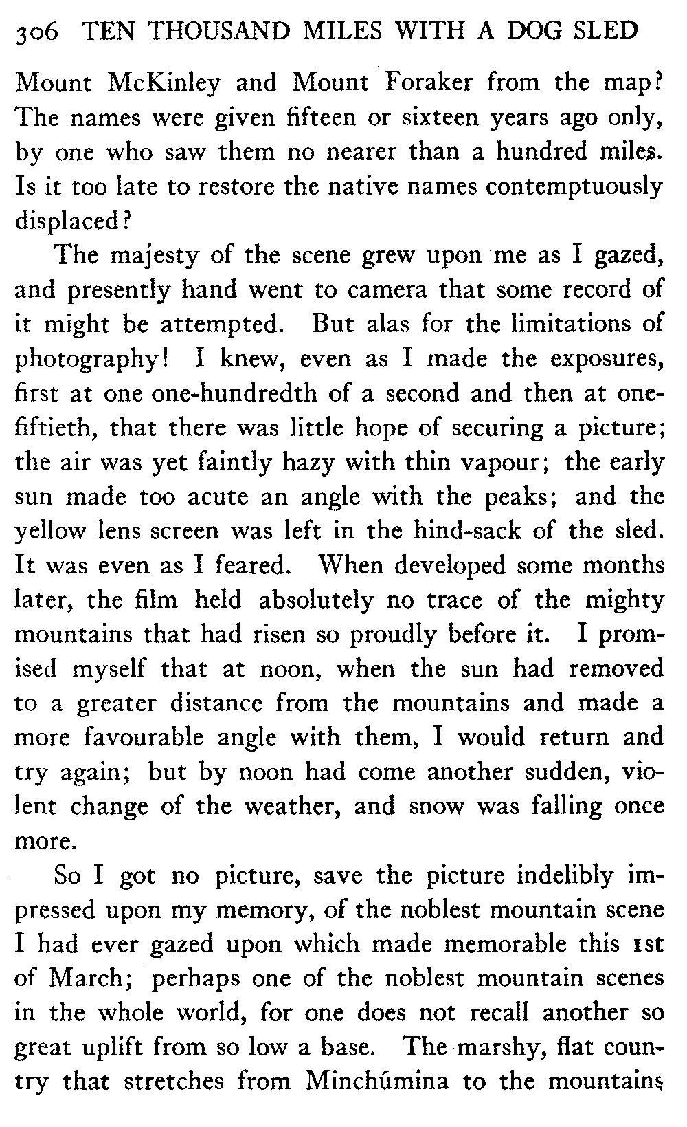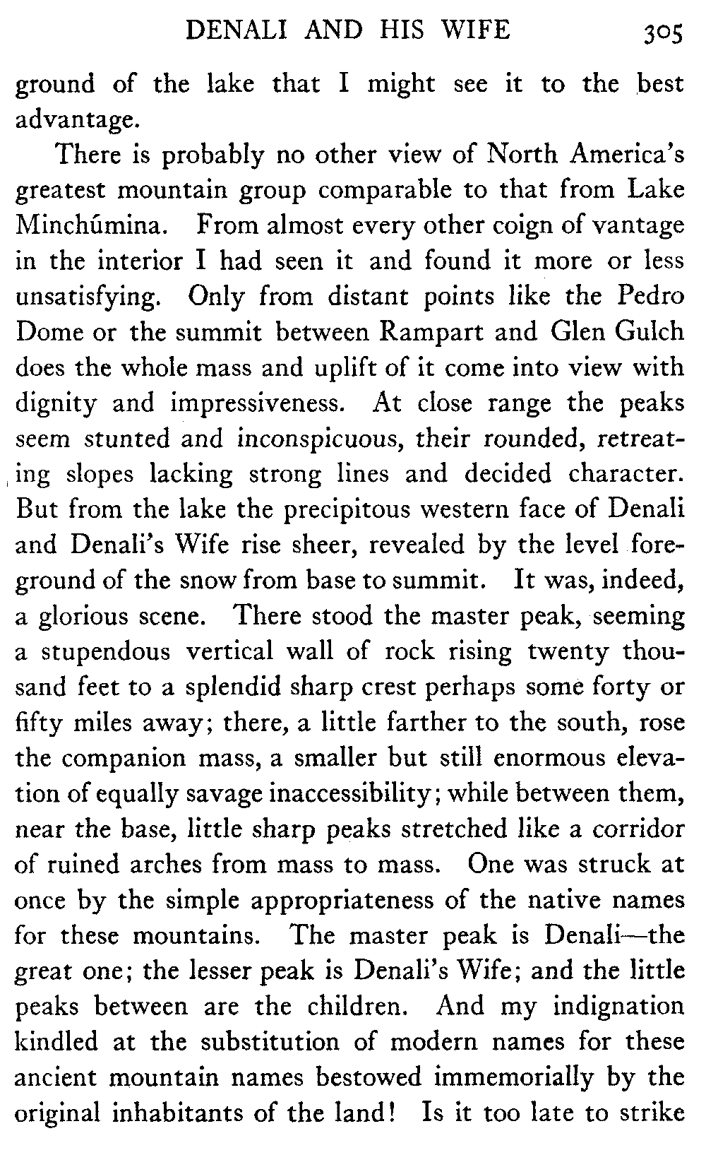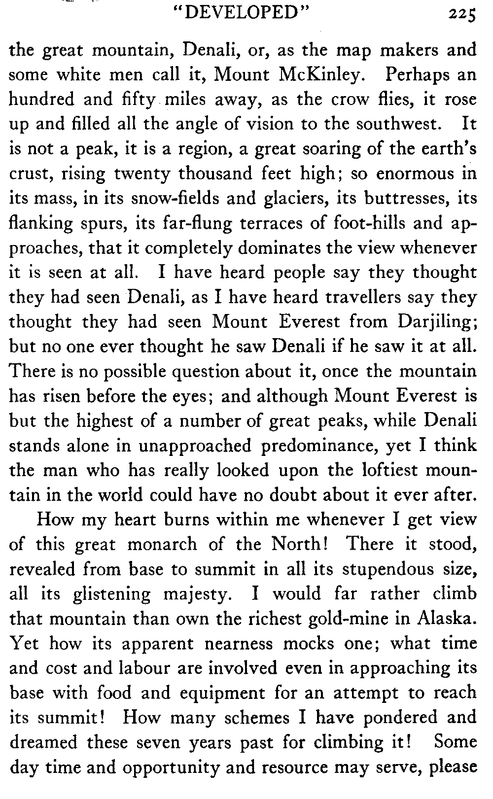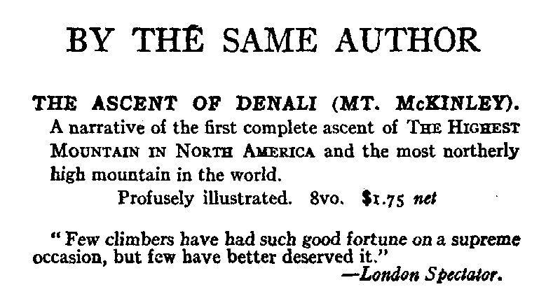 [D] This was written some two years before the opportunity came. On the 7th of June, 1913, the writer and three companions reached the summit of Denali. ("The Ascent of Denali," Charles Scribner's Sons, 1914.)