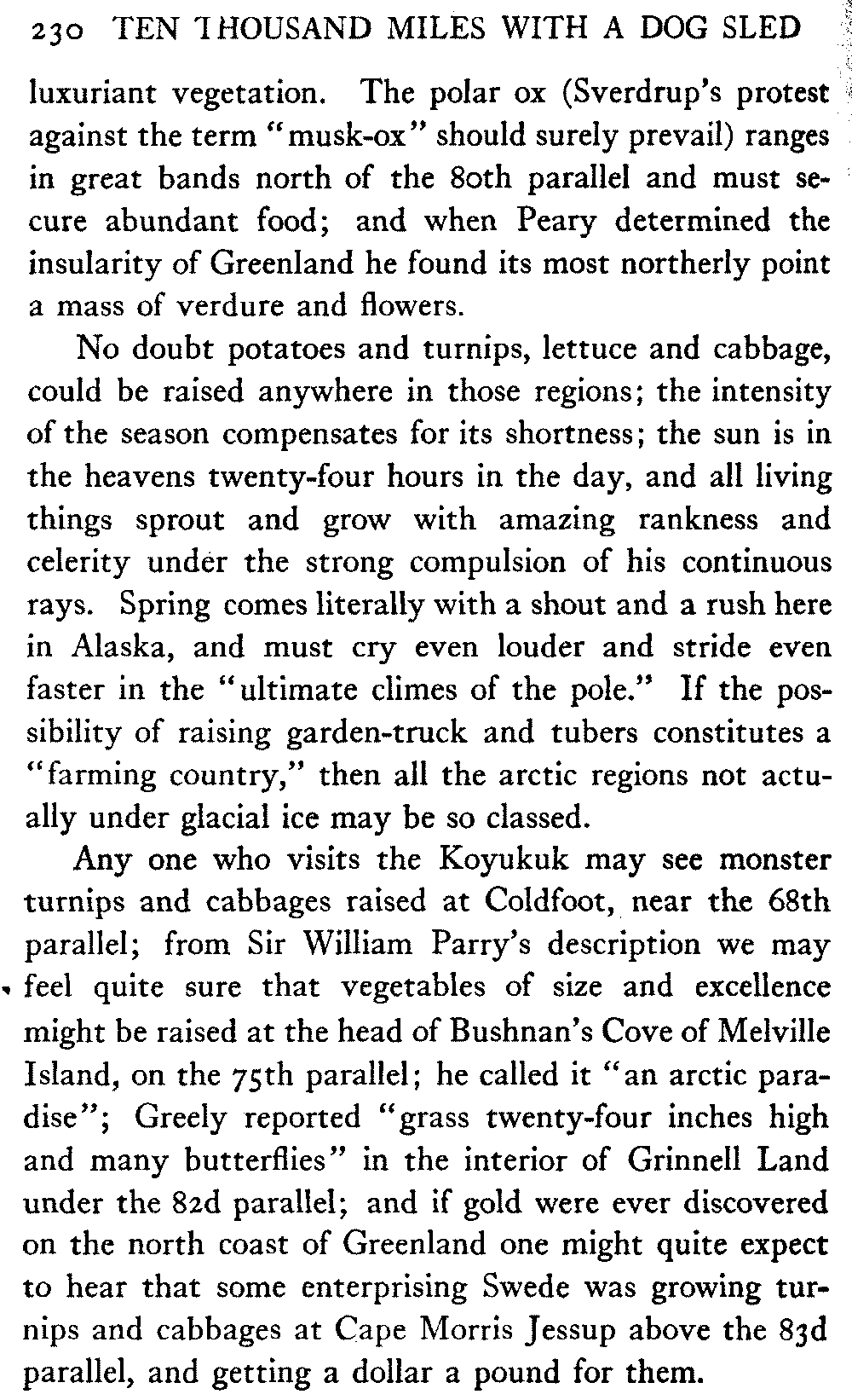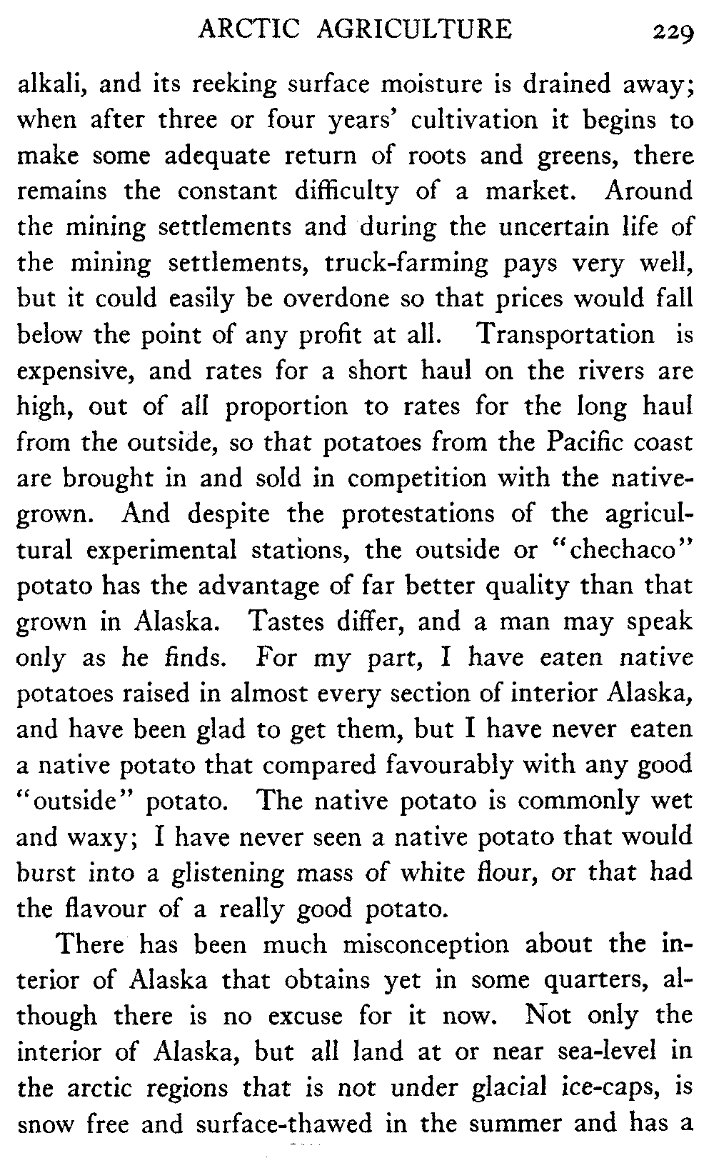 Common opinion "outside" about Alaska seems to be veering from the view that it is a land of perpetual snow and ice to the other extreme of holding it to be a "world's treasure-house" of mineral wealth and agricultural possibility. The world's treasure is deposited in many houses, and Alaska has its share; its mineral wealth is very great, and "hidden doors of opulence" may open at any time, but its agricultural possibilities, in the ordinary sense in which the phrase is used, are confined to very small areas in proportion to the enormous whole, and in very limited degree.