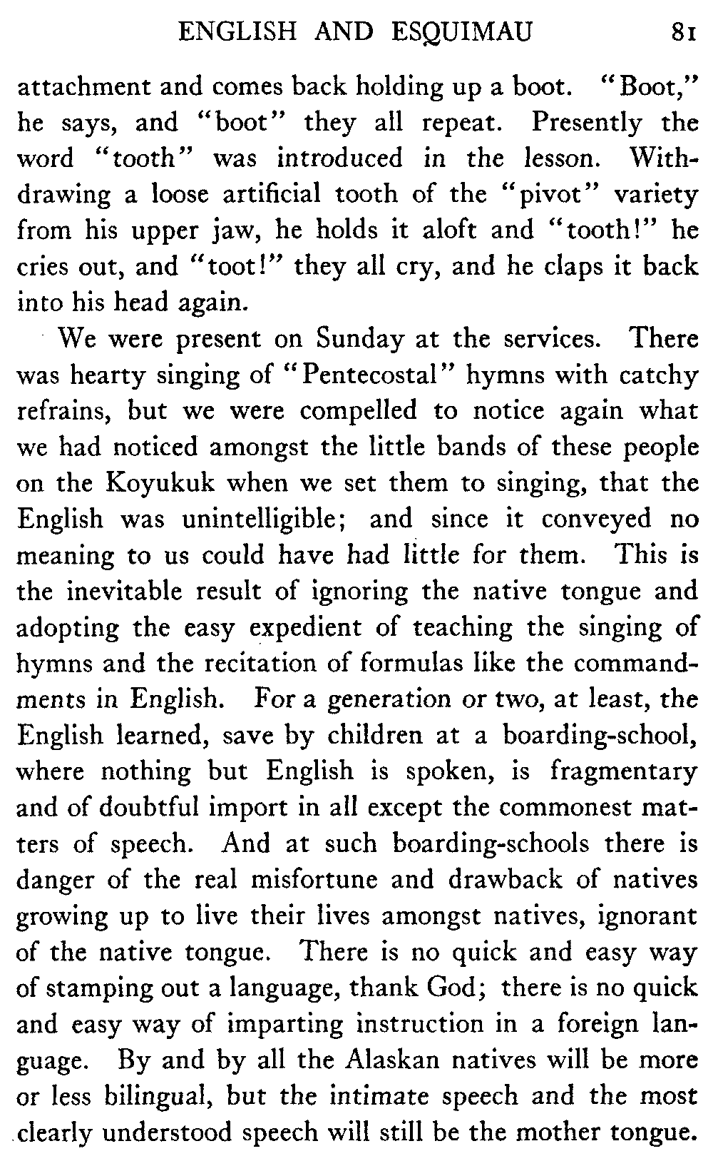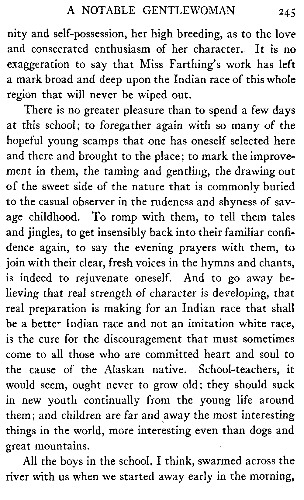There are, of course, those who view with perfect equanimity the destruction of the natives that is now going on, and look forward with complacency to the time when the Alaskan Indian shall have ceased to exist. But to men of thought and feeling such cynicism is abhorrent, and the duty of the government towards its simple and kindly wards is clear.