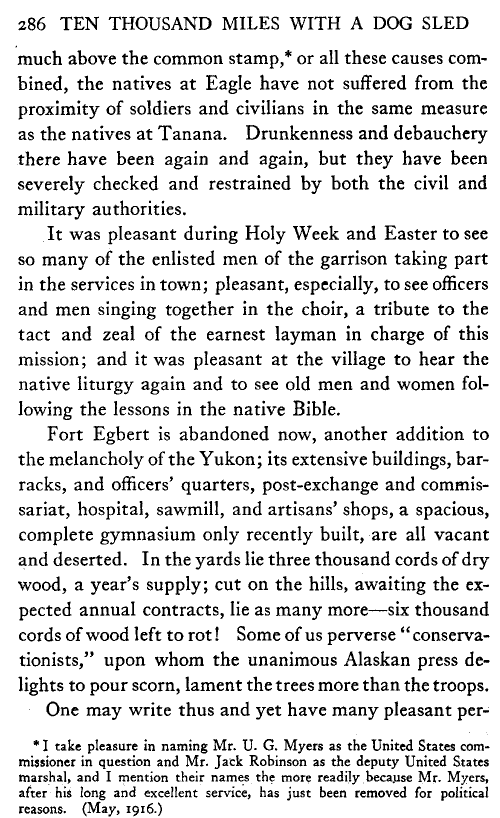 [F] I take pleasure in naming Mr. U. G. Myers as the United States commissioner in question and Mr. Jack Robinson as the deputy United States marshal, and I mention their names the more readily because Mr. Myers, after his long and excellent service, has just been removed for political reasons. (May, 1916.)