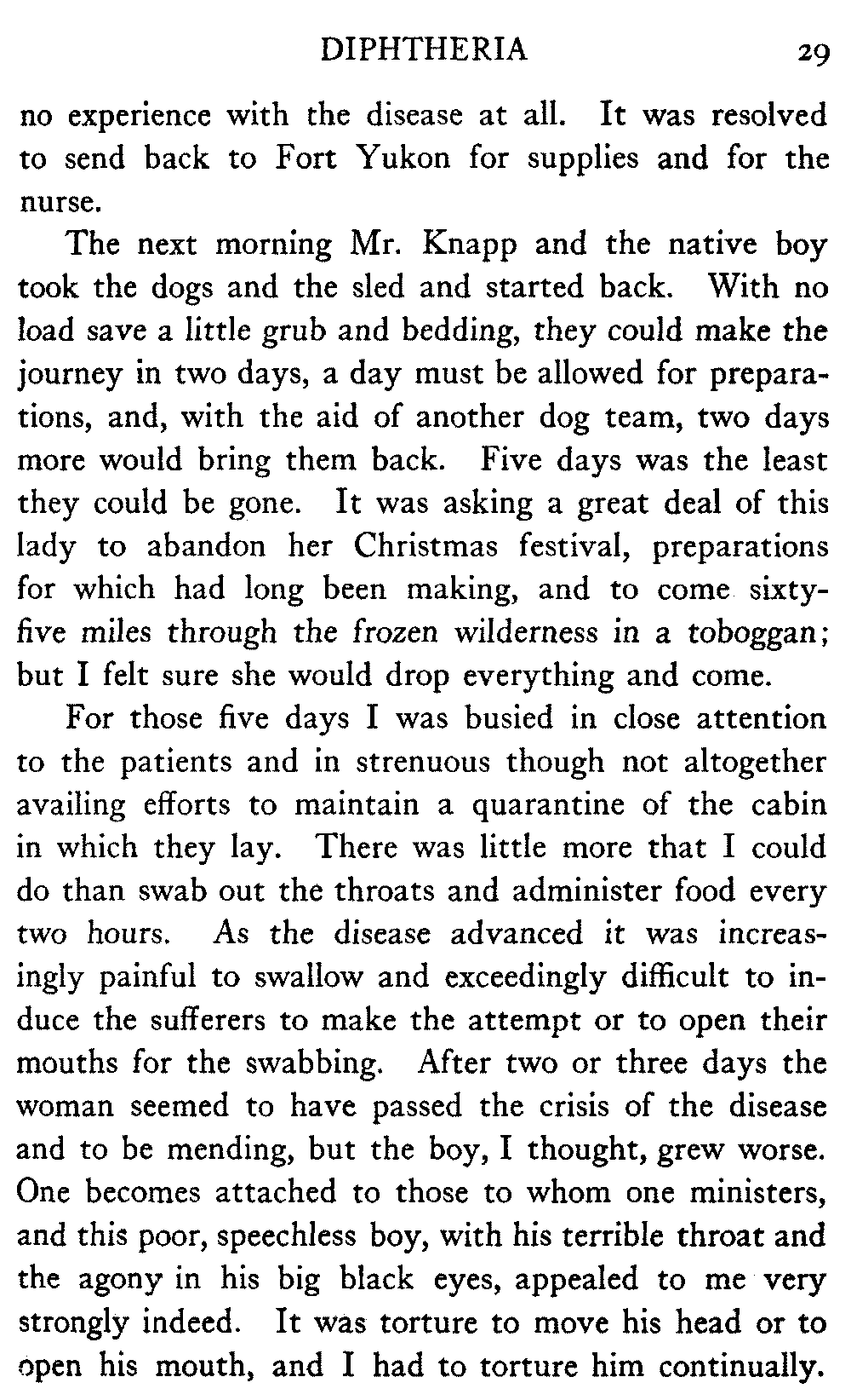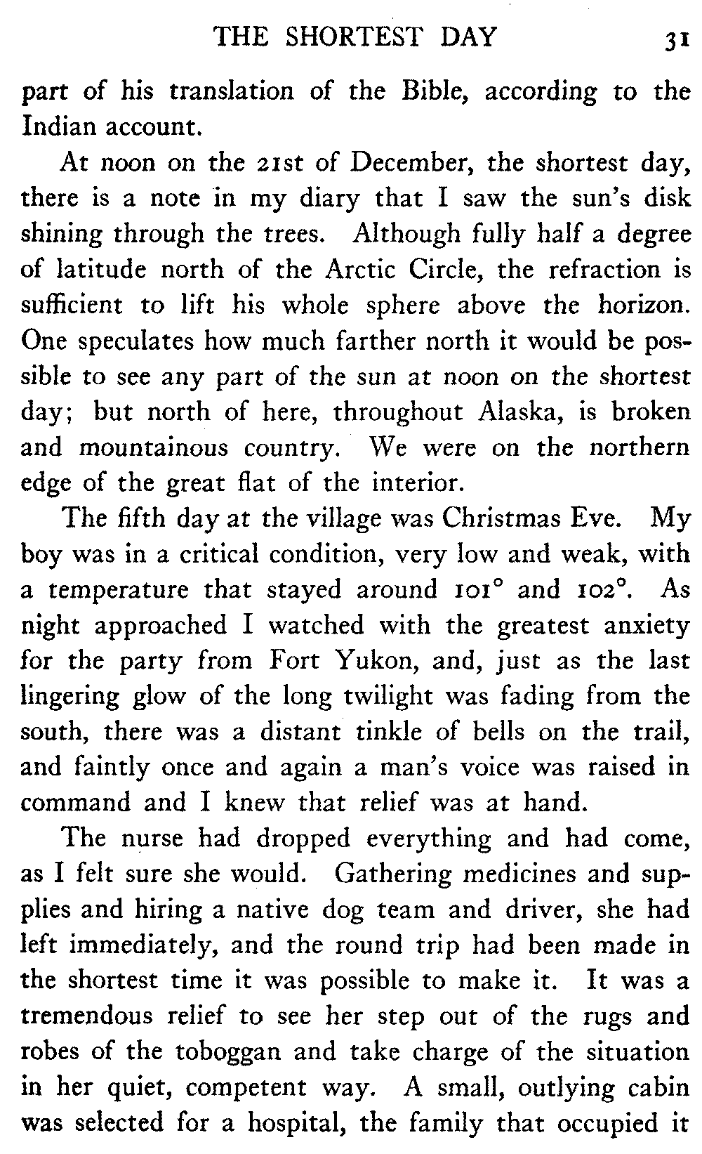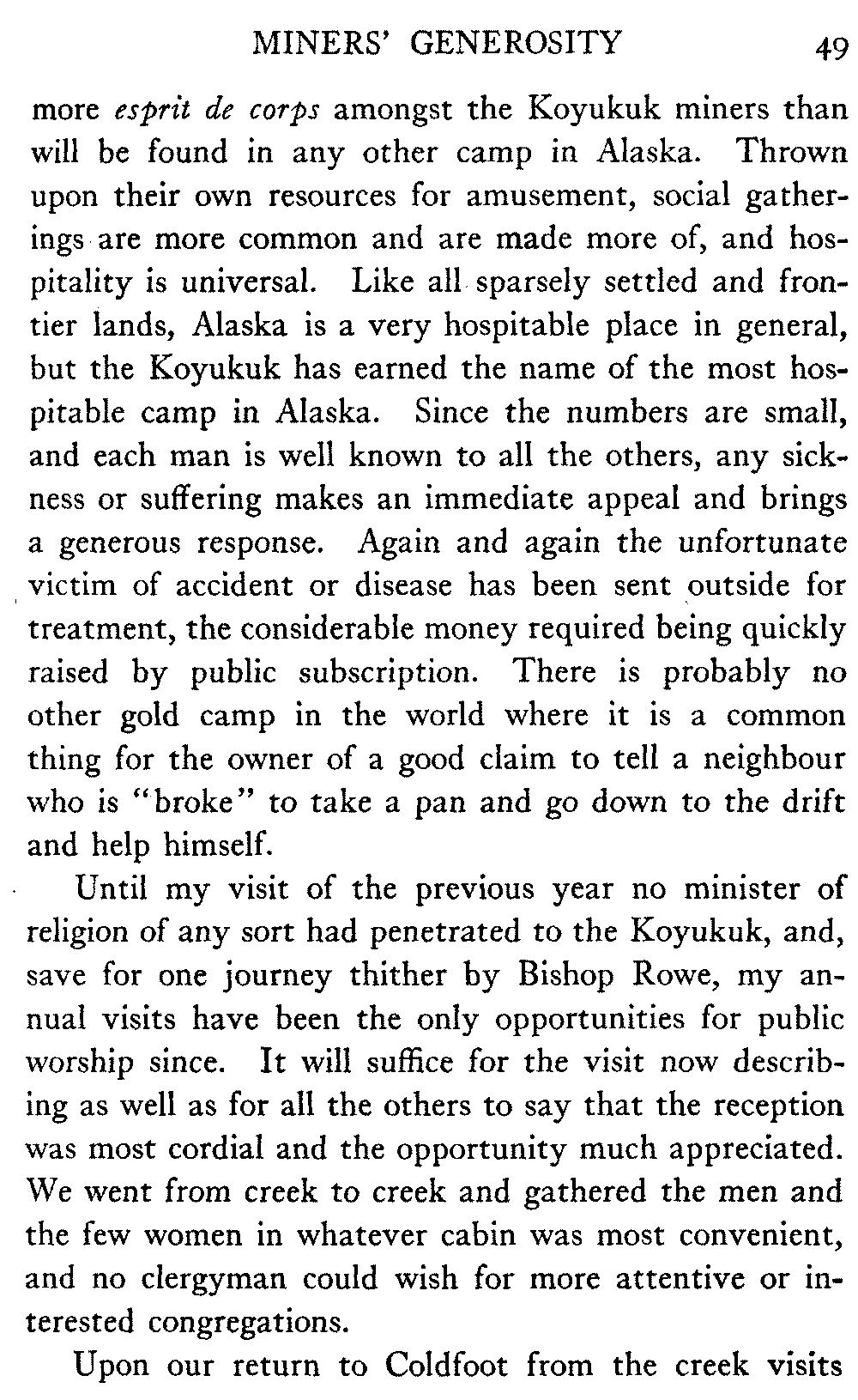 In the last two years, largely as the result of the untiring efforts of Bishop Rowe on behalf of the natives, two modern, well-equipped hospitals have been built, with money that he and his clergy have gathered, on the Yukon River, one at Fort Yukon and one at Tanana; and these are the only places of any kind, on nearly a thousand miles of the river, where sick or injured Indians may be received and cared for.
