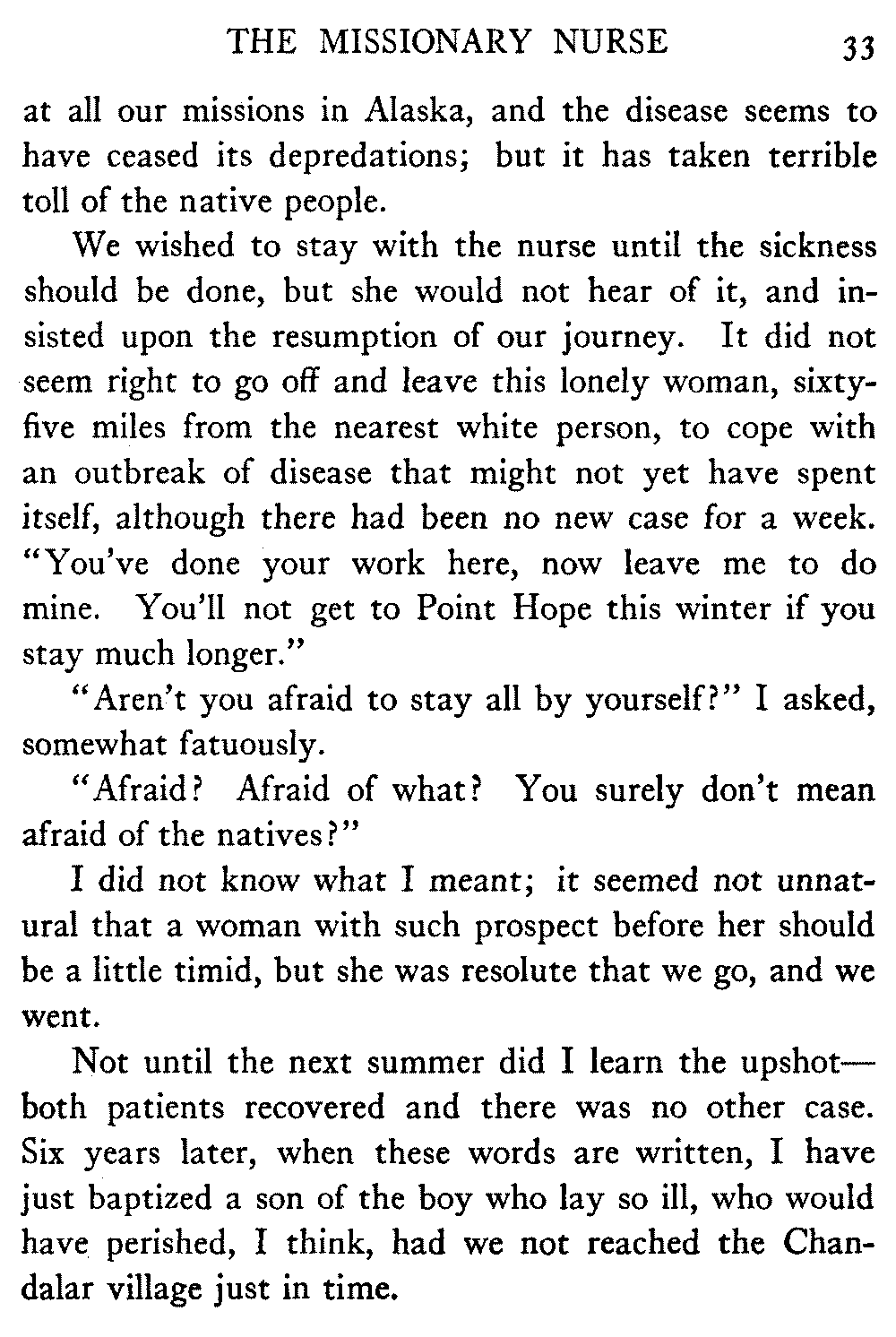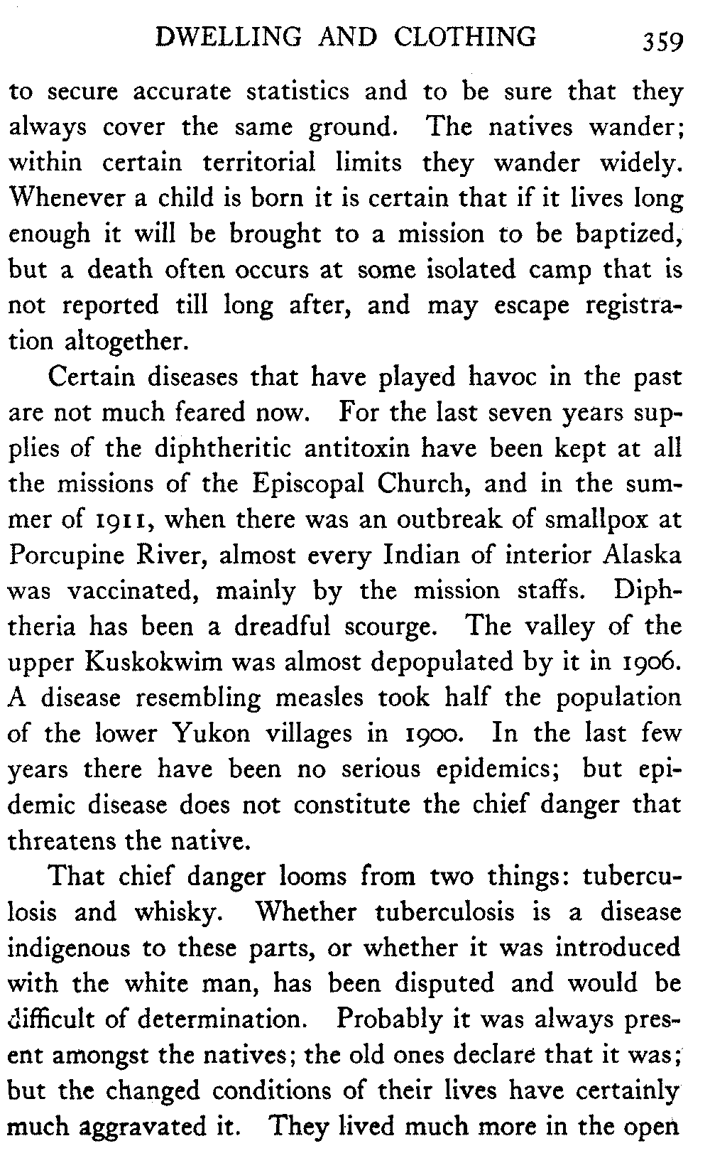 Whatever the future may hold for the interior of Alaska, the author is convinced that its population will derive very largely from the present native stocks, and this alone would justify any efforts to prevent further inroads upon their health and vitality.